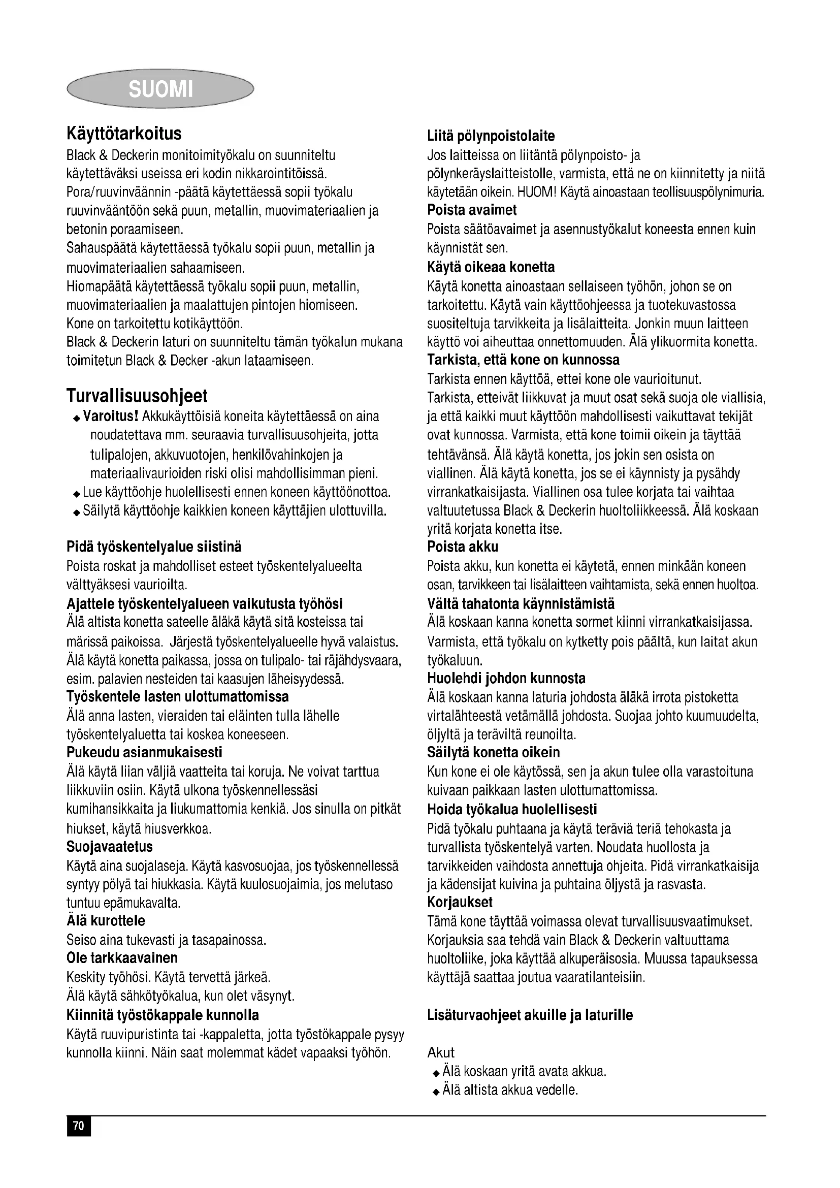 Colin Wills Director of Engineering BDCI, 4/F, 2 Dai Wang Street Tai Po Industrial Estate Tai Po NT, Hong Kong Reservedele / reparationer Reservedele kan købes hos autoriserede Black & Decker serviceværksteder, som giver forslag til omkostninger og reparerer vore produkter. Oversigt over vore autoriserede værksteder findes på internettet på vor hjemmeside www.blackdecker.dk samt www.2helpU.com. Garanti Black & Decker garanterer, at produktet er fri for materielle skader og/eller fabrikations- fejl ved levering til kunden. Garantien er et tillæg til konsumentens lovlige rettigheder og påvirker ikke disse. Garantien gælder indenfor medlemsstaterne af den Europæiske Union og i det Europæiske Frihandelsområde. Hvis et Black & Decker produkt går i stykker på grund af materiel skade og/eller fabrikationsfejl eller på anden måde ikke fungerer i overensstemmelse med specifikationen, inden for 24 måneder fra købsdatoen, påtager Black & Decker sig at reparere eller ombytte produktet med mindst muligt besvær for kunden. Garantien gælder ikke for fejl og mangler, der er sket i forbindelse med: ◆ normal slitage ◆ uheldige følger efter unormal anvendelse af værktøjet ◆ overbelastning, hærværk eller overdrevent intensivt brug af værktøjet ◆ ulykkeshændelse Garantien gælder ikke hvis reparationer er udført af nogen anden end et autoriseret Black & Decker værksted. For at udnytte garantien skal produktet og købskvitteringen indleveres til forhandleren eller til et autoriseret værksted, senest 2 måneder efter at fejlen opdages. For information om nærmeste autoriserede værksted: kontakt det lokale Black & Decker kontor på den adresse som er opgivet i brugsanvisningen. Liste over alle autoriserede Black & Decker serviceværksteder samt servicevilkår er tilgængelig på internettet, på adressen www.2helpU.com.70 SUOMI Käyttötarkoitus Black & Deckerin monitoimityökalu on suunniteltu käytettäväksi useissa eri kodin nikkarointitöissä. Pora/ruuvinväännin -päätä käytettäessä sopii työkalu ruuvinvääntöön sekä puun, metallin, muovimateriaalien ja betonin poraamiseen. Sahauspäätä käytettäessä työkalu sopii puun, metallin ja muovimateriaalien sahaamiseen. Hiomapäätä käytettäessä työkalu sopii puun, metallin, muovimateriaalien ja maalattujen pintojen hiomiseen. Kone on tarkoitettu kotikäyttöön. Black & Deckerin laturi on suunniteltu tämän työkalun mukana toimitetun Black & Decker -akun lataamiseen. Turvallisuusohjeet ◆ Varoitus! Akkukäyttöisiä koneita käytettäessä on aina noudatettava mm. seuraavia turvallisuusohjeita, jotta tulipalojen, akkuvuotojen, henkilövahinkojen ja materiaalivaurioiden riski olisi mahdollisimman pieni. ◆ Lue käyttöohje huolellisesti ennen koneen käyttöönottoa. ◆ Säilytä käyttöohje kaikkien koneen käyttäjien ulottuvilla. Pidä työskentelyalue siistinä Poista roskat ja mahdolliset esteet työskentelyalueelta välttyäksesi vaurioilta. Ajattele työskentelyalueen vaikutusta työhösi Älä altista konetta sateelle äläkä käytä sitä kosteissa tai märissä paikoissa. Järjestä työskentelyalueelle hyvä valaistus. Älä käytä konetta paikassa, jossa on tulipalo- tai räjähdysvaara, esim. palavien nesteiden tai kaasujen läheisyydessä. Työskentele lasten ulottumattomissa Älä anna lasten, vieraiden tai eläinten tulla lähelle työskentelyaluetta tai koskea koneeseen. Pukeudu asianmukaisesti Älä käytä liian väljiä vaatteita tai koruja. Ne voivat tarttua liikkuviin osiin. Käytä ulkona työskennellessäsi kumihansikkaita ja liukumattomia kenkiä. Jos sinulla on pitkät hiukset, käytä hiusverkkoa. Suojavaatetus Käytä aina suojalaseja. Käytä kasvosuojaa, jos työskennellessä syntyy pölyä tai hiukkasia. Käytä kuulosuojaimia, jos melutaso tuntuu epämukavalta. Älä kurottele Seiso aina tukevasti ja tasapainossa. Ole tarkkaavainen Keskity työhösi. Käytä tervettä järkeä. Älä käytä sähkötyökalua, kun olet väsynyt. Kiinnitä työstökappale kunnolla Käytä ruuvipuristinta tai -kappaletta, jotta työstökappale pysyy kunnolla kiinni. Näin saat molemmat kädet vapaaksi työhön. Liitä pölynpoistolaite Jos laitteissa on liitäntä pölynpoisto- ja pölynkeräyslaitteistolle, varmista, että ne on kiinnitetty ja niitä käytetään oikein. HUOM! Käytä ainoastaan teollisuuspölynimuria. Poista avaimet Poista säätöavaimet ja asennustyökalut koneesta ennen kuin käynnistät sen. Käytä oikeaa konetta Käytä konetta ainoastaan sellaiseen työhön, johon se on tarkoitettu. Käytä vain käyttöohjeessa ja tuotekuvastossa suositeltuja tarvikkeita ja lisälaitteita. Jonkin muun laitteen käyttö voi aiheuttaa onnettomuuden. Älä ylikuormita konetta. Tarkista, että kone on kunnossa Tarkista ennen käyttöä, ettei kone ole vaurioitunut. Tarkista, etteivät liikkuvat ja muut osat sekä suoja ole viallisia, ja että kaikki muut käyttöön mahdollisesti vaikuttavat tekijät ovat kunnossa. Varmista, että kone toimii oikein ja täyttää tehtävänsä. Älä käytä konetta, jos jokin sen osista on viallinen. Älä käytä konetta, jos se ei käynnisty ja pysähdy virrankatkaisijasta. Viallinen osa tulee korjata tai vaihtaa valtuutetussa Black & Deckerin huoltoliikkeessä. Älä koskaan yritä korjata konetta itse. Poista akku Poista akku, kun konetta ei käytetä, ennen minkään koneen osan, tarvikkeen tai lisälaitteen vaihtamista, sekä ennen huoltoa. Vältä tahatonta käynnistämistä Älä koskaan kanna konetta sormet kiinni virrankatkaisijassa. Varmista, että työkalu on kytketty pois päältä, kun laitat akun työkaluun. Huolehdi johdon kunnosta Älä koskaan kanna laturia johdosta äläkä irrota pistoketta virtalähteestä vetämällä johdosta. Suojaa johto kuumuudelta, öljyltä ja teräviltä reunoilta. Säilytä konetta oikein Kun kone ei ole käytössä, sen ja akun tulee olla varastoituna kuivaan paikkaan lasten ulottumattomissa. Ho