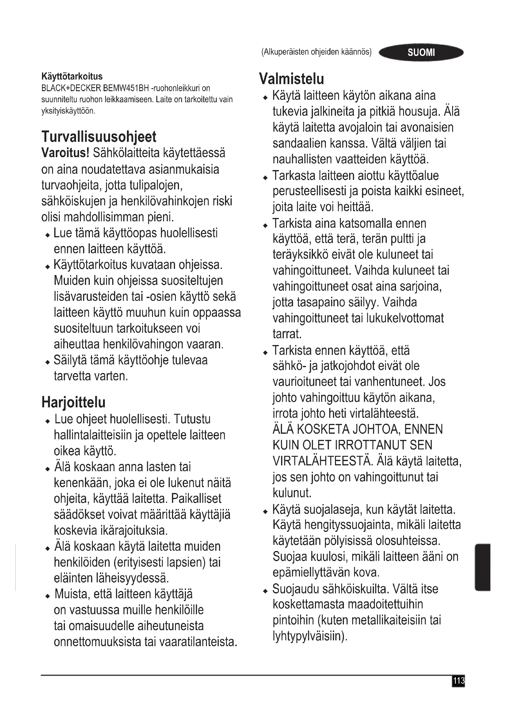 VIRTALÄHTEESTÄ. Älä käytä laitetta, jos sen johto on vahingoittunut tai kulunut. u Käytä suojalaseja, kun käytät laitetta. Käytä hengityssuojainta, mikäli laitetta käytetään pölyisissä olosuhteissa. Suojaa kuulosi, mikäli laitteen ääni on epämiellyttävän kova. u Suojaudu sähköiskuilta. Vältä itse koskettamasta maadoitettuihin pintoihin (kuten metallikaiteisiin tai lyhtypylväisiin).114 (Alkuperäisten ohjeiden käännös) SUOMI Käyttö u Älä koskaan käytä laitetta ilman asianmukaisia suojia tai turvalaitteita. u Käytä laitetta vain päivänvalossa tai hyvin valaistulla alueella. u Älä jätä laitetta sateeseen. Älä käytä laitetta sateessa tai kosteissa tai märissä olosuhteissa. Laitteen käyttämistä märällä nurmikolla ei suositella. u Varmista tukeva jalansija etenkin rinteissä. Muista, että juuri leikattu ruoho on kosteaa ja liukasta. Älä työskentele jyrkissä rinteissä. u Työskentele rinteen korkeussuuntaan nähden poikittain, älä koskaan ylhäältä alas tai päinvastoin. Toimi erityisen huolellisesti, kun laitteen suuntaa muutetaan rinteessä. u Älä työskentele liian jyrkissä rinteissä.u Käytä laitetta aina kävellen. Älä juokse. Älä vedä laitetta itseäsi kohti tai kävele takaperin laitetta käyttäessäsi. u Käynnistä laite ohjeiden mukaan. Varmista, että jalkasi ovat riittävän kaukana terästä. u Älä käynnistä laitetta, kun seisot poistoaukon edessä. u Älä kallista laitetta käynnistyksen yhteydessä, mikäli se ei ole tarpeen. Jos laitetta on kallistettava käynnistettäessä, kallista sitä mahdollisimman vähän. Nosta vain laitteen kauimpana käyttäjästä olevaa puolta. Varmista, että molemmat kätesi ovat käyttöasennossa ennen laitteen laskemista alas. u Sammuta laite ja odota, kunnes teräosan pyöriminen lakkaa, mikäli laitetta on kallistettava, kun sitä siirretään muilla alustoilla kuin ajettavalla nurmikolla. u Älä nosta tai kanna laitetta, ennen kuin terä on pysähtynyt kokonaan. u Pidä kädet ja jalat loitolla terästä. u Älä aseta käsiä tai jalkoja lähelle pyöriviä osia tai niiden alle. u Pysy loitolla laitteen poistoaukoista.u Sammuta laite, vedä pistoke irti pistorasiasta ja varmista, että laitteen liikkuvat osat ovat pysähtyneet, ennen kuin jätät laitteen ilman valvontaa, ja ennen sen osien vaihtamista, puhdistamista tai tarkistamista tai tukoksen poistamista. Kun ruohonleikkuri on osunut johonkin, tarkista laite vahinkojen varalta ja korjaa se, ennen kuin käynnistät sen ja käytät sitä uudelleen. u Jos laite tärisee epätavallisen voimakkaasti tai jos osut sillä esteeseen, sammuta laite ja vedä pistoke irti pistorasiasta. Tarkista laite vahinkojen varalta, vaihda tai korjaa vahingoittuneet osat ja kiristä mahdollisesti löystyneet osat. u Pidä verkkovirtajohto aina mahdollisimman kaukana terästä. Ota huomioon virtajohdon asento aina laitetta käytettäessä. u Moottori pyörii vielä muutaman sekunnin virran katkaisemisen jälkeen.115 (Alkuperäisten ohjeiden käännös) SUOMI Älä jarruta terän pysähtymisliikettä. Huolto ja varastointi u Tarkista ennen laitteen käyttöä, ettei laitteessa ole vahingoittuneita tai viallisia osia. Tarkista, että liikkuvat osat toimivat moitteettomasti eivätkä ole väärässä asennossa ja että työkalussa ei ole murtuneita tai vahingoittuneita suojia tai kytkimiä tai muita osia, jotka saattaisivat vaikuttaa haitallisesti laitteen toimintaan. Varmista, että laite toimii oikein. Laitetta ei tule käyttää, jos sen suoja tai kotelo on vaurioitunut tai poistettu. Älä käytä laitetta, jos jokin sen osa on vahingoittunut tai viallinen. Älä käytä laitetta, jota ei voida käynnistää ja pysäyttää virtakytkimestä. Korjauta tai vaihdata vaurioituneet tai vialliset osat valtuutetussa huoltoliikkeessä. u Tarkista virtajohdon kunto säännöllisesti. Jos virtajohto vahingoittuu, sen vaihtaminen tulee turvallisuussyistä jättää valtuutetun huoltoliikkeen tehtäväksi. Tarkista jatkojohtojen kunto säännöllisesti. Vaihda vaurioitunut sähköjohto heti. u Turvallisuussyistä tulee varmistaa, että kaikki laitteen mutterit, pultit ja ruuvit on kiristetty. u Tarkista keräyssäiliö kulumisen tai mahdollisten vaurioiden varalta ja vaihda se tarvittaessa. Älä koskaan käytä laitetta ilman keräyssäiliötä. u Varo laitetta säädettäessä, että sormesi eivät jää liikkuvien terien ja kiinteästi asennettujen osien väliin. u Muista teriä huollettaessa, että vaikka virtalähde on sammutettu, terät liikkuvat edelleen. u Kun laitetta ei käytetä, se on säilytettävä kuivassa paikassa. Pidä laite lasten ulottumattomissa. u Anna laitteen aina jäähtyä ennen varastointia. u Varmista, että laitteessa käytetään vain oikeanlaisia teriä. u Käytä ainoastaan BLACK+DECKERin suosittelemia varaosia ja lisävarusteita. Ruohonleikkurien lisäturvaohjeet u Käytä aina oikeanlaista jatkojohtoa, joka sopii tämän laitteen virransyöttöliitäntään (katso kohta Tekniset tiedot). Jatkojohdon on oltava ulkokäyttöön soveltuva ja siinä on oltava soveltuvuudesta ilmoittava merkintä. Laitteen kanssa voidaan käyttää enintään 30 m pitkää 1,5 mm2:n HO5VV-F-jatkojohtoa ilman tehon heikkenemistä. Tarkista jatkojohdon kunto ennen sen käyttämistä. Vahingoittunut tai viallinen kaapeli on vaihdettava. Jos käytät johtokelaa, kelaa johto aina kokonaan auki. u Konetta ei saa kuljettaa virran ollessa päällä. u Pidä ruohonleikkuria työntöaisasta tukevasti molemmin käsin käytön aikana.116 (Alkuperäisten ohjeiden käännös) SUOMI u Jos joudut käytön aikana kallistamaan ruohonleikkuria, pidä molemmat kädet koko ajan ajoasennossa. Pidä molemmat kädet ajoasennossa niin kauan, kunnes ruohonleikkuri on jälleen normaaliasennossa. u Älä käytä radiota tai kuulokkeita ruohonleikkurin käytön aikana. u Älä koskaan säädä pyörien korkeutta moottorin käydessä tai turva-avaimen olless