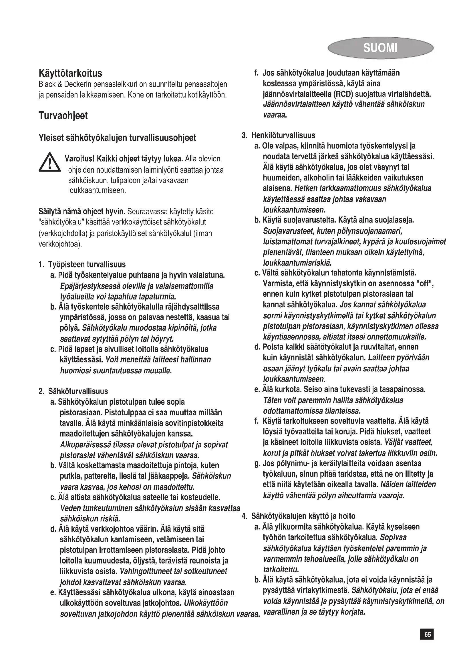 a. Älä ylikuormita sähkötyökalua. Käytä kyseiseen työhön tarkoitettua sähkötyökalua. Sopivaa sähkötyökalua käyttäen työskentelet paremmin ja varmemmin tehoalueella, jolle sähkötyökalu on tarkoitettu. b. Älä käytä sähkötyökalua, jota ei voida käynnistää ja pysäyttää virtakytkimestä. Sähkötyökalu, jota ei enää voida käynnistää ja pysäyttää käynnistyskytkimellä, on vaarallinen ja se täytyy korjata.66 SUOMI c. Irrota pistotulppa pistorasiasta, ennen kuin suoritat säätöjä, vaihdat tarvikkeita tai siirrät sähkötyökalun varastoitavaksi. Nämä turvatoimenpiteet laskevat sähkötyökalun tahatonta käynnistysriskiä. d. Säilytä sähkötyökalut poissa lasten ulottuvilta, kun niitä ei käytetä. Älä anna sellaisten henkilöiden käyttää sähkötyökalua, jotka eivät tunne sitä tai jotka eivät ole lukeneet tätä käyttöohjetta. Sähkötyökalut ovat vaarallisia, jos niitä käyttävät kokemattomat henkilöt. e. Hoida sähkötyökalusi huolella. Tarkista, että liikkuvat osat toimivat moitteettomasti, eivätkä ole puristuksessa ja että työkalussa ei ole murtuneita tai vahingoittuneita osia, jotka saattaisivat vaikuttaa haitallisesti sen toimintaan. Korjauta mahdolliset viat ennen käyttöönottoa. Moni tapaturma aiheutuu huonosti huolletuista laitteista. f. Pidä leikkausterät terävinä ja puhtaina. Huolellisesti hoidetut leikkaustyökalut, joiden terät ovat teräviä, eivät tartu helposti kiinni ja niitä on helpompi hallita. g. Käytä sähkötyökaluja, tarvikkeita, vaihtotyökaluja jne. näiden ohjeiden mukaisesti. Ota tällöin huomioon työolosuhteet ja suoritettava toimenpide. Sähkötyökalun käyttö muuhun kuin tarkoituksenmukaiseen käyttöön saattaa johtaa vaarallisiin tilanteisiin.