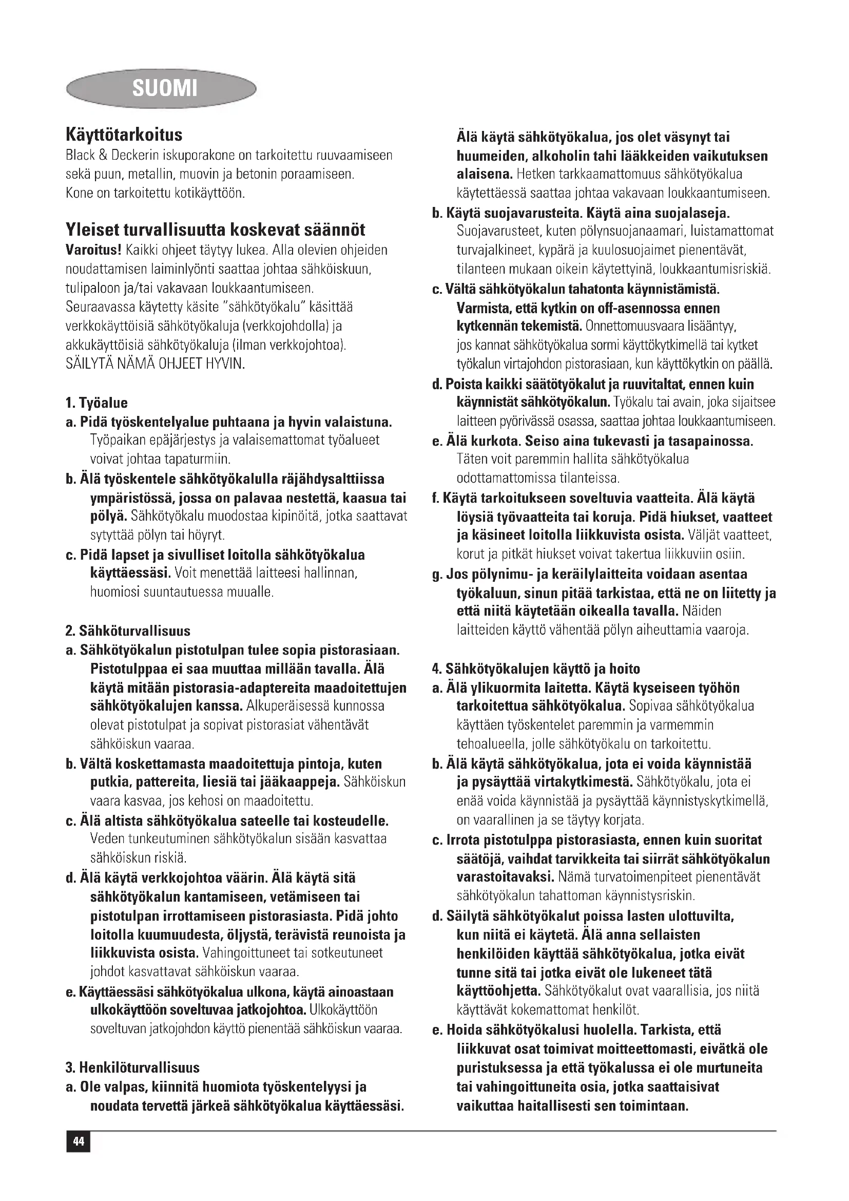 (akustisen tehon epävarmuus) 3 dB(A) Kevin Hewitt Director of Consumer Engineering Spennymoor, County Durham DL16 6JG, Iso-Britannia 1-9-2005 Korjaukset / varaosat Mikäli koneeseen tulee vikaa, jätä se aina Black & Deckerin valtuuttamaan huoltoliikkeeseen korjattavaksi (tiedot löytyvät uusimmasta tuoteluettelostamme tai ottamalla yhteyttä Black & Decker Oy:hyn). Varaosia myyvät valtuutetut Black & Deckerin huoltoliikkeet, ja heiltä voi myös pyytää kustannusarvion koneen korjauksesta. Tiedot valtuutetuista huoltoliikkeistä löytyvät myös internetistä osoitteesta www.2helpU.com sekä kotisivultamme www.blackdecker.fi. Takuu Black & Decker Oy takaa, ettei koneessa ollut materiaali- ja/ tai valmistusvikaa silloin, kun se toimitettiin ostajalle. Takuu on lisäys kuluttajan laillisiin oikeuksiin eikä vaikuta niihin. Takuu on voimassa Euroopan Unionin jäsenmaissa ja Euroopan vapaakauppa-alueella (EFTA). Mikäli Black & Decker -kone hajoaa materiaali- ja/tai valmistusvirheen tai teknisten tietojen epätarkkuuden vuoksi 24 kk:n kuluessa ostopäivästä, Black & Decker korjaa koneen ilman kustannuksia ostajalle tai vaihtaa sen uuteen Black & Decker Oy:n valinnan mukaan. Takuu ei kata vikoja, jotka johtuvat koneen ◆ normaalista kulumisesta ◆ ylikuormituksesta, virheellisestä käytöstä tai hoidosta ◆ vahingoittamisesta vieraalla esineellä tai aineella tai onnettomuustapauksessa. Takuu ei ole voimassa, mikäli konetta on korjannut joku muu kuin Black & Deckerin valtuuttama huoltoliike. Edellytyksenä takuun saamiselle on, että ostaja jättää koneen ja ostokuitin jälleenmyyjälle tai valtuutetulle huoltoliikkeelle viimeistään 2 kuukauden kuluessa vian ilmenemisestä. Tiedot valtuutetuista huoltoliikkeistä saa ottamalla yhteyttä Black & Decker Oy:hyn sekä internetistä osoitteesta www.2helpU.com, jossa on myös takuuehdot. Ole hyvä ja rekisteröidy verkkosivullamme www.blackanddecker.com saadaksesi tietoja uusista tuotteista ja erikoistarjouksista. Saat lisätietoja Black & Deckerin tavaramerkistä ja tuotevalikoimastamme osoitteesta www.blackanddecker.com.48