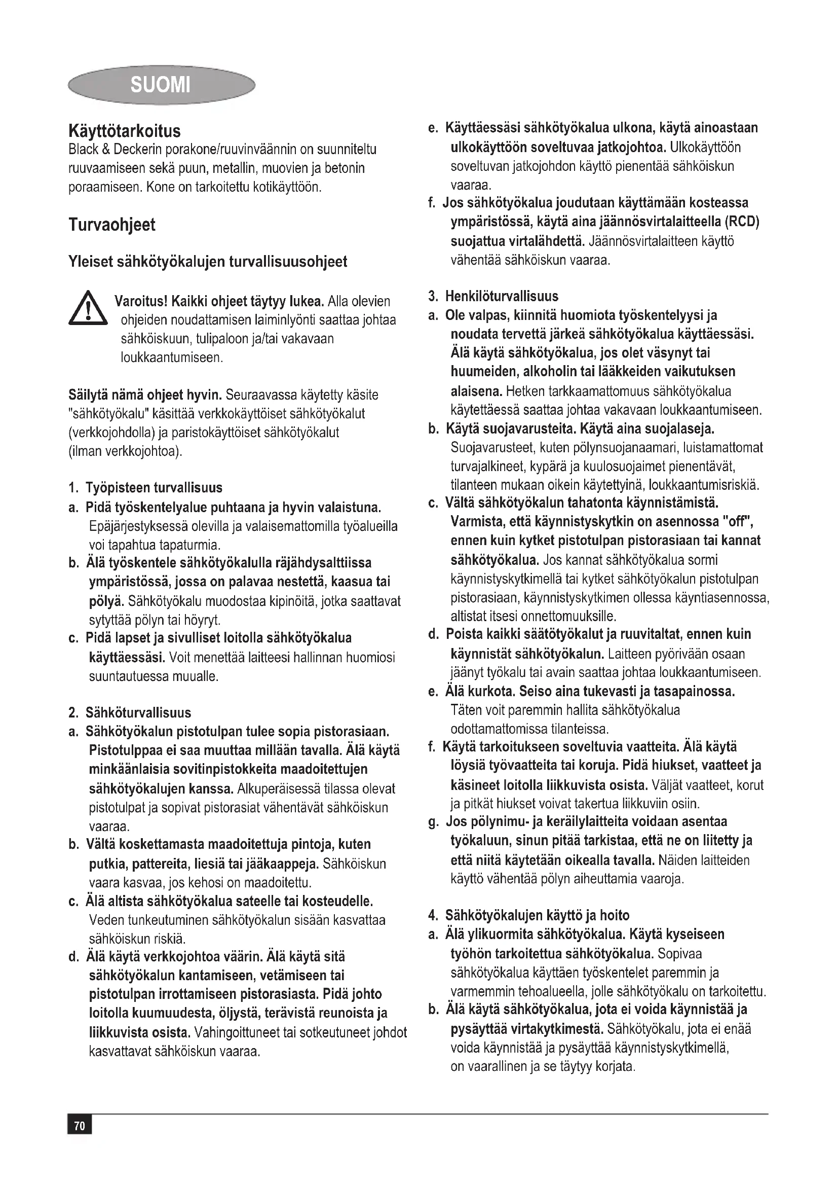 Varoitus! Kaikki ohjeet täytyy lukea. Alla olevien ohjeiden noudattamisen laiminlyönti saattaa johtaa sähköiskuun, tulipaloon ja/tai vakavaan loukkaantumiseen. Säilytä nämä ohjeet hyvin. Seuraavassa käytetty käsite "sähkötyökalu" käsittää verkkokäyttöiset sähkötyökalut (verkkojohdolla) ja paristokäyttöiset sähkötyökalut (ilman verkkojohtoa).