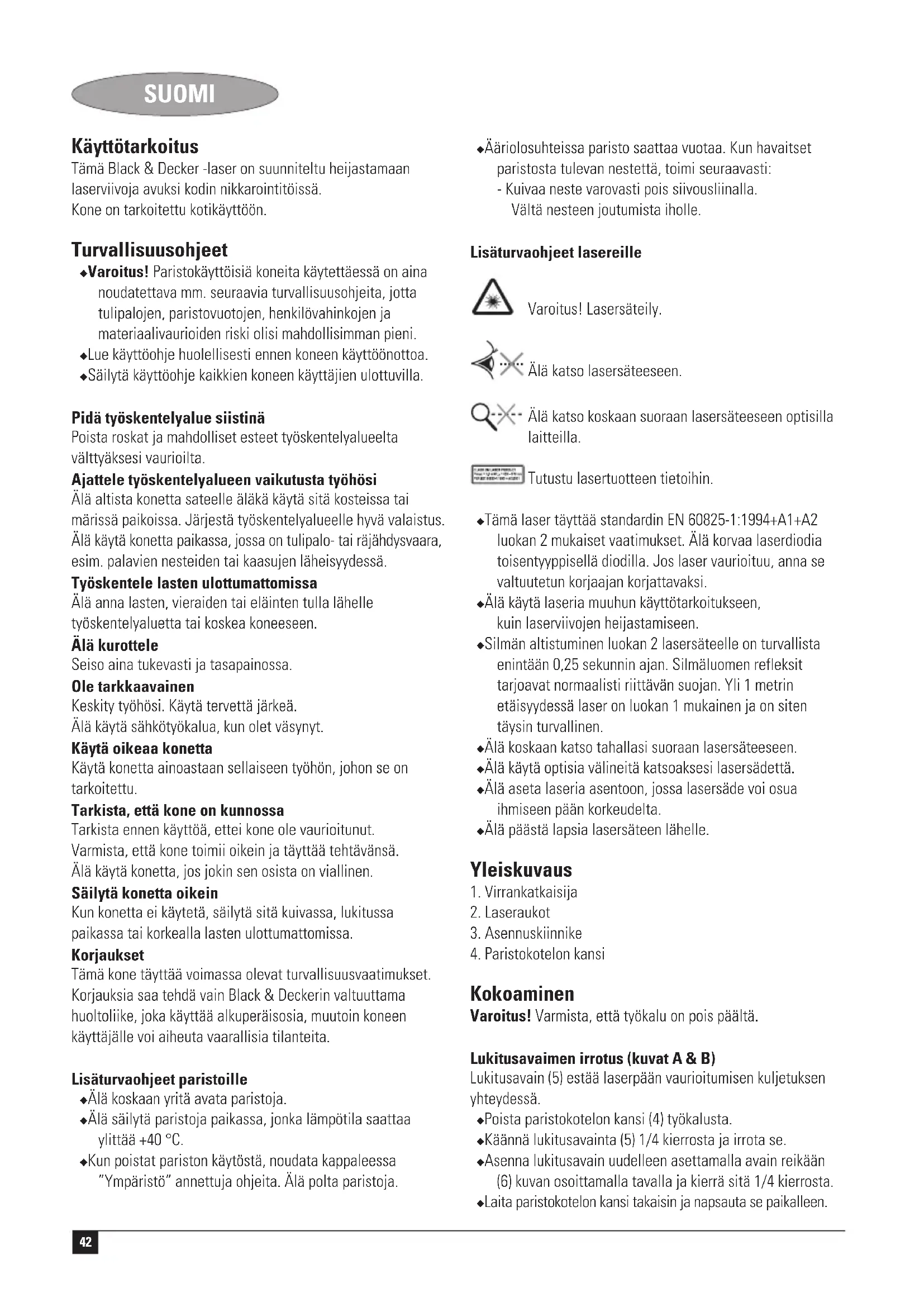Kevin Hewitt Director of Consumer Engineering Spennymoor, County Durham DL16 6JG, United Kingdom 1-12-2004 Reservedele / reparationer Reservedele kan købes hos autoriserede Black & Decker serviceværksteder, som giver forslag til omkostninger og reparerer vore produkter. Oversigt over vore autoriserede værksteder findes på internettet på vor hjemmeside www.blackanddecker.dk samt www.2helpU.com Garanti Black & Decker garanterer, at produktet er fri for materielle skader og/eller fabrikationsfejl ved levering til kunden. Garantien er et tillæg til konsumentens lovlige rettigheder og påvirker ikke disse. Garantien gælder indenfor medlemsstaterne af den Europæiske Union og i det Europæiske Frihandelsområde. Hvis et Black & Decker produkt går i stykker på grund af materiel skade og/eller fabrikationsfejl eller på anden måde ikke fungerer i overensstemmelse med specifikationen, inden for 24 måneder fra købsdatoen, påtager Black & Decker sig at reparere eller ombytte produktet med mindst muligt besvær for kunden. Garantien gælder ikke for fejl og mangler, der er sket i forbindelse med: ◆ normal slitage ◆ uheldige følger efter unormal anvendelse af værktøjet ◆ overbelastning, hærværk eller overdrevent intensivt brug af værktøjet ◆ ulykkeshændelse Garantien gælder ikke hvis reparationer er udført af nogen anden end et autoriseret Black & Decker værksted. For at udnytte garantien skal produktet og købskvitteringen indleveres til forhandleren eller til et autoriseret værksted, senest 2 måneder efter at fejlen opdages. For information om nærmeste autoriserede værksted: kontakt det lokale Black & Decker kontor på den adresse som er opgivet i brugsanvisningen. Liste over alle autoriserede Black & Decker serviceværksteder samt servicevilkår er tilgængelig på internettet, på adressen www.2helpU.com41 DANSK Gå venligst ind på vores website www.blackanddecker.dk for at registrere dit nye produkt og for at blive holdt ajour om nye produkter og specialtilbud. Der findes yderligere oplysninger om mærket Black & Decker og vores produktsortiment på adressen www.blackanddecker.dk42 SUOMI Käyttötarkoitus Tämä Black & Decker -laser on suunniteltu heijastamaan laserviivoja avuksi kodin nikkarointitöissä. Kone on tarkoitettu kotikäyttöön. Turvallisuusohjeet ◆ Varoitus! Paristokäyttöisiä koneita käytettäessä on aina noudatettava mm. seuraavia turvallisuusohjeita, jotta tulipalojen, paristovuotojen, henkilövahinkojen ja materiaalivaurioiden riski olisi mahdollisimman pieni. ◆ Lue käyttöohje huolellisesti ennen koneen käyttöönottoa. ◆ Säilytä käyttöohje kaikkien koneen käyttäjien ulottuvilla. Pidä työskentelyalue siistinä Poista roskat ja mahdolliset esteet työskentelyalueelta välttyäksesi vaurioilta. Ajattele työskentelyalueen vaikutusta työhösi Älä altista konetta sateelle äläkä käytä sitä kosteissa tai märissä paikoissa. Järjestä työskentelyalueelle hyvä valaistus. Älä käytä konetta paikassa, jossa on tulipalo- tai räjähdysvaara, esim. palavien nesteiden tai kaasujen läheisyydessä. Työskentele lasten ulottumattomissa Älä anna lasten, vieraiden tai eläinten tulla lähelle työskentelyaluetta tai koskea koneeseen. Älä kurottele Seiso aina tukevasti ja tasapainossa. Ole tarkkaavainen Keskity työhösi. Käytä tervettä järkeä. Älä käytä sähkötyökalua, kun olet väsynyt. Käytä oikeaa konetta Käytä konetta ainoastaan sellaiseen työhön, johon se on tarkoitettu. Tarkista, että kone on kunnossa Tarkista ennen käyttöä, ettei kone ole vaurioitunut. Varmista, että kone toimii oikein ja täyttää tehtävänsä. Älä käytä konetta, jos jokin sen osista on viallinen. Säilytä konetta oikein Kun konetta ei käytetä, säilytä sitä kuivassa, lukitussa paikassa tai korkealla lasten ulottumattomissa. Korjaukset Tämä kone täyttää voimassa olevat turvallisuusvaatimukset. Korjauksia saa tehdä vain Black & Deckerin valtuuttama huoltoliike, joka käyttää alkuperäisosia, muutoin koneen käyttäjälle voi aiheuta vaarallisia tilanteita. Lisäturvaohjeet paristoille ◆ Älä koskaan yritä avata paristoja. ◆ Älä säilytä paristoja paikassa, jonka lämpötila saattaa ylittää +40 °C. ◆ Kun poistat pariston käytöstä, noudata kappaleessa ”Ympäristö” annettuja ohjeita. Älä polta paristoja. ◆ Ääriolosuhteissa paristo saattaa vuotaa. Kun havaitset paristosta tulevan nestettä, toimi seuraavasti: - Kuivaa neste varovasti pois siivousliinalla. Vältä nesteen joutumista iholle. Lisäturvaohjeet lasereille Varoitus! Lasersäteily. Älä katso lasersäteeseen. Älä katso koskaan suoraan lasersäteeseen optisilla laitteilla. Tutustu lasertuotteen tietoihin. ◆ Tämä laser täyttää standardin EN 60825-1:1994+A1+A2 luokan 2 mukaiset vaatimukset. Älä korvaa laserdiodia toisentyyppisellä diodilla. Jos laser vaurioituu, anna se valtuutetun korjaajan korjattavaksi. ◆ Älä käytä laseria muuhun käyttötarkoitukseen, kuin laserviivojen heijastamiseen. ◆ Silmän altistuminen luokan 2 lasersäteelle on turvallista enintään 0,25 sekunnin ajan. Silmäluomen refleksit tarjoavat normaalisti riittävän suojan. Yli 1 metrin etäisyydessä laser on luokan 1 mukainen ja on siten täysin turvallinen. ◆ Älä koskaan katso tahallasi suoraan lasersäteeseen. ◆ Älä käytä optisia välineitä katsoaksesi lasersädettä. ◆ Älä aseta laseria asentoon, jossa lasersäde voi osua ihmiseen pään korkeudelta. ◆ Älä päästä lapsia lasersäteen lähelle. Yleiskuvaus