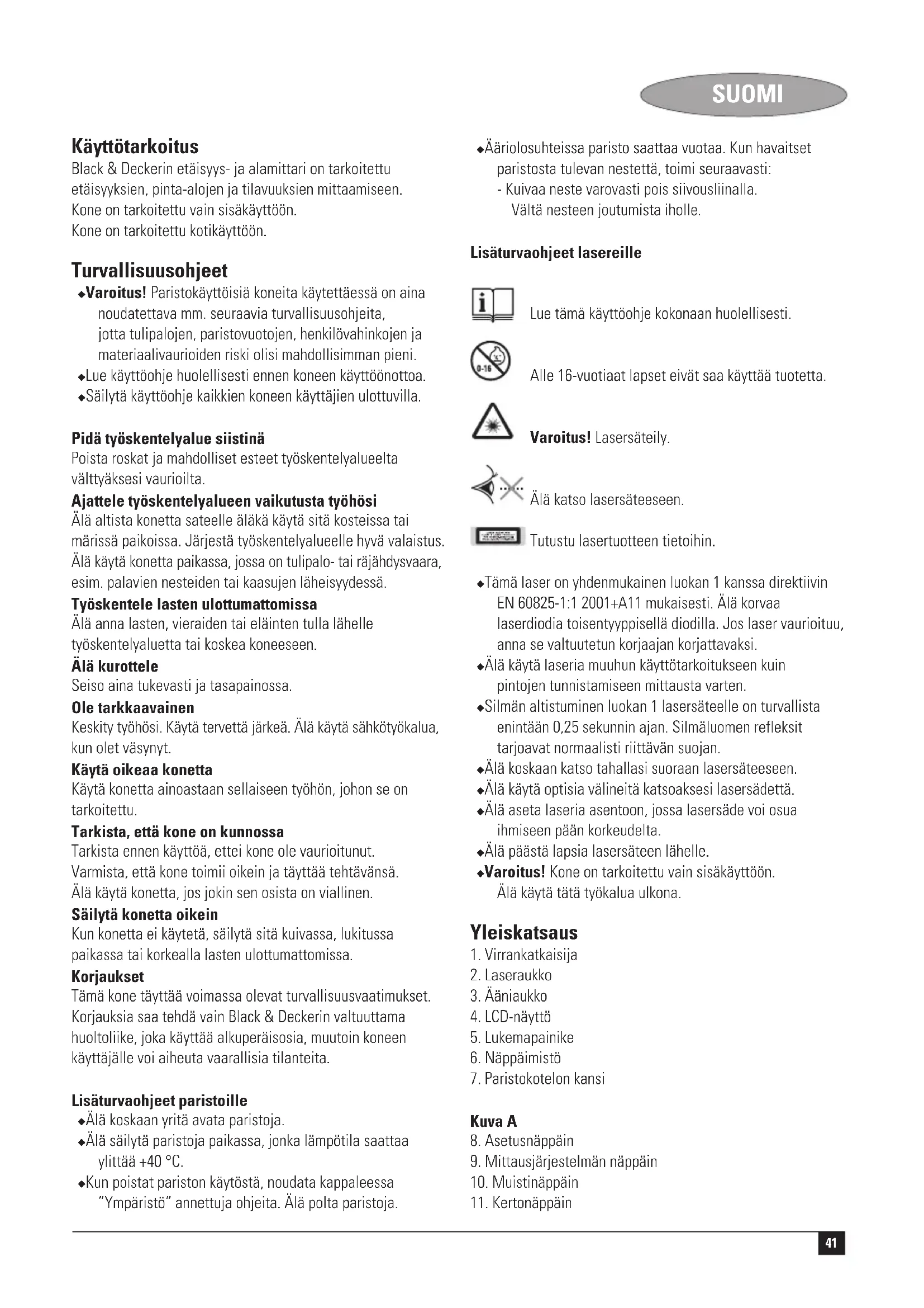 Kokoaminen Pariston asettaminen (kuva B) ◆ Poista paristokotelon kansi (7) työkalusta. ◆ Aseta paristo koteloon. Suurempi pariston napa kytketään pienempään liittimeen. ◆ Laita suojus takaisin ja napsauta se paikalleen. Käyttö Työkalun asetukset (kuva A, C & E) Työkalu voi näyttää mitatut tulokset edestä (18) tai takaa (19). ◆ Vaihtaaksesi yhdestä mittaustavasta toiseen paina näppäintä (8). Mittapään asentaminen (kuva E) ◆ Kierrä mittapäätä. Älä aseta päätä välilliseen kulmaan, koska tällöin mittaustulokset voivat olla epätarkkoja. Mittausjärjestelmän valitseminen (kuvat A & D) Laite näyttää tulokset sekä metrisessä (16) että tuumajärjestelmässä (17). ◆ Vaihtaaksesi yhdestä mittausjärjestelmästä toiseen paina näppäintä (9). Muistitoiminto (kuvat A & D) Muistitoiminnon (20) käyttö näkyy näytössä. ◆ Paina näppäintä (14) tallentaaksesi näytössä näkyvän arvon muistiin. Arvo pysyy tallennettuna niin kauan kuin laite on päällä. ◆ Paina uudelleen näppäintä (14) tyhjentääksesi muistin. Käynnistys ja pysäytys (kuva B) ◆ Käynnistä kone painamalla virrankatkaisija (1) asentoon I. ◆ Sammuta kone painamalla virrankatkaisija (1) asentoon O. Mittaaminen (kuva A) ◆ Pidä työkalua oikeassa asennossa siten, että mittapää on suunnattu vastapäiseen pintaan. ◆ Paina näppäintä (5). Tulos näkyy näytössä (4). Huomautus: - Mittauksen aikana laserpiste auttaa havaitsemaan vastapäisen pinnan. - Jos laite ei ole aktiivinen 15 sekuntiin, LCD-näyttö pimenee. Viimeisimmät mittaustiedot eivät palaudu, ellei niitä ole tallennettu muistiin. Etäisyyksien mittaaminen (kuva A) ◆ Mittaa ensimmäinen etäisyys ◆ Paina näppäintä (12). ◆ Mittaa seuraava etäisyys ◆ Toista edellä mainittu niin monta kertaa kuin on tarpeen jäljellä olevia etäisyyksiä varten. ◆ Paina näppäintä (15). Tulos näkyy näytössä (4). Pinta-alojen mittaaminen (kuva A) ◆ Mittaa pituus. ◆ Paina näppäintä (11). ◆ Mittaa leveys. ◆ Paina näppäintä (15). Tulos näkyy näytössä (4) neliöinä. Tilavuuden mittaaminen (kuva A) ◆ Mittaa pituus. ◆ Paina näppäintä (11). ◆ Mittaa leveys. ◆ Paina näppäintä (11). ◆ Mittaa korkeus. ◆ Paina näppäintä (15). Tulos näkyy näytössä (4) kuutioina. Vinkkejä parhaimman tuloksen saamiseksi ◆ Käytä työkalua vain avoimissa tiloissa, joissa ei ole mittausta haittaavia esteitä. ◆ Älä liikuta työkalua mittauksen aikana, kunnes etäisyys näkyy näytössä. ◆ Varmistuaksesi siitä, että lukema on oikea, toista mittaus, kunnes saat vähintään 2 samaa lukemaa 3 yrityksellä. ◆ Jotta mittaus onnistuisi, on täytettävä seuraavat edellytykset: - Mitattavan kohteen pinnan on oltava litteä ja kova. - Etäisyyksien mittaaminen lasin läpi ei ole mahdollista. - Kun etäisyys on työkalun toimintasäteen ulkopuolella, työkalu antaa merkkiäänen ja rekisteröi virheen. Pariston alhaisen latauksen osoitin (kuva D) LCD-näytössä näkyy pariston alhaisen latauksen symboli (21), kun paristo on miltei tyhjä. ◆ Vaihda paristo ajoissa. Puhdistus ja huolto Black & Deckerin kone on suunniteltu toimimaan mahdollisimman pitkän aikaa mahdollisimman vähällä huollolla. Puhdista koneen kuori säännöllisesti kostealla rievulla. Älä koskaan käytä puhdistamiseen liuotinaineita tai syövyttäviä puhdistusaineita. Säilytys Kun kone ei ole käytössä, sen ja pariston tulee olla varastoituna kuivaan paikkaan lasten ulottumattomissa.43 SUOMI Ympäristö Kone Kun koneesi on käytetty loppuun, älä heitä sitä tavallisten roskien mukana pois, vaan vie se paikkakuntasi kierrätyskeskukseen tai jätä valtuutettuun Black & Deckerin huoltoliikkeeseen. Paristot Jos haluat itse poistaa koneen käytöstä, täytyy paristot irrottaa alla kuvatulla tavalla. Suojele luontoa jättämällä paristot niille tarkoitettuun keräyspaikkaan. ◆ Aseta paristot sopivaan pakkaukseen siten, etteivät navat pääse oikosulkuun. Vie paristot paikalliselle kierrätysasemalle. Tekniset tiedot BDM100 Jännite V 9 Työskentelyetäisyys m 0,61 - 12 Tarkkuus (3 metrissä) suhteellinen +/- 0,5% numerojen määrä +/- 1 Ympäröivä lämpötila °C 5 - 40 Aaltopituus nm 630-675 Laserluokka 1 Laserteho mW < 1 Paino kg 0,18 CE-vaatimustenmukaisuusvakuutus BDM100 Black & Decker vakuuttaa, että nämä työkalut ovat
