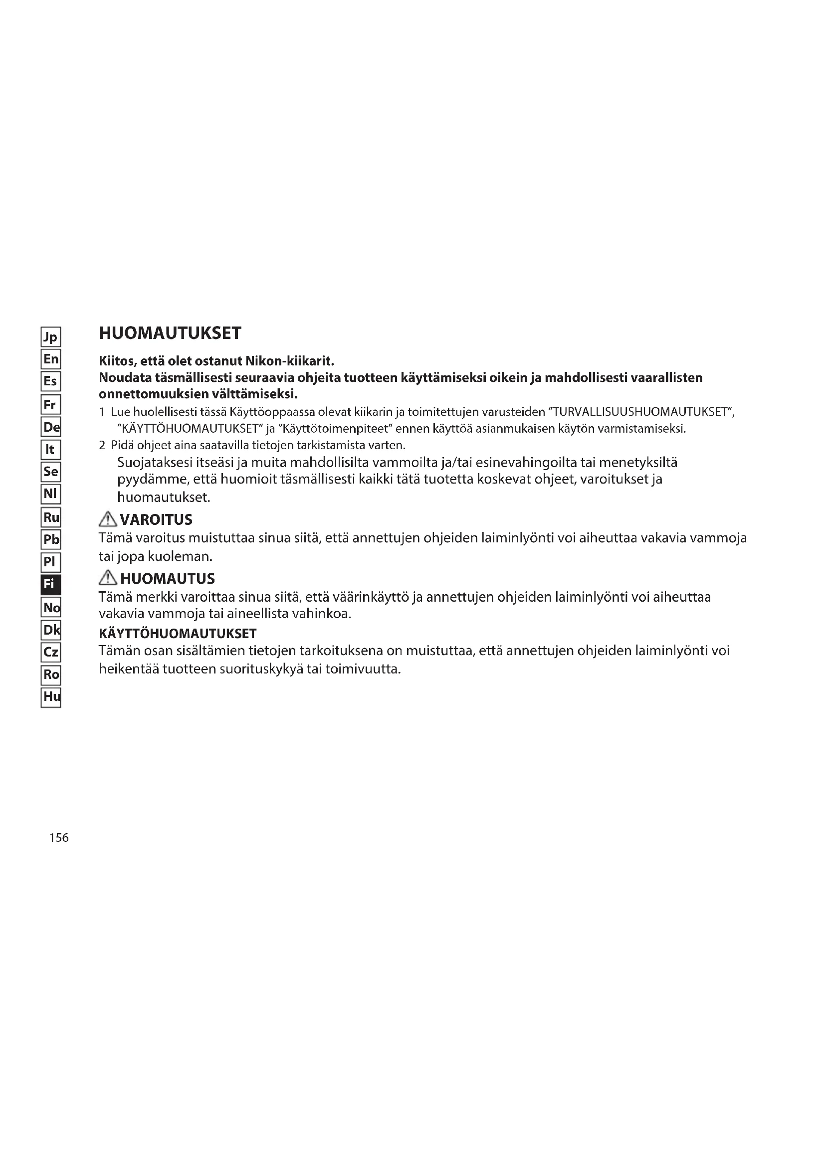 HUOMAUTUKSET Kiitos, että olet ostanut Nikon-kiikarit. Noudata täsmällisesti seuraavia ohjeita tuotteen käyttämiseksi oikein ja mahdollisesti vaarallisten onnettomuuksien välttämiseksi. 1 Lue huolellisesti tässä Käyttöoppaassa olevat kiikarin ja toimitettujen varusteiden ”TURVALLISUUSHUOMAUTUKSET”, ”KÄYTTÖHUOMAUTUKSET” ja ”Käyttötoimenpiteet” ennen käyttöä asianmukaisen käytön varmistamiseksi. 2 Pidä ohjeet aina saatavilla tietojen tarkistamista varten. Suojataksesi itseäsi ja muita mahdollisilta vammoilta ja/tai esinevahingoilta tai menetyksiltä pyydämme, että huomioit täsmällisesti kaikki tätä tuotetta koskevat ohjeet, varoitukset ja huomautukset. VAROITUS Tämä varoitus muistuttaa sinua siitä, että annettujen ohjeiden laiminlyönti voi aiheuttaa vakavia vammoja tai jopa kuoleman. HUOMAUTUS Tämä merkki varoittaa sinua siitä, että väärinkäyttö ja annettujen ohjeiden laiminlyönti voi aiheuttaa vakavia vammoja tai aineellista vahinkoa.