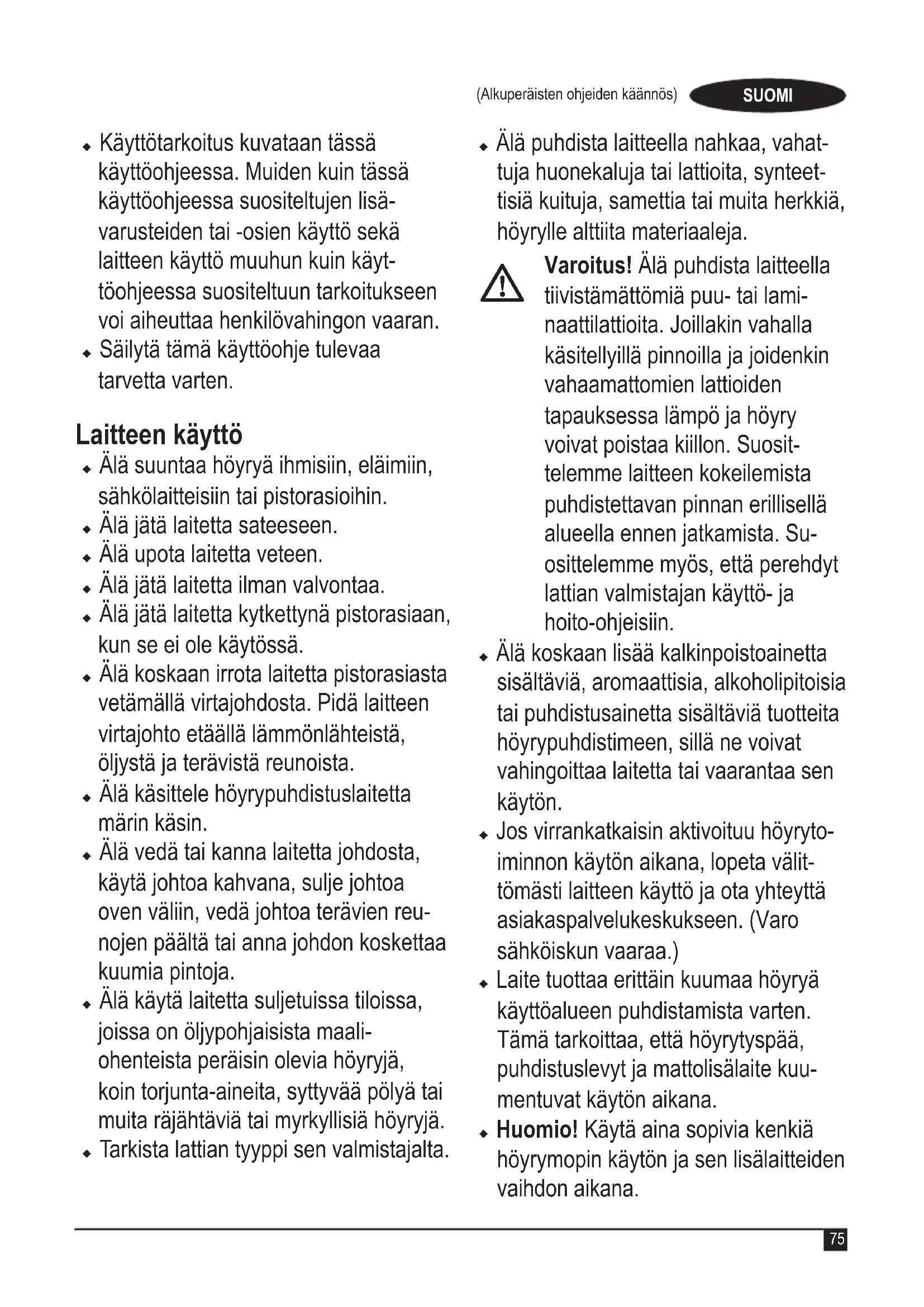 Varoitus! Sähkölaitteita käytettäessä on aina noudatet- tava asianmukaisia turvaohjeita, jotta tulipalojen, sähköiskujen, henkilövahinkojen ja materiaal- ivaurioiden riski olisi mahdol- lisimman pieni. u Lue tämä käyttöohje kokonaan huolel- lisesti ennen laitteen käyttöä.75 (Alkuperäisten ohjeiden käännös) SUOMI u Käyttötarkoitus kuvataan tässä käyttöohjeessa. Muiden kuin tässä käyttöohjeessa suositeltujen lisä- varusteiden tai -osien käyttö sekä laitteen käyttö muuhun kuin käyt- töohjeessa suositeltuun tarkoitukseen voi aiheuttaa henkilövahingon vaaran. u Säilytä tämä käyttöohje tulevaa tarvetta varten. Laitteen käyttö u Älä suuntaa höyryä ihmisiin, eläimiin, sähkölaitteisiin tai pistorasioihin. u Älä jätä laitetta sateeseen.u Älä upota laitetta veteen.u Älä jätä laitetta ilman valvontaa. u Älä jätä laitetta kytkettynä pistorasiaan, kun se ei ole käytössä. u Älä koskaan irrota laitetta pistorasiasta vetämällä virtajohdosta. Pidä laitteen virtajohto etäällä lämmönlähteistä, öljystä ja terävistä reunoista. u Älä käsittele höyrypuhdistuslaitetta märin käsin. u Älä vedä tai kanna laitetta johdosta, käytä johtoa kahvana, sulje johtoa oven väliin, vedä johtoa terävien reu- nojen päältä tai anna johdon koskettaa kuumia pintoja. u Älä käytä laitetta suljetuissa tiloissa, joissa on öljypohjaisista maali- ohenteista peräisin olevia höyryjä, koin torjunta-aineita, syttyvää pölyä tai muita räjähtäviä tai myrkyllisiä höyryjä. u Tarkista lattian tyyppi sen valmistajalta. u Älä puhdista laitteella nahkaa, vahat- tuja huonekaluja tai lattioita, synteet- tisiä kuituja, samettia tai muita herkkiä, höyrylle alttiita materiaaleja.