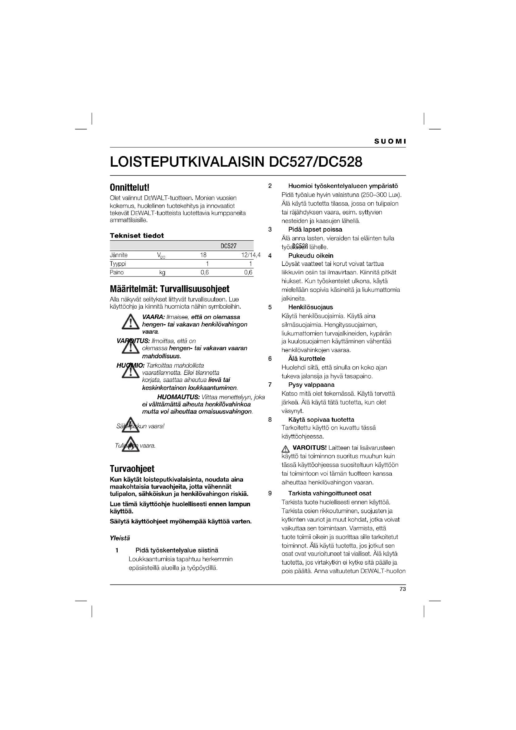 Onnittelut! Olet valinnut DEWALT-tuotteen. Monien vuosien kokemus, huolellinen tuotekehitys ja innovaatiot tekevät D EWALT-tuotteista luotettavia kumppaneita ammattilaisille. Tekniset tiedot DC527 DC528 Jännite V