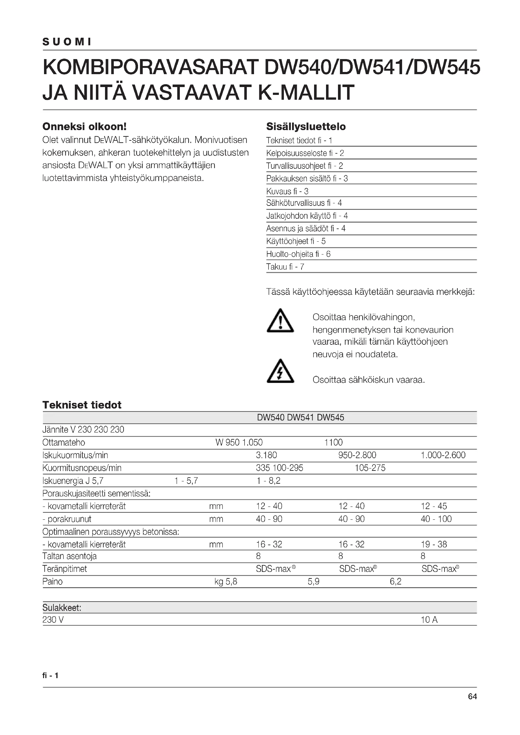 fi - 1 Onneksi olkoon! Olet valinnut DEWALT-sähkötyökalun. Monivuotisen kokemuksen, ahkeran tuotekehittelyn ja uudistusten ansiosta DEWALT on yksi ammattikäyttäjien luotettavimmista yhteistyökumppaneista. Sisällysluettelo Tekniset tiedot fi - 1 Kelpoisuusseloste fi - 2 Turvallisuusohjeet fi - 2 Pakkauksen sisältö fi - 3 Kuvaus fi - 3 Sähköturvallisuus fi - 4 Jatkojohdon käyttö fi - 4 Asennus ja säädöt fi - 4 Käyttöohjeet fi - 5 Huolto-ohjeita fi - 6 Takuu fi - 7 Tässä käyttöohjeessa käytetään seuraavia merkkejä: Osoittaa henkilövahingon, hengenmenetyksen tai konevaurion vaaraa, mikäli tämän käyttöohjeen neuvoja ei noudateta. Osoittaa sähköiskun vaaraa. Tekniset tiedot DW540 DW541 DW545 Jännite V 230 230 230 Ottamateho W 950 1.050 1100 Iskukuormitus/min 3.180 950-2.800 1.000-2.600 Kuormitusnopeus/min 335 100-295 105-275 Iskuenergia J 5,7 1 - 5,7 1 - 8,2 Porauskujasiteetti sementissä: - kovametalli kierreterät mm 12 - 40 12 - 40 12 - 45 - porakruunut mm 40 - 90 40 - 90 40 - 100 Optimaalinen poraussyvyys betonissa: - kovametalli kierreterät mm 16 - 32 16 - 32 19 - 38 Taltan asentoja 8 8 8 Teränpitimet SDS-max