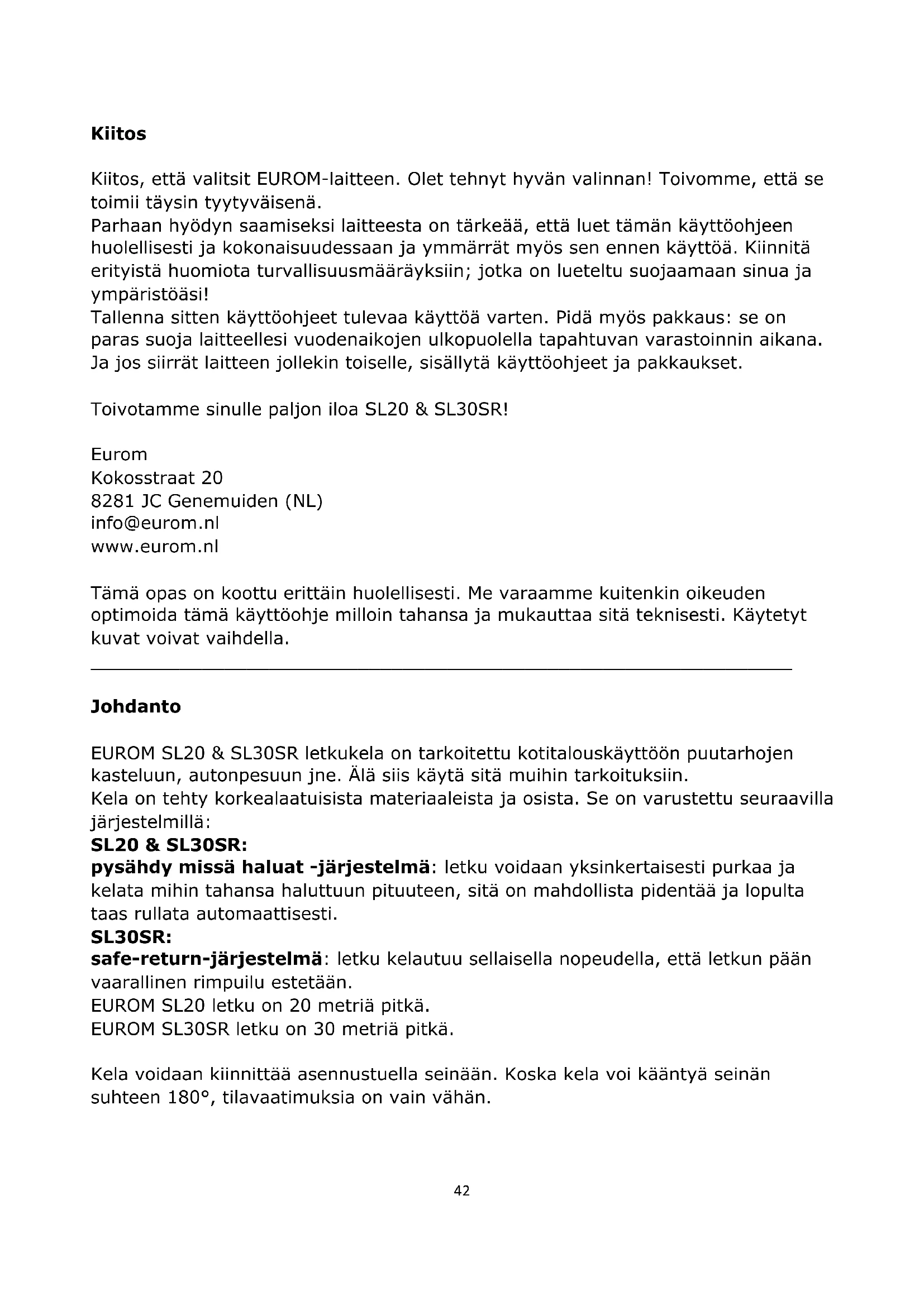 Genemuiden, 28-01-2020 W.J. Bakker, alg. dir.42 Kiitos Kiitos, että valitsit EUROM-laitteen. Olet tehnyt hyvän valinnan! Toivomme, että se toimii täysin tyytyväisenä. Parhaan hyödyn saamiseksi laitteesta on tärkeää, että luet tämän käyttöohjeen huolellisesti ja kokonaisuudessaan ja ymmärrät myös sen ennen käyttöä. Kiinnitä erityistä huomiota turvallisuusmääräyksiin; jotka on lueteltu suojaamaan sinua ja ympäristöäsi! Tallenna sitten käyttöohjeet tulevaa käyttöä varten. Pidä myös pakkaus: se on paras suoja laitteellesi vuodenaikojen ulkopuolella tapahtuvan varastoinnin aikana. Ja jos siirrät laitteen jollekin toiselle, sisällytä käyttöohjeet ja pakkaukset. Toivotamme sinulle paljon iloa SL20 & SL30SR! Eurom Kokosstraat 20 8281 JC Genemuiden (NL) info@eurom.nl www.eurom.nl Tämä opas on koottu erittäin huolellisesti. Me varaamme kuitenkin oikeuden optimoida tämä käyttöohje milloin tahansa ja mukauttaa sitä teknisesti. Käytetyt kuvat voivat vaihdella.