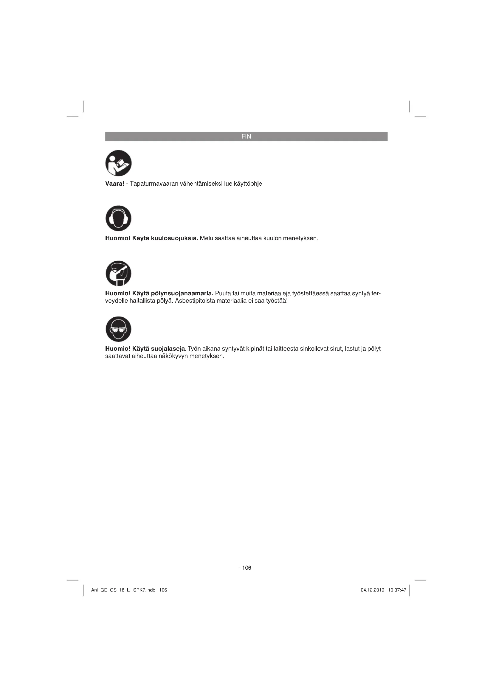 Vaara! - Tapaturmavaaran vähentämiseksi lue käyttöohje Huomio! Käytä kuulosuojuksia. Melu saattaa aiheuttaa kuulon menetyksen. Huomio! Käytä suojalaseja. Työn aikana syntyvät kipinät tai laitteesta sinkoilevat sirut, lastut ja pölyt saattavat aiheuttaa näkökyvyn menetyksen. Huomio! Käytä pölynsuojanaamaria. Puuta tai muita materiaaleja työstettäessä saattaa syntyä ter- veydelle haitallista pölyä. Asbestipitoista materiaalia ei saa työstää! Anl_GE_GS_18_Li_SPK7.indb 106Anl_GE_GS_18_Li_SPK7.indb 106 04.12.2019 10:37:4704.12.2019 10:37:47FIN