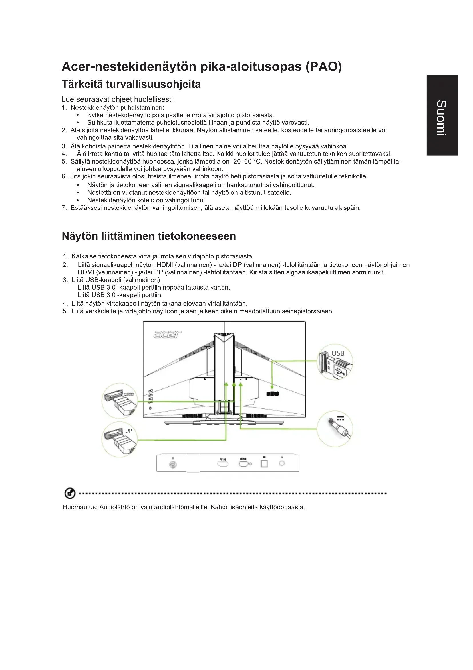 USB Huomautus: Audiolähtö on vain audiolähtömalleille. Katso lisäohjeita käyttöoppaasta.Suomi