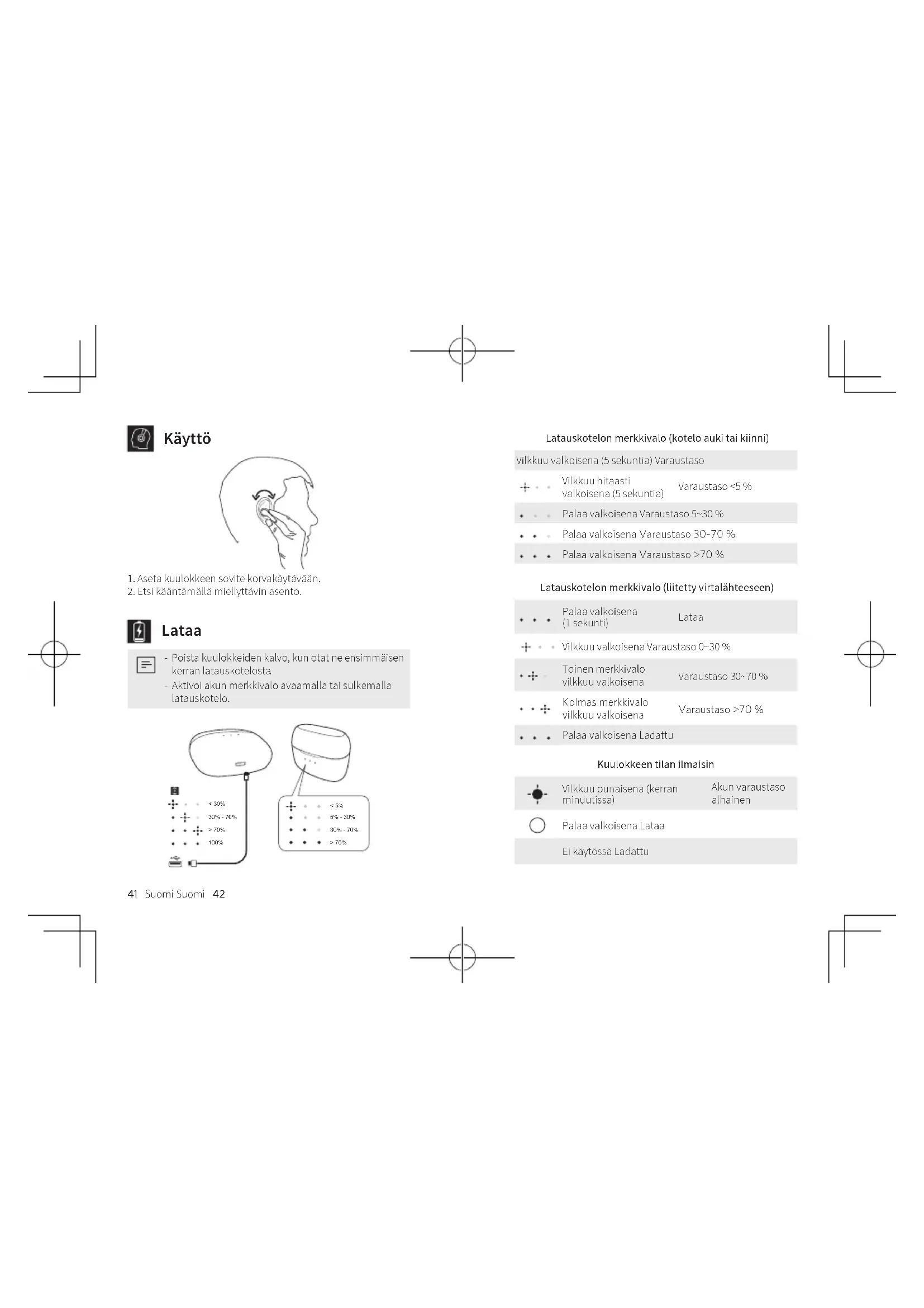 - Aktivoi akun merkkivalo avaamalla tai sulkemalla latauskotelo. < 30% 30% - 70% > 70% 100% 5% - 30% < 5% 30% - 70% > 70% Latauskotelon merkkivalo (kotelo auki tai kiinni) Vilkkuu valkoisena (5 sekuntia) Varaustaso Vilkkuu hitaasti valkoisena (5 sekuntia) Varaustaso <5 % Palaa valkoisena Varaustaso 5~30 % Palaa valkoisena Varaustaso 30~70 % Palaa valkoisena Varaustaso >70 % Latauskotelon merkkivalo (liitetty virtalähteeseen) Palaa valkoisena (1 sekunti) Lataa Vilkkuu valkoisena Varaustaso 0~30 % Toinen merkkivalo vilkkuu valkoisena Varaustaso 30~70 % Kolmas merkkivalo vilkkuu valkoisena Varaustaso >70 % Palaa valkoisena Ladattu Kuulokkeen tilan ilmaisin Vilkkuu punaisena (kerran minuutissa) Akun varaustaso alhainen Palaa valkoisena Lataa Ei käytössä Ladattu43 Suomi Suomi 44 Voit pidentää akun käyttöaikaa lataamalla sen täyteen vähintään 45 päivän välein. Virran kytkeminen/katkaiseminen