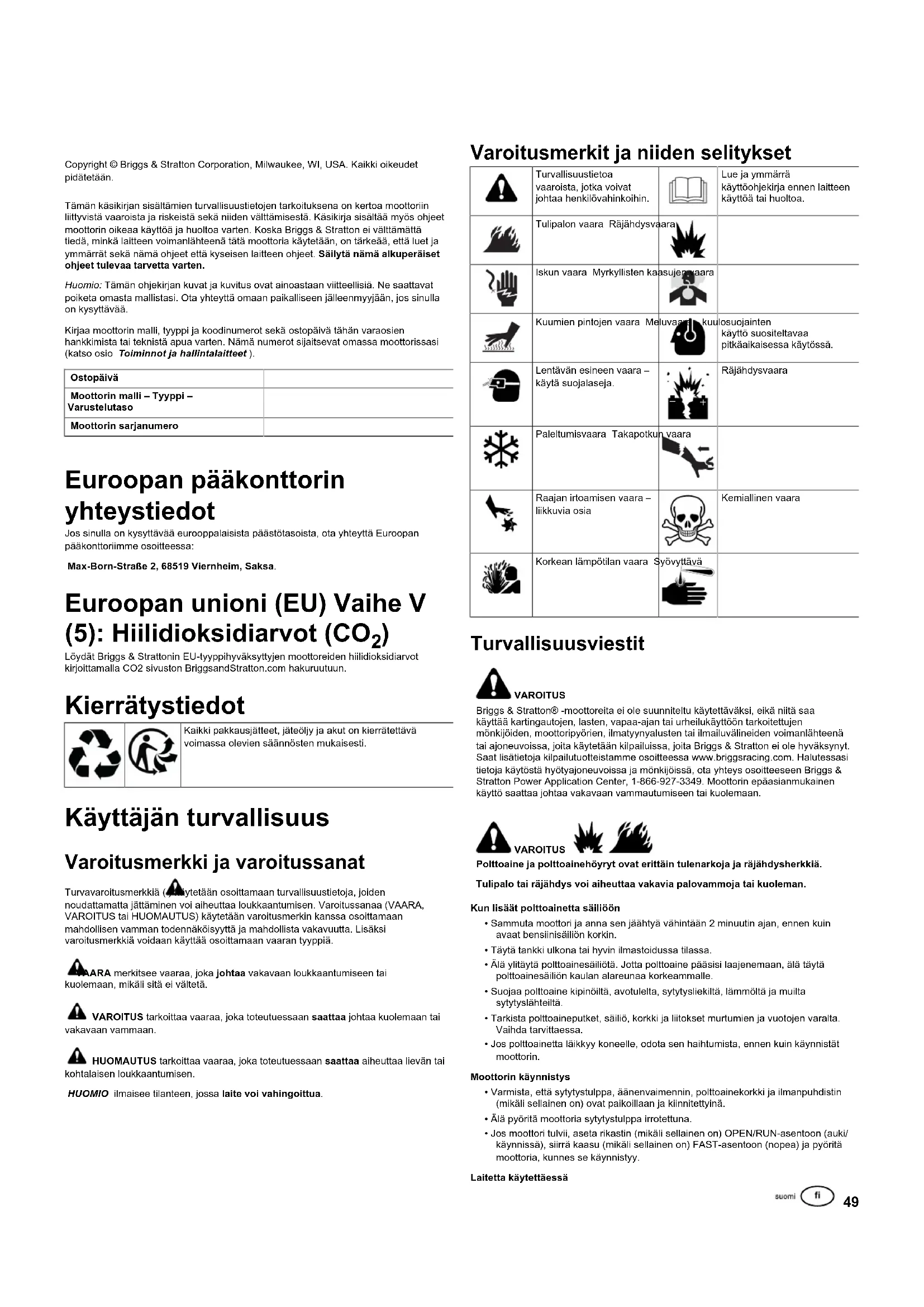 almacenamiento del equipo, o un montaje incorrecto del motor. El servicio bajo garantía está disponible únicamente en los concesionarios de servicio autorizados Briggs & Stratton. Localice su concesionario de servicio autorizado más cercano en nuestro mapa localizador en BRIGGSandSTRATTON.COM o llame al número 1-800-233-3723 (en EE.UU.). 80004537 (Rev. F)49 Copyright © Briggs & Stratton Corporation, Milwaukee, WI, USA. Kaikki oikeudet pidätetään. Tämän käsikirjan sisältämien turvallisuustietojen tarkoituksena on kertoa moottoriin liittyvistä vaaroista ja riskeistä sekä niiden välttämisestä. Käsikirja sisältää myös ohjeet moottorin oikeaa käyttöä ja huoltoa varten. Koska Briggs & Stratton ei välttämättä tiedä, minkä laitteen voimanlähteenä tätä moottoria käytetään, on tärkeää, että luet ja ymmärrät sekä nämä ohjeet että kyseisen laitteen ohjeet.Säilytä nämä alkuperäiset ohjeet tulevaa tarvetta varten. Huomio:Tämän ohjekirjan kuvat ja kuvitus ovat ainoastaan viitteellisiä. Ne saattavat poiketa omasta mallistasi. Ota yhteyttä omaan paikalliseen jälleenmyyjään, jos sinulla on kysyttävää. Kirjaa moottorin malli, tyyppi ja koodinumerot sekä ostopäivä tähän varaosien hankkimista tai teknistä apua varten. Nämä numerot sijaitsevat omassa moottorissasi (katso osioToiminnot ja hallintalaitteet). Ostopäivä Moottorin malli – Tyyppi – Varustelutaso Moottorin sarjanumero Euroopan pääkonttorin yhteystiedot Jos sinulla on kysyttävää eurooppalaisista päästötasoista, ota yhteyttä Euroopan pääkonttoriimme osoitteessa: Max-Born-Straße 2, 68519 Viernheim, Saksa. Euroopan unioni (EU) Vaihe V (5): Hiilidioksidiarvot (CO
