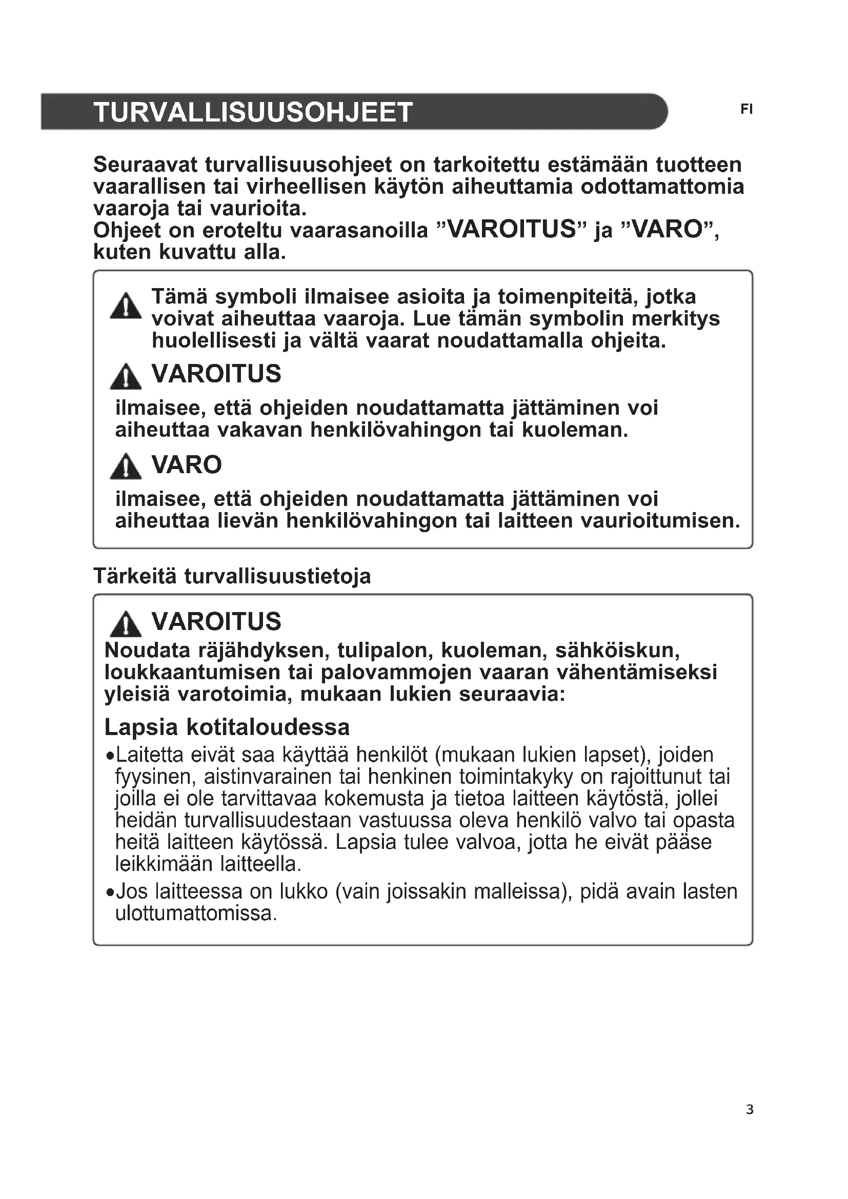 Seuraavat turvallisuusohjeet on tarkoitettu estämään tuotteen vaarallisen tai virheellisen käytön aiheuttamia odottamattomia vaaroja tai vaurioita. Ohjeet on eroteltu vaarasanoilla ”VAROITUS” ja ”VARO”, kuten kuvattu alla. Tämä symboli ilmaisee asioita ja toimenpiteitä, jotka voivat aiheuttaa vaaroja. Lue tämän symbolin merkitys huolellisesti ja vältä vaarat noudattamalla ohjeita. VAROITUS ilmaisee, että ohjeiden noudattamatta jättäminen voi aiheuttaa vakavan henkilövahingon tai kuoleman. VARO ilmaisee, että ohjeiden noudattamatta jättäminen voi aiheuttaa lievän henkilövahingon tai laitteen vaurioitumisen. Tärkeitä turvallisuustietoja VAROITUS Noudata räjähdyksen, tulipalon, kuoleman, sähköiskun, loukkaantumisen tai palovammojen vaaran vähentämiseksi yleisiä varotoimia, mukaan lukien seuraavia: Lapsia kotitaloudessa