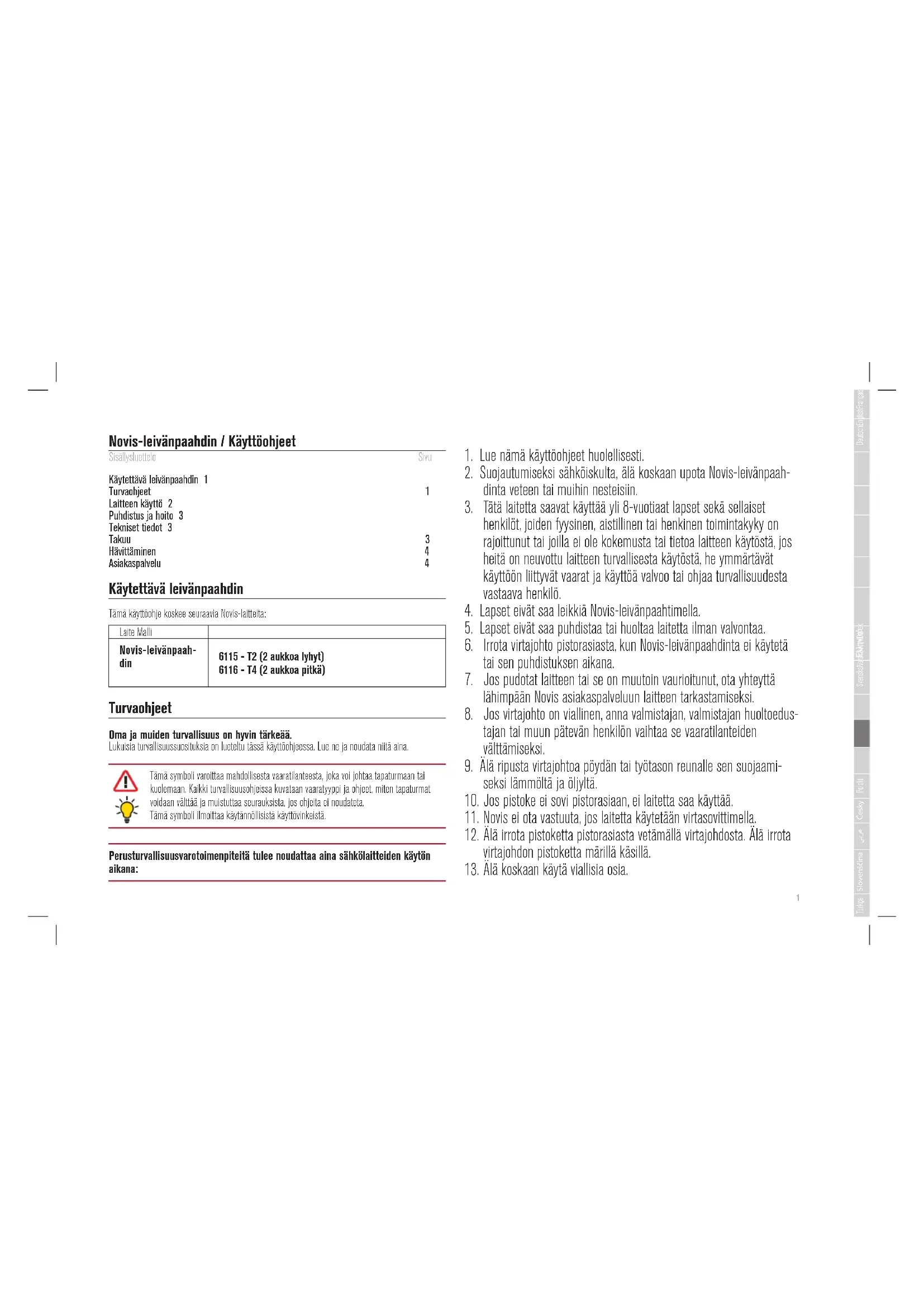 Novis-leivänpaahdin / Käyttöohjeet Sisällysluettelo Sivu Käytettävä leivänpaahdin 1 Turvaohjeet 1 Laitteen käyttö 2 Puhdistus ja hoito 3 Tekniset tiedot 3 Takuu 3 Hävittäminen 4 Asiakaspalvelu 4 Käytettävä leivänpaahdin Tämä käyttöohje koskee seuraavia Novis-laitteita: Laite Malli Novis-leivänpaah- din 6115 - T2 (2 aukkoa lyhyt) 6116 - T4 (2 aukkoa pitkä) Turvaohjeet Oma ja muiden turvallisuus on hyvin tärkeää. Lukuisia turvallisuussuosituksia on lueteltu tässä käyttöohjeessa. Lue ne ja noudata niitä aina. Tämä symboli varoittaa mahdollisesta vaaratilanteesta, joka voi johtaa tapaturmaan tai kuolemaan. Kaikki turvallisuusohjeissa kuvataan vaaratyyppi ja ohjeet, miten tapaturmat voidaan välttää ja muistuttaa seurauksista, jos ohjeita ei noudateta. Tämä symboli ilmoittaa käytännöllisistä käyttövinkeistä. Perusturvallisuusvarotoimenpiteitä tulee noudattaa aina sähkölaitteiden käytön aikana: