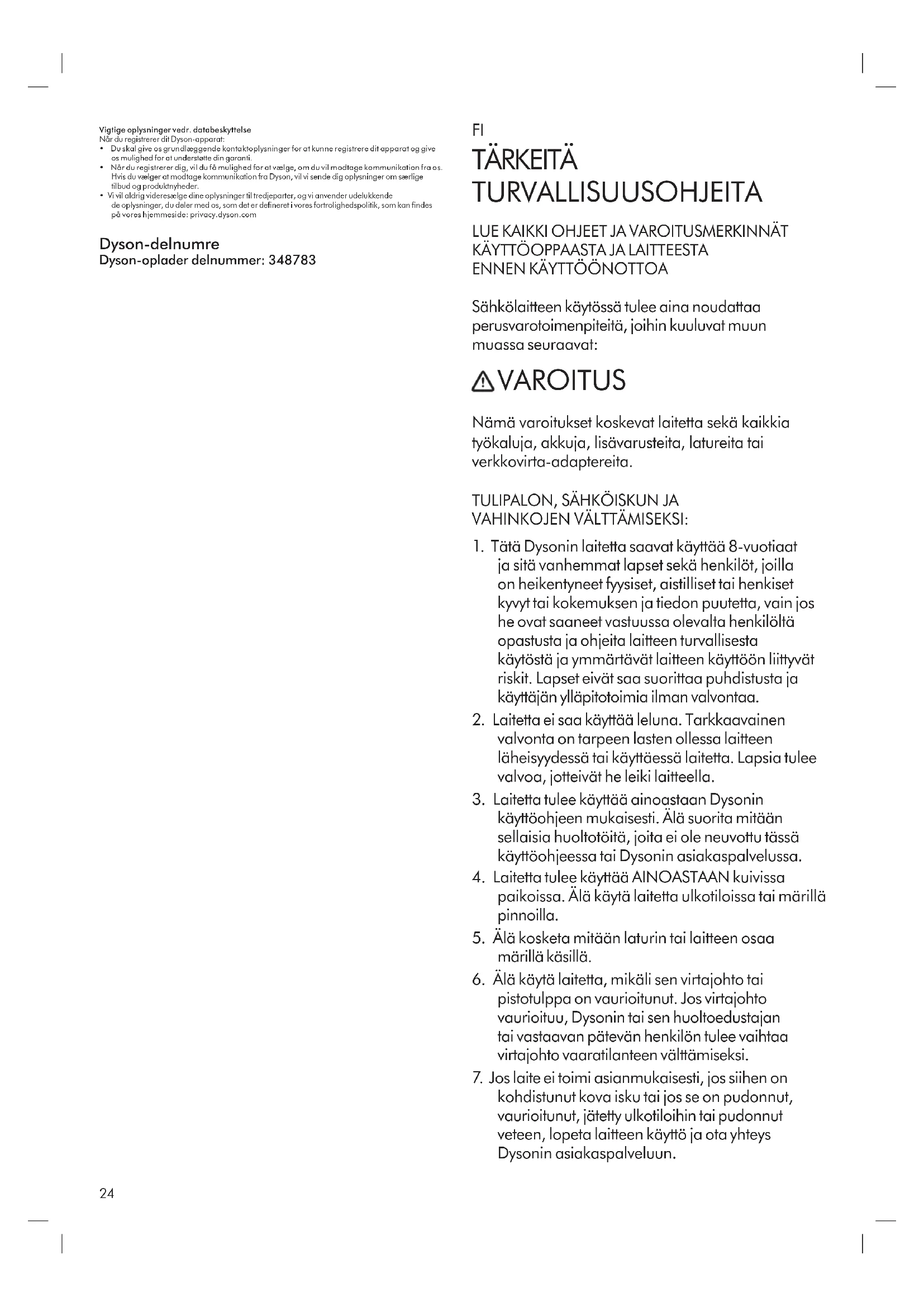 - Dyson ei koskaan myy tietojasi kolmansille osapuolille ja käyttää antamiasi tietoja ainoastaan Dysonin sivustolla olevien yksityisyydensuojakäytäntöjen mukaisesti. (privacy.dyson.com) Dyson-osanumerot Dyson-laturin osanumero: 348783