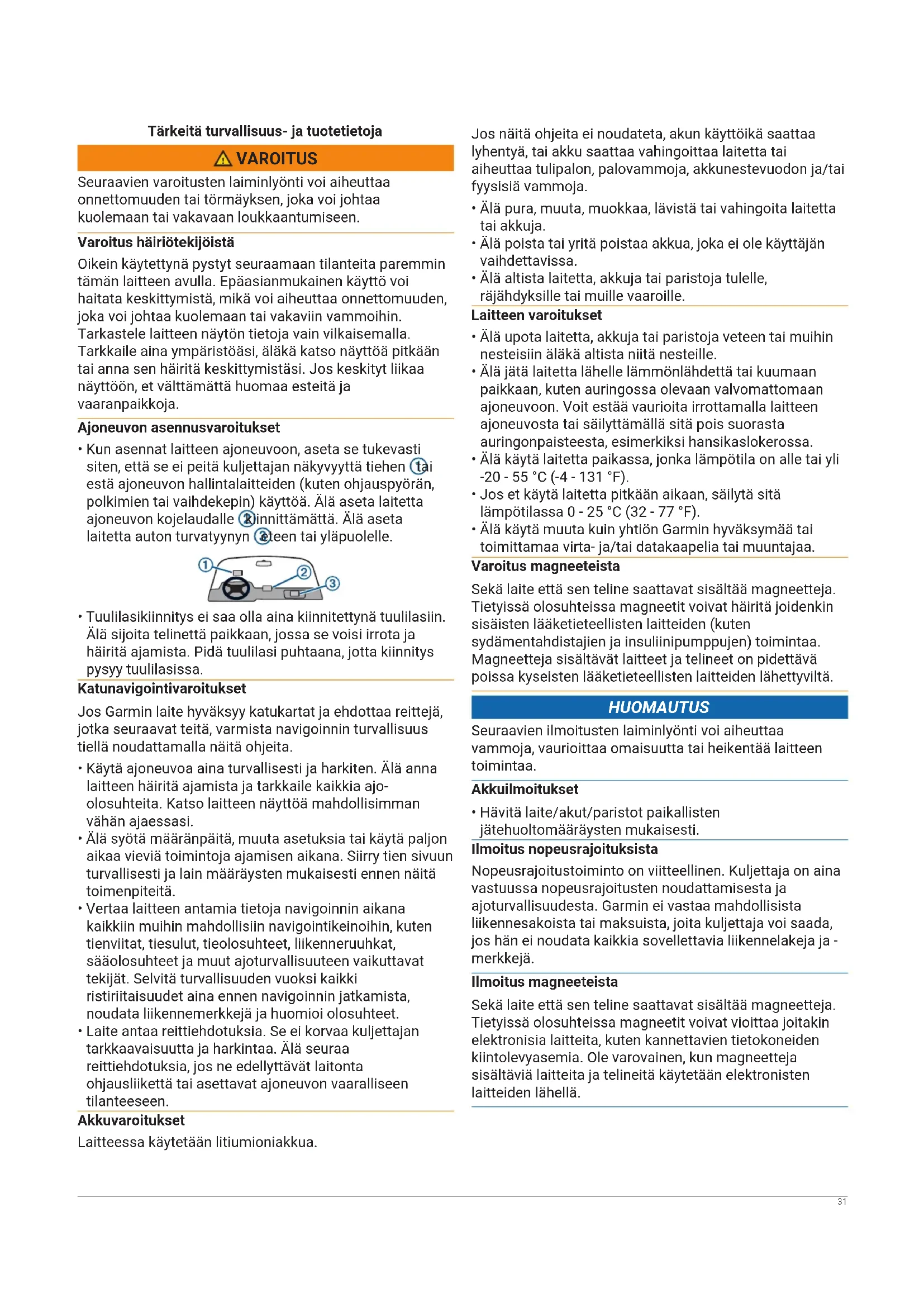 - Älä käytä muuta kuin yhtiön Garmin hyväksymää tai toimittamaa virta- ja/tai datakaapelia tai muuntajaa. Varoitus magneeteista Sekä laite että sen teline saattavat sisältää magneetteja. Tietyissä olosuhteissa magneetit voivat häiritä joidenkin sisäisten lääketieteellisten laitteiden (kuten sydämentahdistajien ja insuliinipumppujen) toimintaa. Magneetteja sisältävät laitteet ja telineet on pidettävä poissa kyseisten lääketieteellisten laitteiden lähettyviltä. HUOMAUTUS Seuraavien ilmoitusten laiminlyönti voi aiheuttaa vammoja, vaurioittaa omaisuutta tai heikentää laitteen toimintaa. Akkuilmoitukset