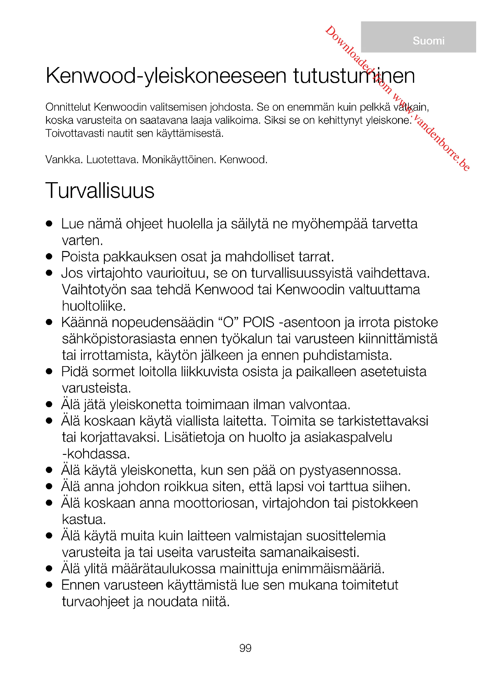 Downloaded from www.vandenborre.be107 Ongelmanratkaisuohje Ongelma Syy Ratkaisu K-vatkain tai vispilä osuu Työvälineen korkeus on Säädä korkeutta oikean kokoisen kulhon pohjaan tai ei ulotu väärä. Sitä on säädettävä. kiintoavaimen avulla. Lisätietoja on pohjalla sijaitseviin aineosiin. Työvälineen säätäminen -kohdassa. Varustetta ei voi kiinnittää Tarkista, että varuste on Tähän paikkaan mahtuu vain KAX- hitaan nopeuden aukkoon. yhteensopiva laitteen tunnuksella varustettu Twist- kanssa. Tähän aukkoon liitosjärjestelmään kuuluva varuste on kiinnitettävä . Twist-liitosjärjestelmään Bar-liitosjärjestelmään kuuluva varuste, jonka kuuluvat varusteet voidaan malli on KAX . yhdistää yleiskoneen Twist- liitäntään KAT002ME-sovittimen avulla. Lisätietoja on osoitteessa www.kenwoodworld.com/twist Kun yleiskoneen pistoke Nopeudensäädin ei ole Käännä nopeudensäädin työnnetään pistorasiaan, O-asennossa. O-asentoon. valmiustilan merkkivalo vilkkuu. Sekoituspää on nostettu Tarkista, että yleiskoneen pää on ylös tai sitä ei ole lukittu lukittu kunnolla ala-asentoon. kunnolla ala-asentoon. Yleiskone pysähtyy käytön Ylikuormitus- tai Irrota pistoke pistorasiasta. aikana. Valmiustilan ylikuumenemissuojaus on Tarkista, ettei yleiskonetta merkkivalo vilkkuu nopeasti. lauennut. ylikuormiteta ja että siinä ei ole Enimmäiskapasiteetti on toimintaa haittaavia esteitä. ylitetty. Käännä nopeudenvalitsin O- kohtaan ja käynnistä yleiskone uudelleen. Jos laite ei käynnisty, poista aineosia kuormituksen vähentämiseksi ja käynnistä laite uudelleen. Jos ongelma ei ratkea, irrota pistoke pistorasiasta ja anna laitteen jäähtyä 15 minuuttia. Työnnä pistoke pistorasiaan ja valitse toinen nopeus. Jos laite ei käynnisty näistä toimista huolimatta, kysy neuvoa asiakaspalvelusta. Valmiustilan merkkivalo Yleiskoneeseen on ollut Nollaa painamalla vilkkuu, kun yleiskoneen virta kytkettynä 30 valmiustilapainiketta kerran. pistoke on pistorasiassa. minuuttia, ja se on siirtynyt virransäästötilaan. Downloaded from www.vandenborre.beKenwood Mutfak Robotunuzu Tanıyın Bir Kenwood satın aldığınız için tebrik ederiz. Sahip olduğu çok çeşitli eklentiler ile sadece bir mikserden çok daha fazlasıdır. En son teknoloji Mutfak Robotudur. Umarız keyif alırsınız. Sağlam. Güvenilir, Çok yönlü, Kenwood.