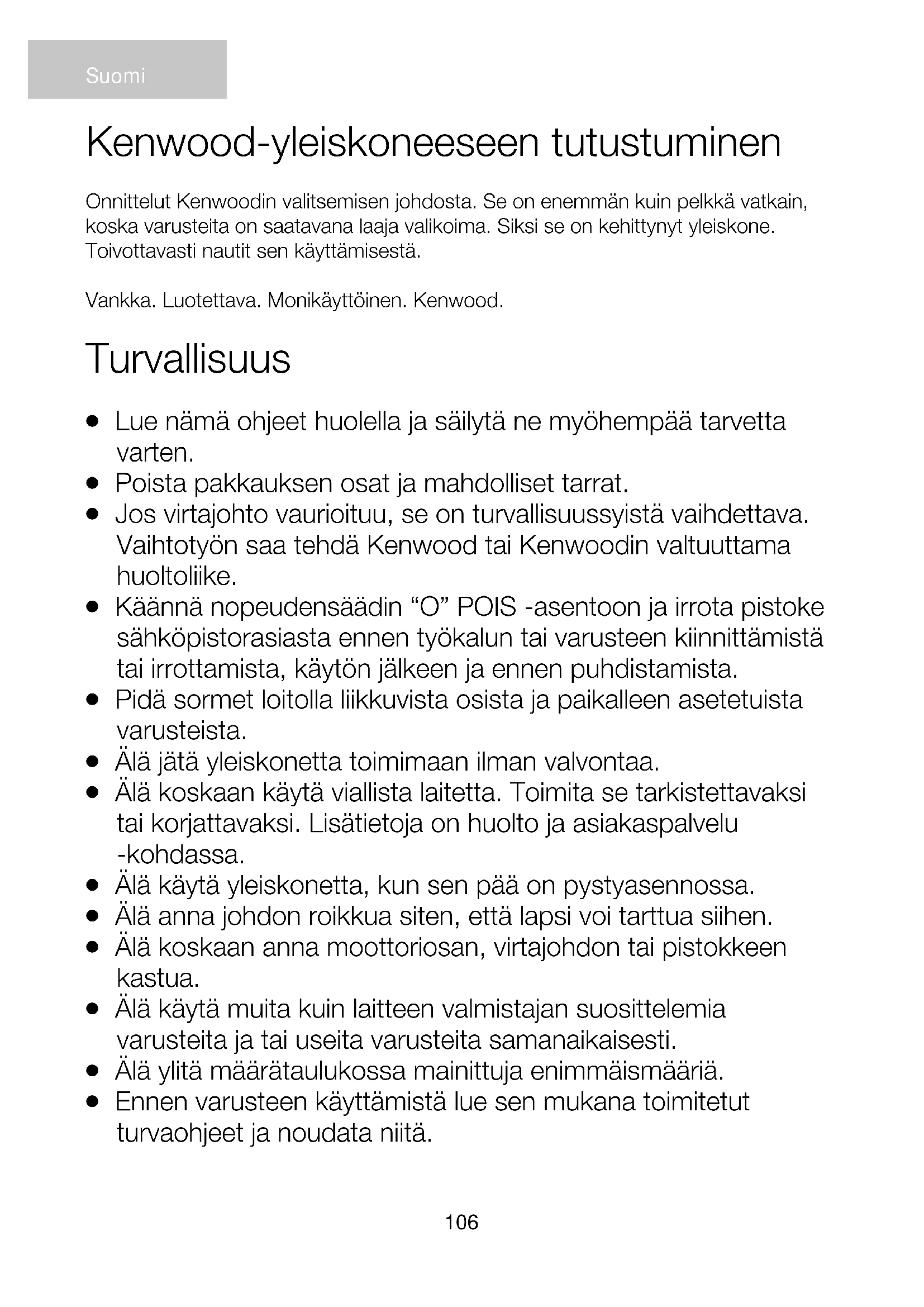 (WEEE) Tuotetta ei saa hävittää yhdessä tavallisten kotitalousjätteiden kanssa sen lopullisen käytöstä poiston yhteydessä. Vie se paikallisten viranomaisten hyväksymään kierrätyskeskukseen tai anna se jälleenmyyjän hävitettäväksi, mikäli kyseinen palvelu kuuluu jälleenmyyjän toimialaan. Suojelet luontoa ja vältyt virheellisen tai väärän romutuksen aiheuttamilta terveysriskeiltä, mikäli hävität kodinkoneen erillään muista jätteistä. Näin myös kodinkoneen sisältämät kierrätettävät materiaalit voidaan kerätä talteen, jolloin säästät energiaa ja luonnonvaroja. Tuotteessa on ristillä peitetty roskasäiliön merkki, jonka tarkoituksena on muistuttaa että kodinkoneet on hävitettävä erikseen muista kotitalousjätteistä.117 Kenwood Mutfak Robotunuzu Tanıyın Bir Kenwood satın aldığınız için tebrik ederiz. Sahip olduğu çok çeşitli eklentiler ile sadece bir mikserden çok daha fazlasıdır. En son teknoloji Mutfak Robotudur. Umarız keyif alırsınız. Sağlam. Güvenilir, Çok yönlü, Kenwood. Güvenlik