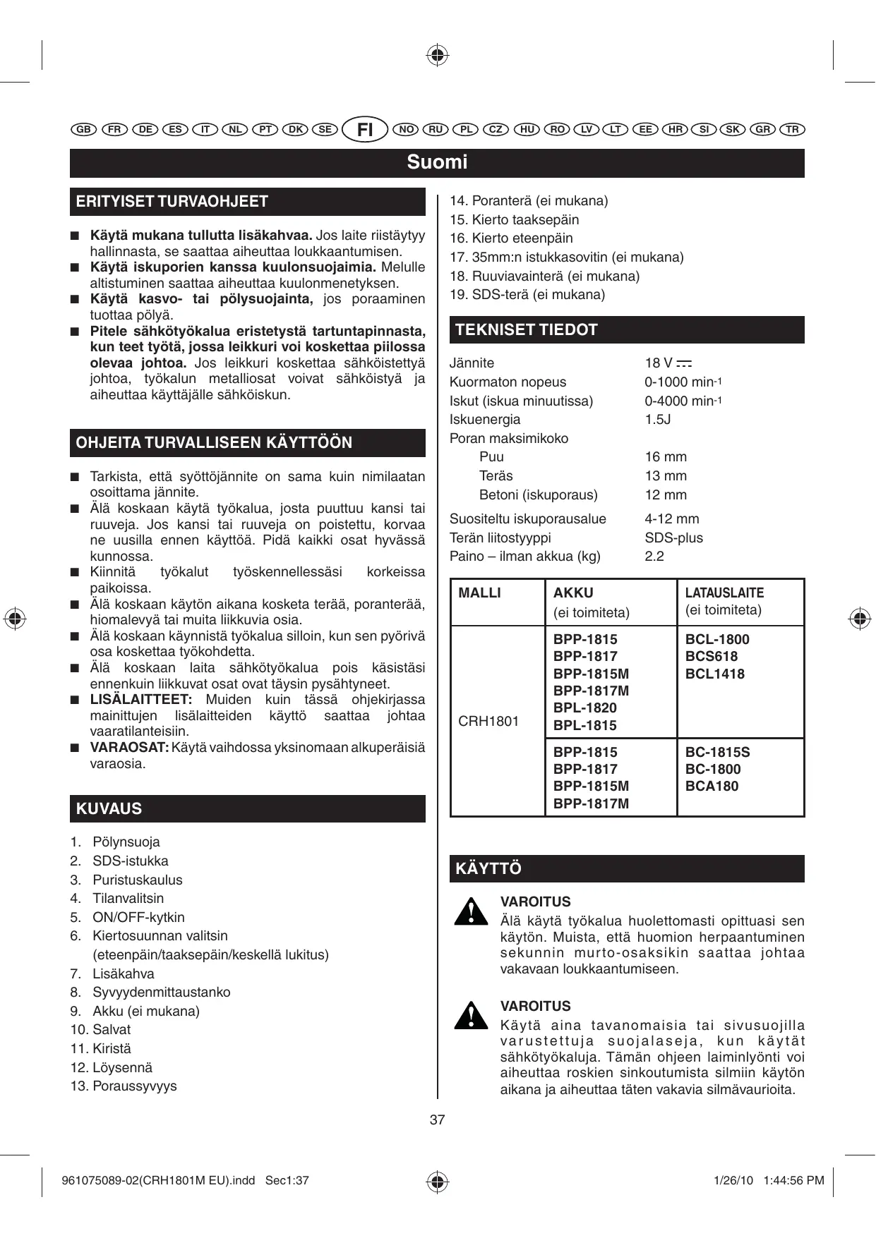 Löydä laitteen käyttöohje ilmaiseksi CRH1801 RYOBI PDF-muodossa.