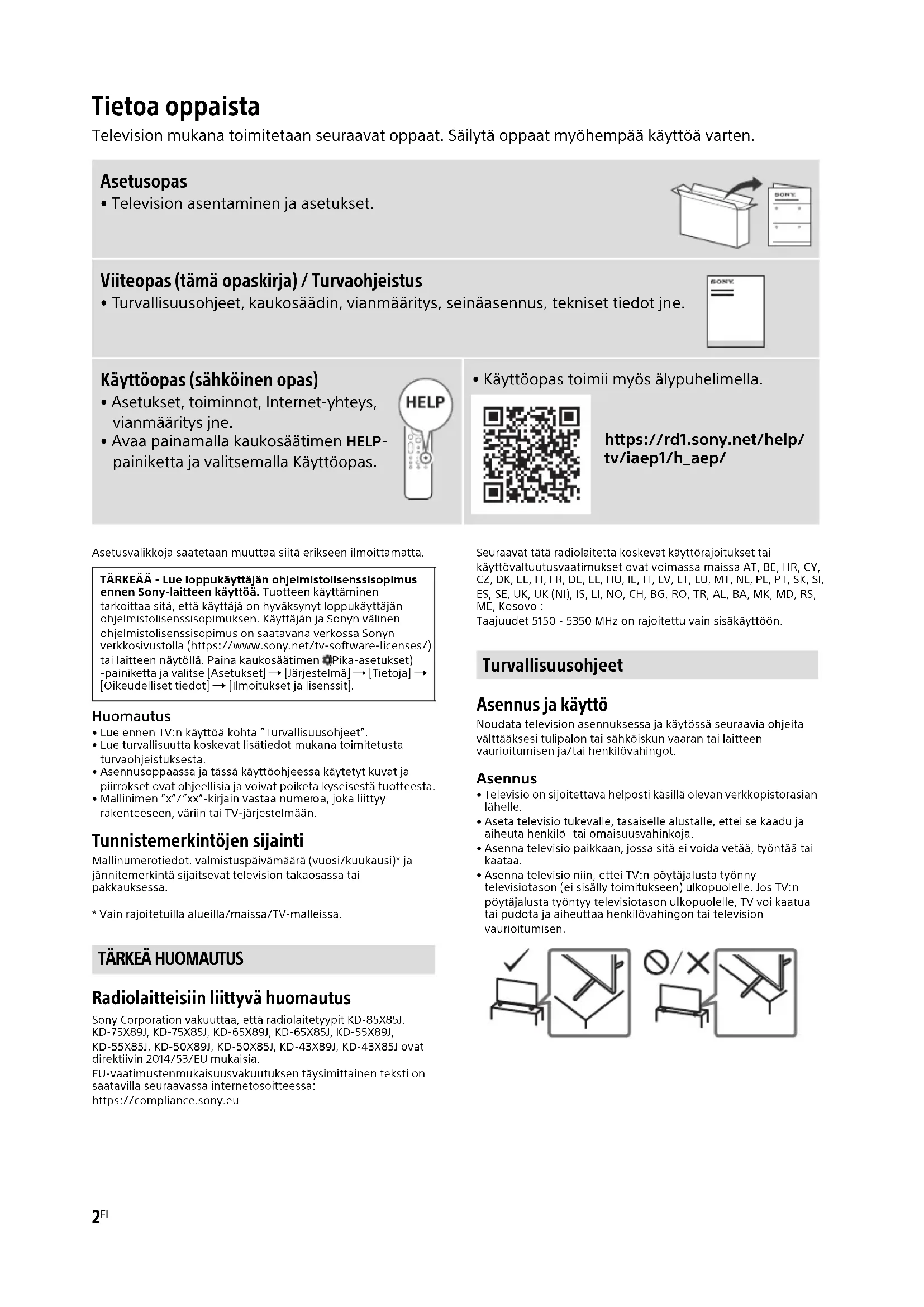 - Vain rajoitetuilla alueilla/maissa/TV-malleissa. Radiolaitteisiin liittyvä huomautus Sony Corporation vakuuttaa, että radiolaitetyypit KD-85X85J, KD-75X89J, KD-75X85J, KD-65X89J, KD-65X85J, KD-55X89J, KD-55X85J, KD-50X89J, KD-50X85J, KD-43X89J, KD-43X85J ovat direktiivin 2014/53/EU mukaisia. EU-vaatimustenmukaisuusvakuutuksen täysimittainen teksti on saatavilla seuraavassa internetosoitteessa: https://compliance.sony.eu Seuraavat tätä radiolaitetta koskevat käyttörajoitukset tai käyttövaltuutusvaatimukset ovat voimassa maissa AT, BE, HR, CY, CZ, DK, EE, FI, FR, DE, EL, HU, IE, IT, LV, LT, LU, MT, NL, PL, PT, SK, SI, ES, SE, UK, UK (NI), IS, LI, NO, CH, BG, RO, TR, AL, BA, MK, MD, RS, ME, Kosovo : Taajuudet 5150 - 5350 MHz on rajoitettu vain sisäkäyttöön. Asennus ja käyttö Noudata television asennuksessa ja käytössä seuraavia ohjeita välttääksesi tulipalon tai sähköiskun vaaran tai laitteen vaurioitumisen ja/tai henkilövahingot. Asennus