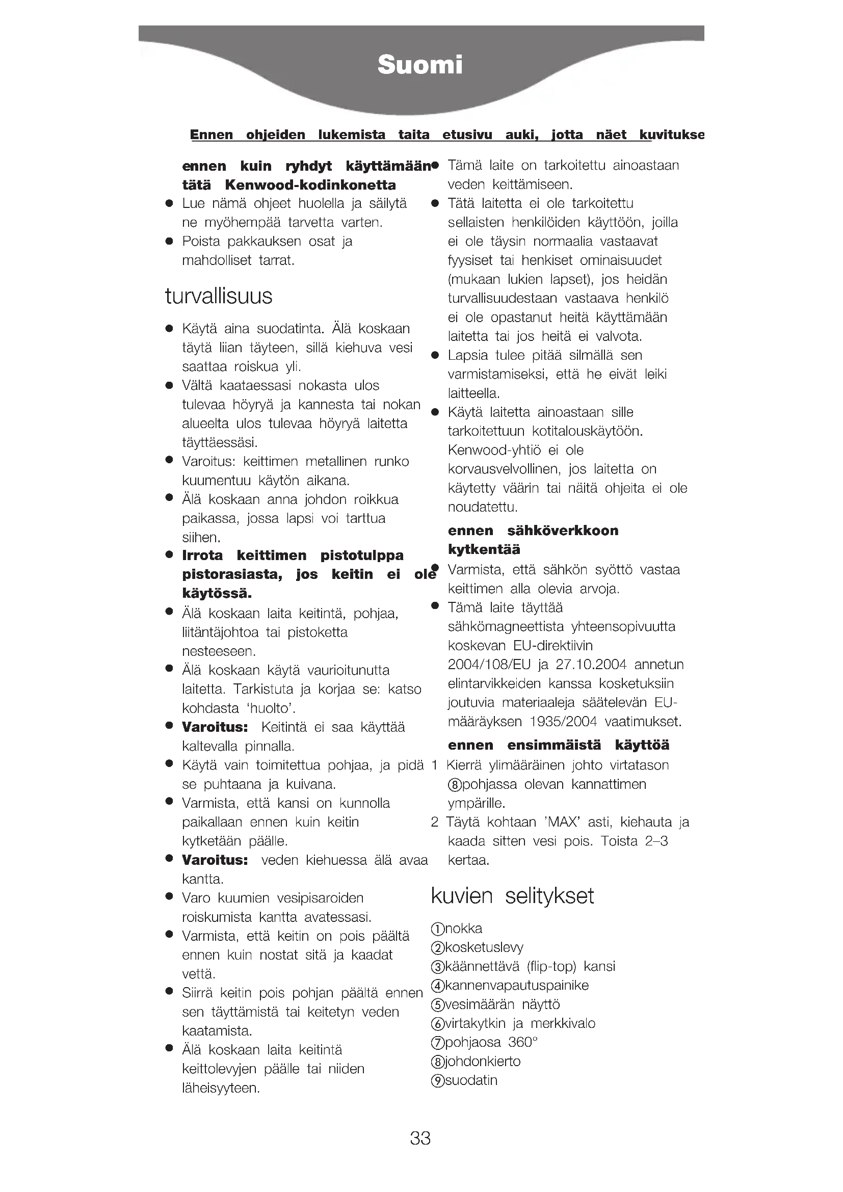 Tämä laite täyttää sähkömagneettista yhteensopivuutta koskevan EU-direktiivin 2004/108/EU ja 27.10.2004 annetun elintarvikkeiden kanssa kosketuksiin joutuvia materiaaleja säätelevän EU- määräyksen 1935/2004 vaatimukset. ennen ensimmäistä käyttöä 1 Kierrä ylimääräinen johto virtatason 햹 pohjassa olevan kannattimen ympärille. 2 Täytä kohtaan ’MAX’ asti, kiehauta ja kaada sitten vesi pois. Toista 2–3 kertaa. kuvien selitykset 햲 nokka 햳 kosketuslevy 햴 käännettävä (flip-top) kansi 햵 kannenvapautuspainike 햶 vesimäärän näyttö 햷 virtakytkin ja merkkivalo 햸 pohjaosa 360° 햹 johdonkierto 햺 suodatin Suomi