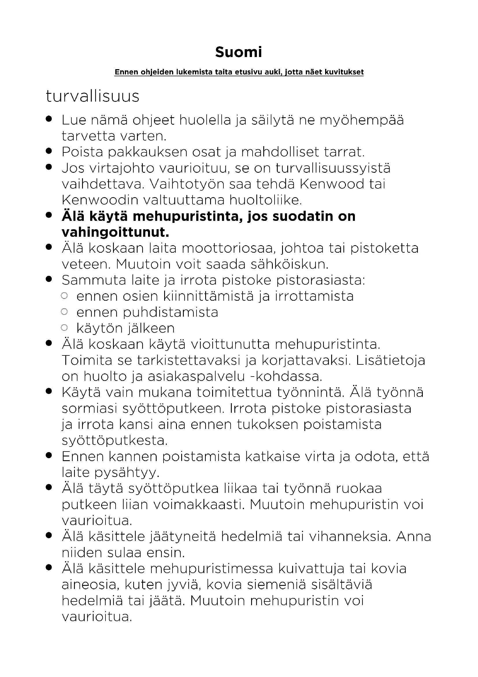 Käytä laitetta ainoastaan sille tarkoitettuun kotitalouskäytöön. Kenwood-yhtiö ei ole korvausvelvollinen, jos laitetta on käytetty väärin tai näitä ohjeita ei ole noudatettu.
