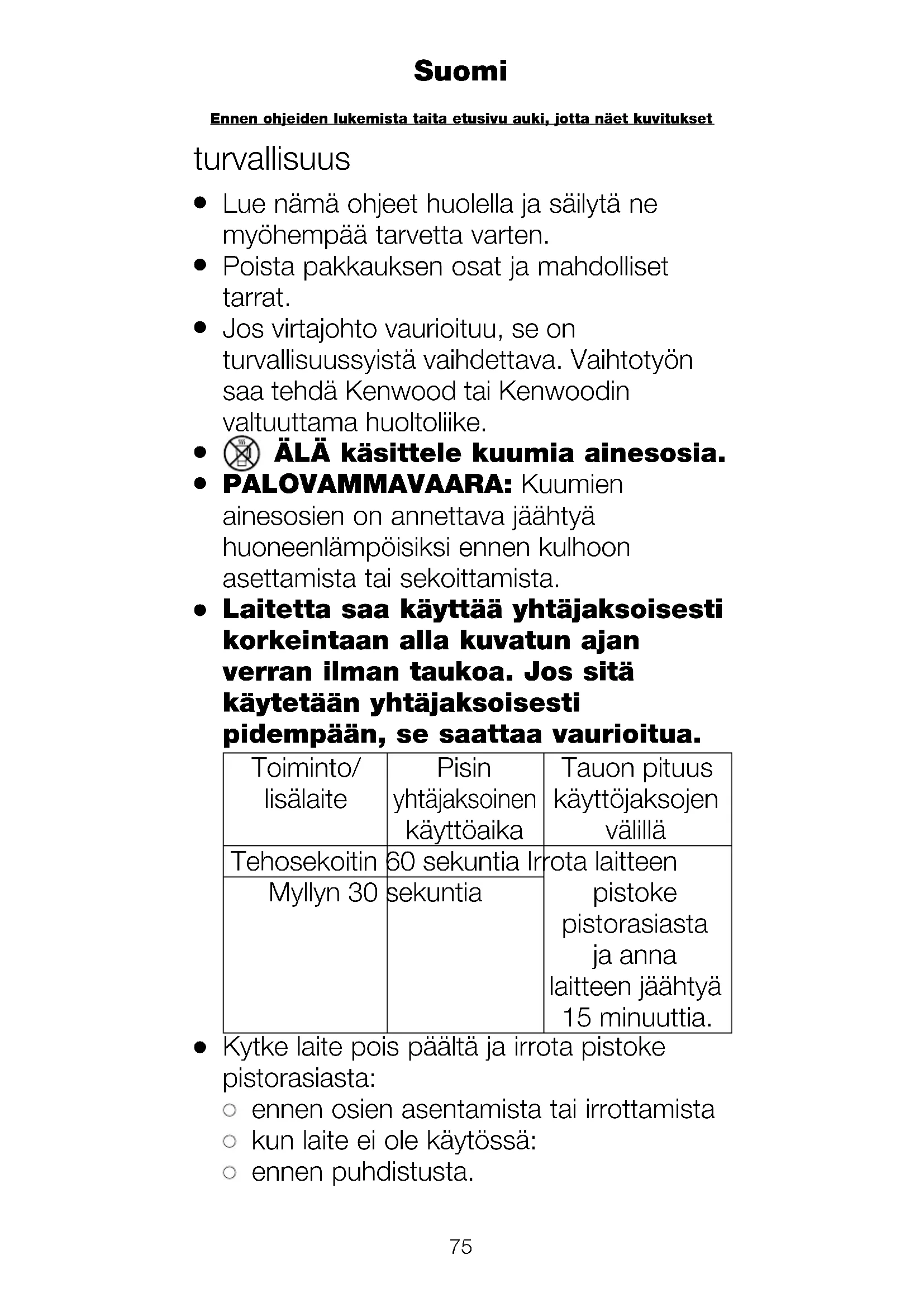 Kytke laite pois päältä ja irrota pistoke pistorasiasta: ennen osien asentamista tai irrottamista kun laite ei ole käytössä: ennen puhdistusta. Ennen ohjeiden lukemista taita etusivu auki, jotta näet kuvitukset Suomi75 76