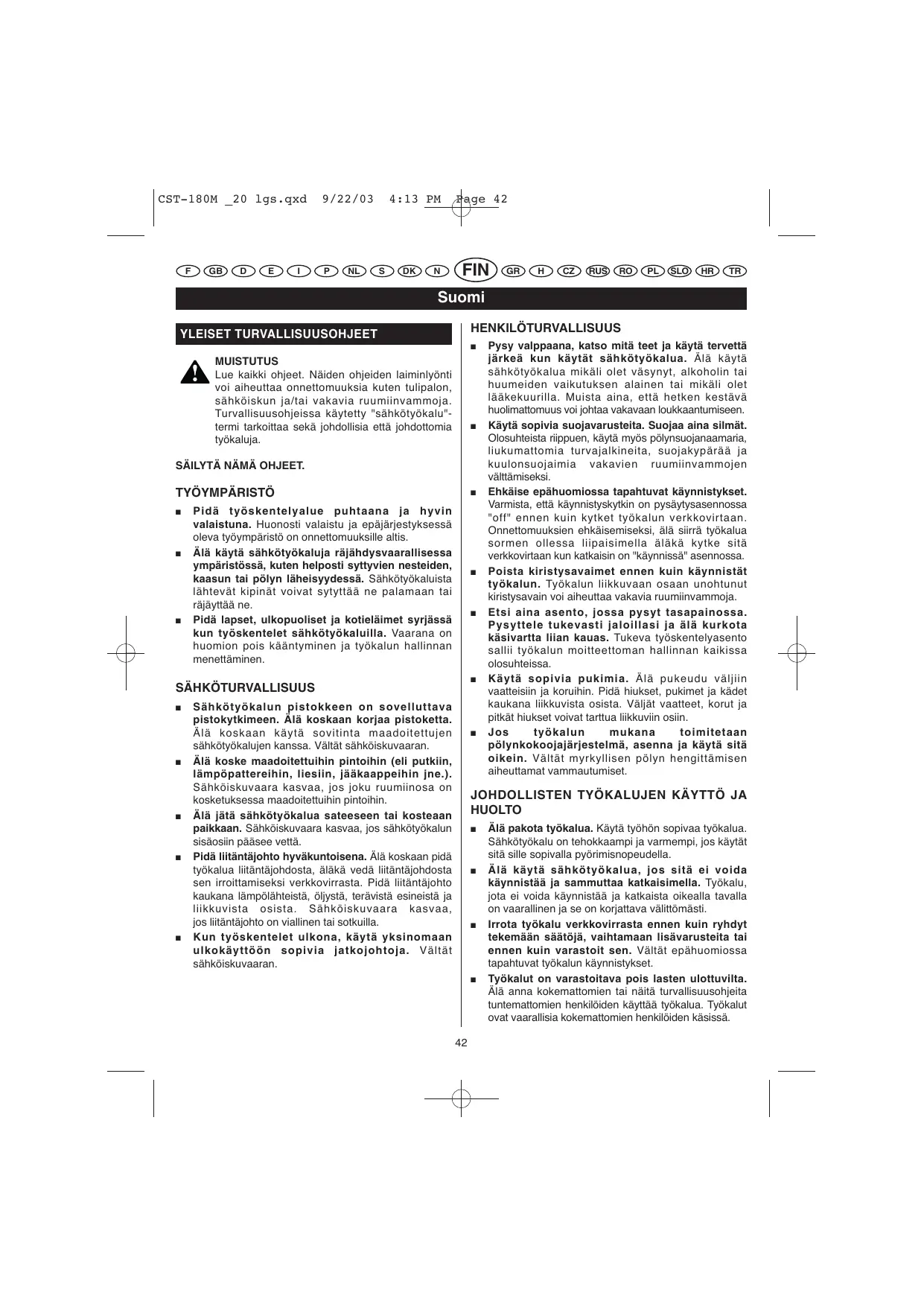 Älä pakota työkalua. Käytä työhön sopivaa työkalua. Sähkötyökalu on tehokkaampi ja varmempi, jos käytät sitä sille sopivalla pyörimisnopeudella. Älä käytä sähkötyökalua, jos sitä ei voida käynnistää ja sammuttaa katkaisimella. Työkalu, jota ei voida käynnistää ja katkaista oikealla tavalla on vaarallinen ja se on korjattava välittömästi. Irrota työkalu verkkovirrasta ennen kuin ryhdyt tekemään säätöjä, vaihtamaan lisävarusteita tai ennen kuin varastoit sen. Vältät epähuomiossa tapahtuvat työkalun käynnistykset. Työkalut on varastoitava pois lasten ulottuvilta. Älä anna kokemattomien tai näitä turvallisuusohjeita tuntemattomien henkilöiden käyttää työkalua. Työkalut ovat vaarallisia kokemattomien henkilöiden käsissä. CST-180M _20 lgs.qxd