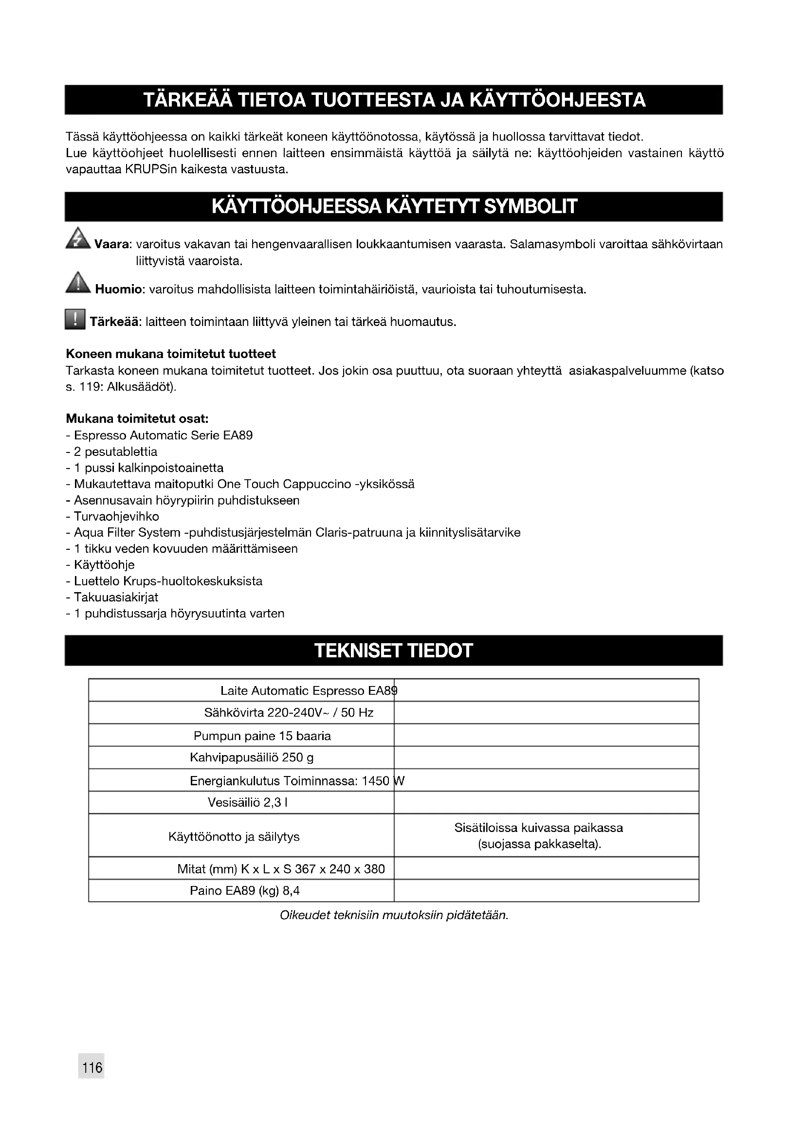 Tärkeää: laitteen toimintaan liittyvä yleinen tai tärkeä huomautus. Koneen mukana toimitetut tuotteet Tarkasta koneen mukana toimitetut tuotteet. Jos jokin osa puuttuu, ota suoraan yhteyttä asiakaspalveluumme (katso s. 119: Alkusäädöt). Mukana toimitetut osat: - Espresso Automatic Serie EA89 - 2 pesutablettia - 1 pussi kalkinpoistoainetta - Mukautettava maitoputki One Touch Cappuccino -yksikössä - Asennusavain höyrypiirin puhdistukseen - Turvaohjevihko - Aqua Filter System -puhdistusjärjestelmän Claris-patruuna ja kiinnityslisätarvike - 1 tikku veden kovuuden määrittämiseen - Käyttöohje - Luettelo Krups-huoltokeskuksista - Takuuasiakirjat - 1 puhdistussarja höyrysuutinta varten TEKNISET TIEDOT Laite Automatic Espresso EA89 Sähkövirta 220-240V~ / 50 Hz Pumpun paine 15 baaria Kahvipapusäiliö 250 g Energiankulutus Toiminnassa: 1450 W Vesisäiliö 2,3 l Käyttöönotto ja säilytys Sisätiloissa kuivassa paikassa (suojassa pakkaselta). Mitat (mm) K x L x S 367 x 240 x 380 Paino EA89 (kg) 8,4 Oikeudet teknisiin muutoksiin pidätetään.117
