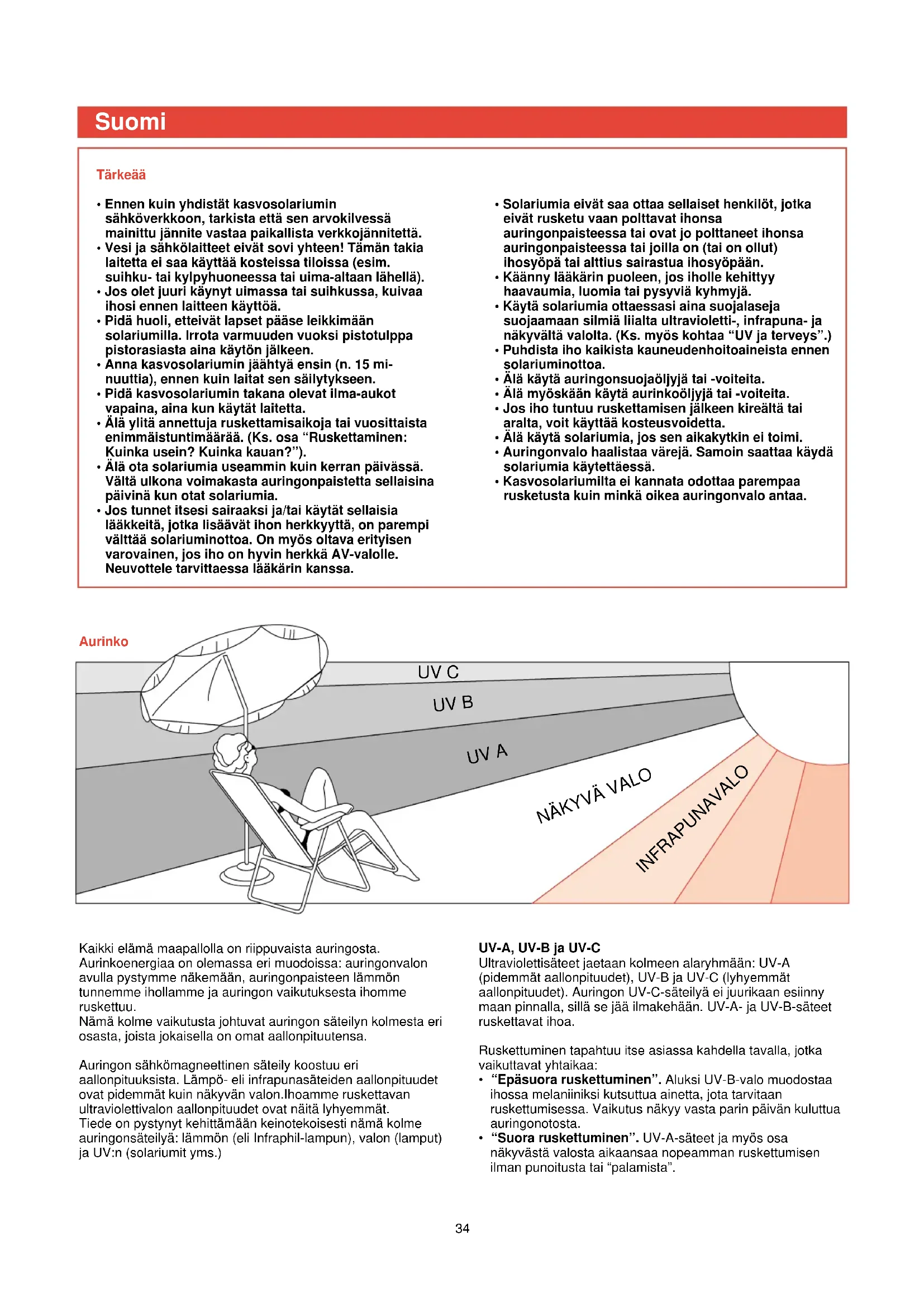 INFRAPUNAVALO Tärkeää• Ennen kuin yhdistät kasvosolariuminsähköverkkoon, tarkista että sen arvokilvessämainittu jännite vastaa paikallista verkkojännitettä.• Vesi ja sähkölaitteet eivät sovi yhteen! Tämän takialaitetta ei saa käyttää kosteissa tiloissa (esim.suihku- tai kylpyhuoneessa tai uima-altaan lähellä).• Jos olet juuri käynyt uimassa tai suihkussa, kuivaaihosi ennen laitteen käyttöä.• Pidä huoli, etteivät lapset pääse leikkimäänsolariumilla. Irrota varmuuden vuoksi pistotulppapistorasiasta aina käytön jälkeen.• Anna kasvosolariumin jäähtyä ensin (n. 15 mi-nuuttia), ennen kuin laitat sen säilytykseen.• Pidä kasvosolariumin takana olevat ilma-aukotvapaina, aina kun käytät laitetta.• Älä ylitä annettuja ruskettamisaikoja tai vuosittaistaenimmäistuntimäärää. (Ks. osa “Ruskettaminen:Kuinka usein? Kuinka kauan?”).• Älä ota solariumia useammin kuin kerran päivässä.Vältä ulkona voimakasta auringonpaistetta sellaisinapäivinä kun otat solariumia.• Jos tunnet itsesi sairaaksi ja/tai käytät sellaisialääkkeitä, jotka lisäävät ihon herkkyyttä, on parempivälttää solariuminottoa. On myös oltava erityisenvarovainen, jos iho on hyvin herkkä AV-valolle.Neuvottele tarvittaessa lääkärin kanssa.• Solariumia eivät saa ottaa sellaiset henkilöt, jotkaeivät rusketu vaan polttavat ihonsaauringonpaisteessa tai ovat jo polttaneet ihonsaauringonpaisteessa tai joilla on (tai on ollut)ihosyöpä tai alttius sairastua ihosyöpään.• Käänny lääkärin puoleen, jos iholle kehittyyhaavaumia, luomia tai pysyviä kyhmyjä.• Käytä solariumia ottaessasi aina suojalasejasuojaamaan silmiä liialta ultravioletti-, infrapuna- janäkyvältä valolta. (Ks. myös kohtaa “UV ja terveys”.)• Puhdista iho kaikista kauneudenhoitoaineista ennensolariuminottoa.• Älä käytä auringonsuojaöljyjä tai -voiteita. • Älä myöskään käytä aurinkoöljyjä tai -voiteita.• Jos iho tuntuu ruskettamisen jälkeen kireältä taiaralta, voit käyttää kosteusvoidetta.• Älä käytä solariumia, jos sen aikakytkin ei toimi.• Auringonvalo haalistaa värejä. Samoin saattaa käydäsolariumia käytettäessä.• Kasvosolariumilta ei kannata odottaa parempaarusketusta kuin minkä oikea auringonvalo antaa.Kaikki elämä maapallolla on riippuvaista auringosta.Aurinkoenergiaa on olemassa eri muodoissa: auringonvalon avulla pystymme näkemään, auringonpaisteen lämmön tunnemme ihollamme ja auringon vaikutuksesta ihommeruskettuu. Nämä kolme vaikutusta johtuvat auringon säteilyn kolmesta eri osasta, joista jokaisella on omat aallonpituutensa. Auringon sähkömagneettinen säteily koostuu eri aallonpituuksista. Lämpö- eli infrapunasäteiden aallonpituudet ovat pidemmät kuin näkyvän valon.Ihoamme ruskettavan ultraviolettivalon aallonpituudet ovat näitä lyhyemmät. Tiede on pystynyt kehittämään keinotekoisesti nämä kolme auringonsäteilyä: lämmön (eli Infraphil-lampun), valon (lamput) ja UV:n (solariumit yms.)UV-A, UV-B ja UV-CUltraviolettisäteet jaetaan kolmeen alaryhmään: UV-A (pidemmät aallonpituudet), UV-B ja UV-C (lyhyemmät aallonpituudet). Auringon UV-C-säteilyä ei juurikaan esiinny maan pinnalla, sillä se jää ilmakehään. UV-A- ja UV-B-säteet ruskettavat ihoa.Ruskettuminen tapahtuu itse asiassa kahdella tavalla, jotkavaikuttavat yhtaikaa: