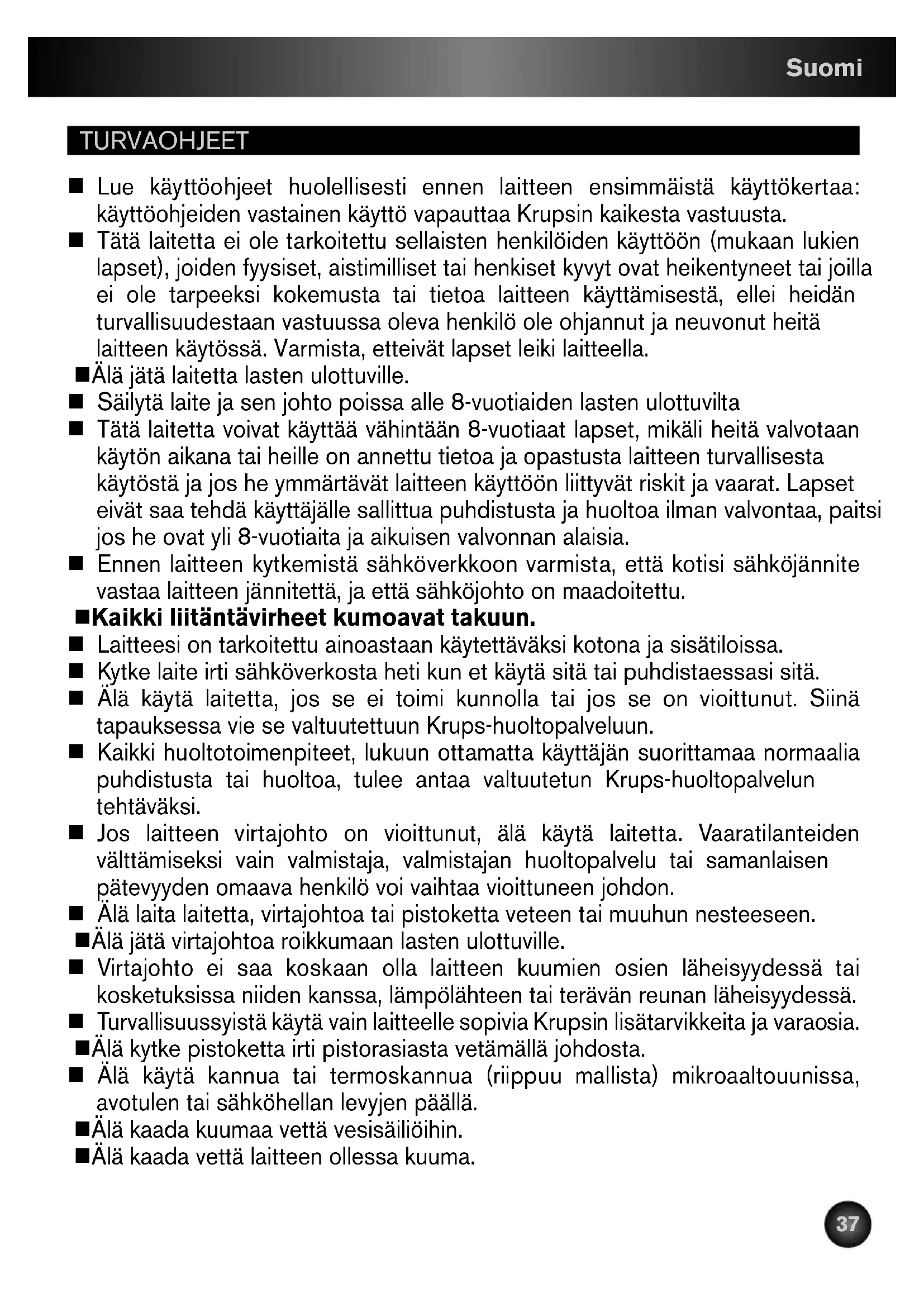 KRPS-CAFET-DUOTECH-NC0011572622/04/1309:05Page36TURVAOHJEET n Lue käyttöohjeet huolellisesti ennen laitteen ensimmäistä käyttökertaa: käyttöohjeiden vastainen käyttö vapauttaa Krupsin kaikesta vastuusta. n Tätä laitetta ei ole tarkoitettu sellaisten henkilöiden käyttöön (mukaan lukien lapset), joiden fyysiset, aistimilliset tai henkiset kyvyt ovat heikentyneet tai joilla ei ole tarpeeksi kokemusta tai tietoa laitteen käyttämisestä, ellei heidän turvallisuudestaan vastuussa oleva henkilö ole ohjannut ja neuvonut heitä laitteen käytössä. Varmista, etteivät lapset leiki laitteella. n Älä jätä laitetta lasten ulottuville. n Säilytä laite ja sen johto poissa alle 8-vuotiaiden lasten ulottuvilta n Tätä laitetta voivat käyttää vähintään 8-vuotiaat lapset, mikäli heitä valvotaan käytön aikana tai heille on annettu tietoa ja opastusta laitteen turvallisesta käytöstä ja jos he ymmärtävät laitteen käyttöön liittyvät riskit ja vaarat. Lapset eivät saa tehdä käyttäjälle sallittua puhdistusta ja huoltoa ilman valvontaa, paitsi jos he ovat yli 8-vuotiaita ja aikuisen valvonnan alaisia. n Ennen laitteen kytkemistä sähköverkkoon varmista, että kotisi sähköjännite vastaa laitteen jännitettä, ja että sähköjohto on maadoitettu. n Kaikki liitäntävirheet kumoavat takuun. n Laitteesi on tarkoitettu ainoastaan käytettäväksi kotona ja sisätiloissa. n Kytke laite irti sähköverkosta heti kun et käytä sitä tai puhdistaessasi sitä. n Älä käytä laitetta, jos se ei toimi kunnolla tai jos se on vioittunut. Siinä tapauksessa vie se valtuutettuun Krups-huoltopalveluun. n Kaikki huoltotoimenpiteet, lukuun ottamatta käyttäjän suorittamaa normaalia puhdistusta tai huoltoa, tulee antaa valtuutetun Krups-huoltopalvelun tehtäväksi. n Jos laitteen virtajohto on vioittunut, älä käytä laitetta. Vaaratilanteiden välttämiseksi vain valmistaja, valmistajan huoltopalvelu tai samanlaisen pätevyyden omaava henkilö voi vaihtaa vioittuneen johdon. n Älä laita laitetta, virtajohtoa tai pistoketta veteen tai muuhun nesteeseen. n Älä jätä virtajohtoa roikkumaan lasten ulottuville. n Virtajohto ei saa koskaan olla laitteen kuumien osien läheisyydessä tai kosketuksissa niiden kanssa, lämpölähteen tai terävän reunan läheisyydessä. n Turvallisuussyistä käytä vain laitteelle sopivia Krupsin lisätarvikkeita ja varaosia. n Älä kytke pistoketta irti pistorasiasta vetämällä johdosta. n Älä käytä kannua tai termoskannua (riippuu mallista) mikroaaltouunissa, avotulen tai sähköhellan levyjen päällä. n Älä kaada kuumaa vettä vesisäiliöihin. n Älä kaada vettä laitteen ollessa kuuma. Suomi