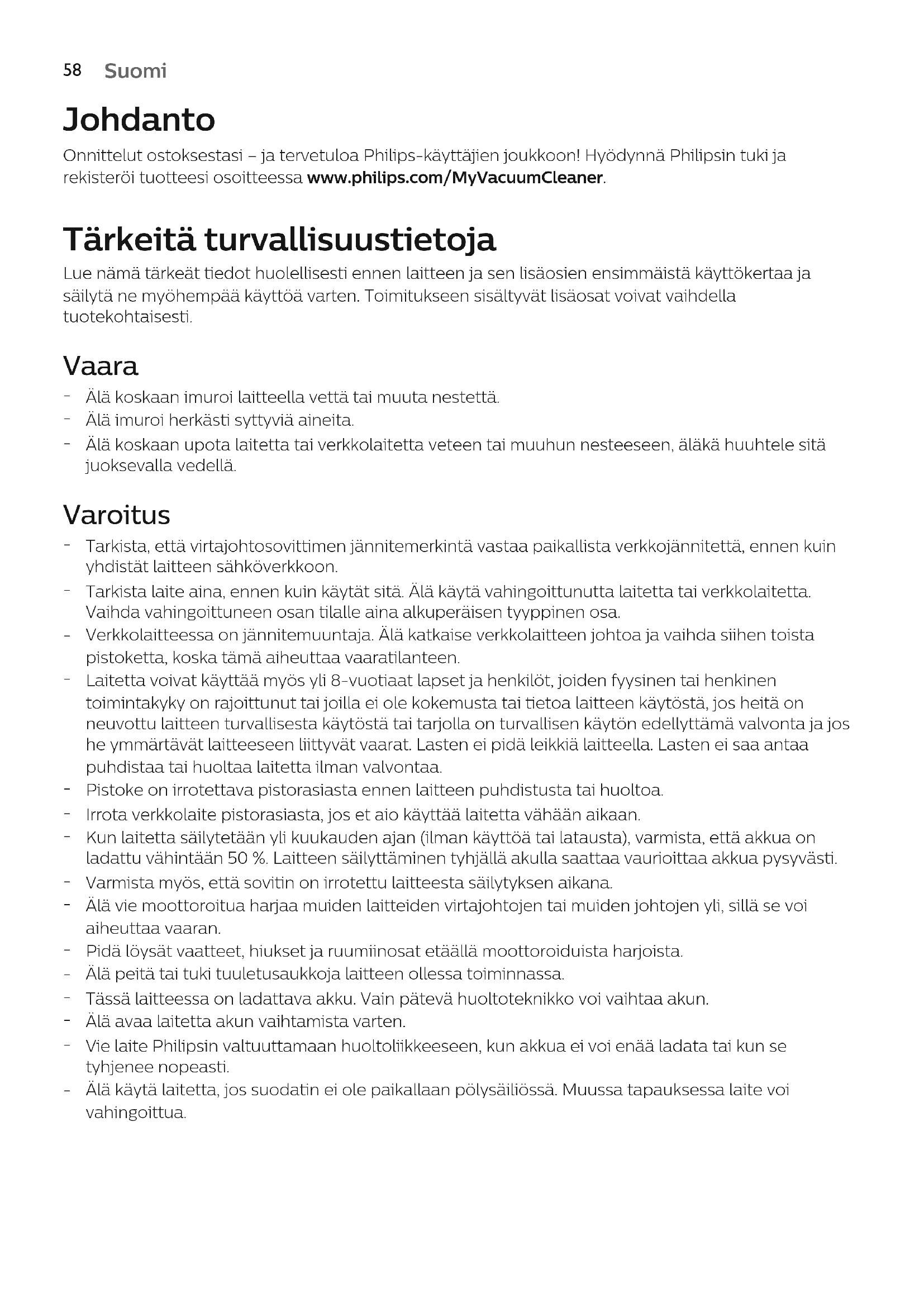 Suomi Johdanto Onnittelut ostoksestasi – ja tervetuloa Philips-käyttäjien joukkoon! Hyödynnä Philipsin tuki ja rekisteröi tuotteesi osoitteessa www.philips.com/MyVacuumCleaner. Tärkeitä turvallisuustietoja Lue nämä tärkeät tiedot huolellisesti ennen laitteen ja sen lisäosien ensimmäistä käyttökertaa ja säilytä ne myöhempää käyttöä varten. Toimitukseen sisältyvät lisäosat voivat vaihdella tuotekohtaisesti. Vaara