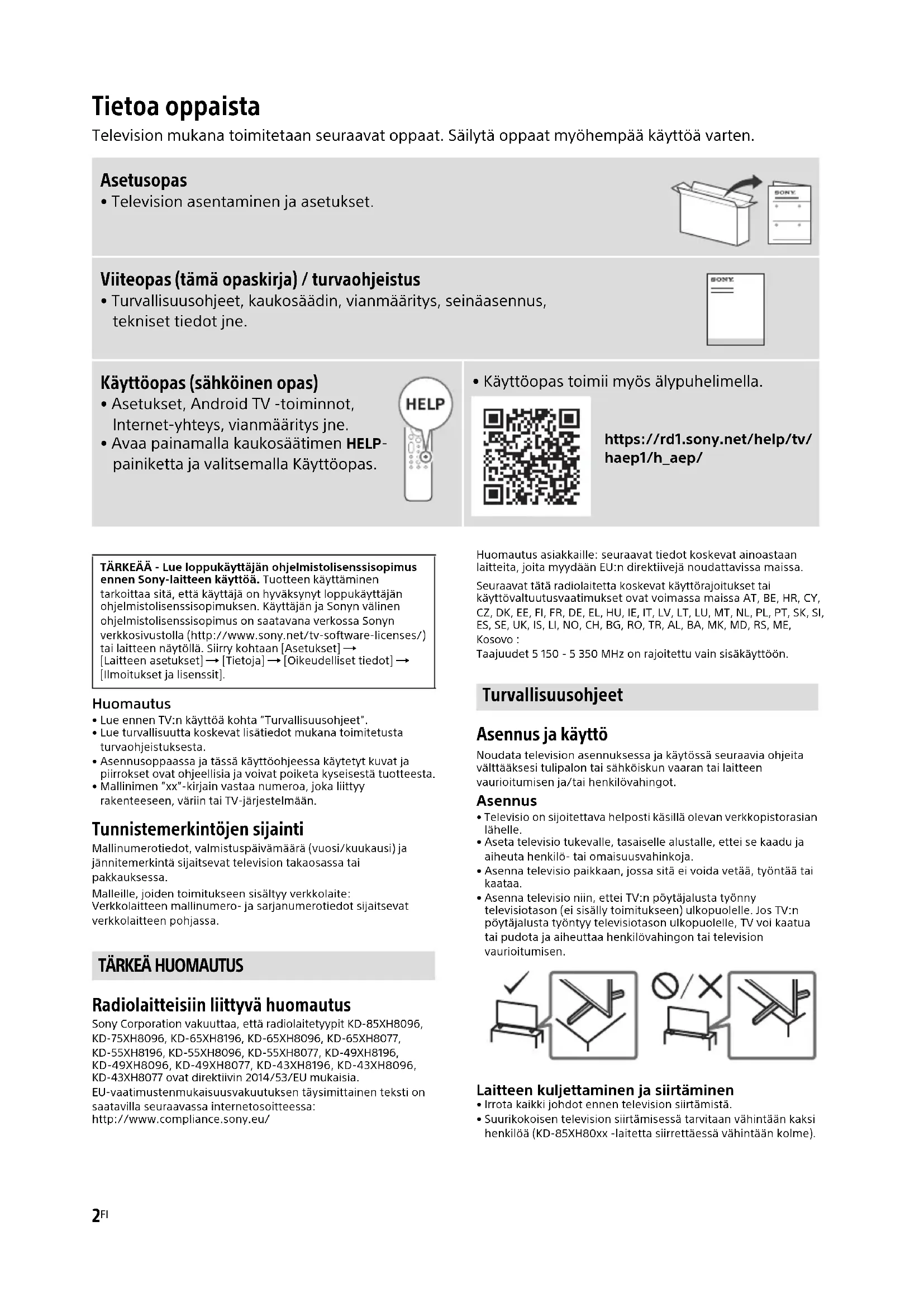 - Mallinimen ”xx”-kirjain vastaa numeroa, joka liittyy rakenteeseen, väriin tai TV-järjestelmään. Tunnistemerkintöjen sijainti Mallinumerotiedot, valmistuspäivämäärä (vuosi/kuukausi) ja jännitemerkintä sijaitsevat television takaosassa tai pakkauksessa. Malleille, joiden toimitukseen sisältyy verkkolaite: Verkkolaitteen mallinumero- ja sarjanumerotiedot sijaitsevat verkkolaitteen pohjassa. Radiolaitteisiin liittyvä huomautus Sony Corporation vakuuttaa, että radiolaitetyypit KD-85XH8096, KD-75XH8096, KD-65XH8196, KD-65XH8096, KD-65XH8077, KD-55XH8196, KD-55XH8096, KD-55XH8077, KD-49XH8196, KD-49XH8096, KD-49XH8077, KD-43XH8196, KD-43XH8096, KD-43XH8077 ovat direktiivin 2014/53/EU mukaisia. EU-vaatimustenmukaisuusvakuutuksen täysimittainen teksti on saatavilla seuraavassa internetosoitteessa: http://www.compliance.sony.eu/ Huomautus asiakkaille: seuraavat tiedot koskevat ainoastaan laitteita, joita myydään EU:n direktiivejä noudattavissa maissa. Seuraavat tätä radiolaitetta koskevat käyttörajoitukset tai käyttövaltuutusvaatimukset ovat voimassa maissa AT, BE, HR, CY, CZ, DK, EE, FI, FR, DE, EL, HU, IE, IT, LV, LT, LU, MT, NL, PL, PT, SK, SI, ES, SE, UK, IS, LI, NO, CH, BG, RO, TR, AL, BA, MK, MD, RS, ME, Kosovo : Taajuudet 5 150 - 5 350 MHz on rajoitettu vain sisäkäyttöön. Asennus ja käyttö Noudata television asennuksessa ja käytössä seuraavia ohjeita välttääksesi tulipalon tai sähköiskun vaaran tai laitteen vaurioitumisen ja/tai henkilövahingot. Asennus