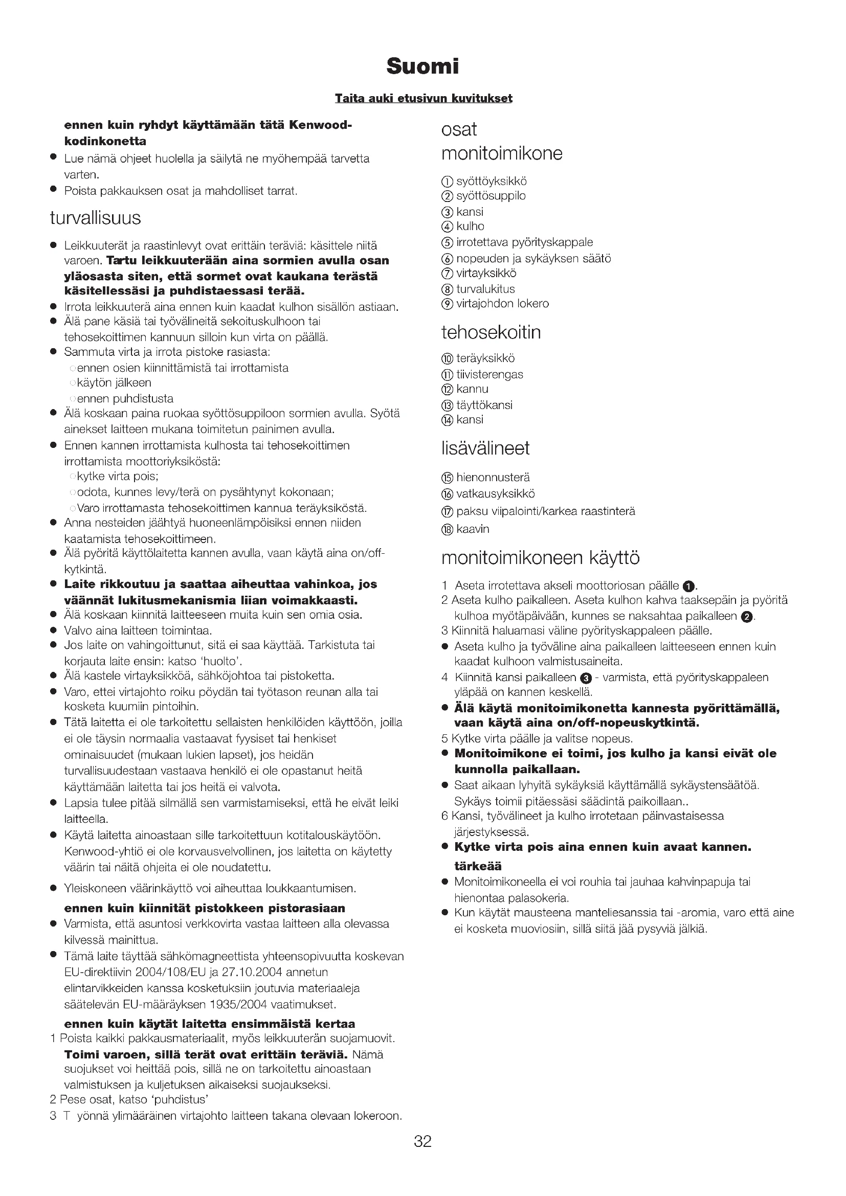 Käytä laitetta ainoastaan sille tarkoitettuun kotitalouskäytöön. Kenwood-yhtiö ei ole korvausvelvollinen, jos laitetta on käytetty väärin tai näitä ohjeita ei ole noudatettu.