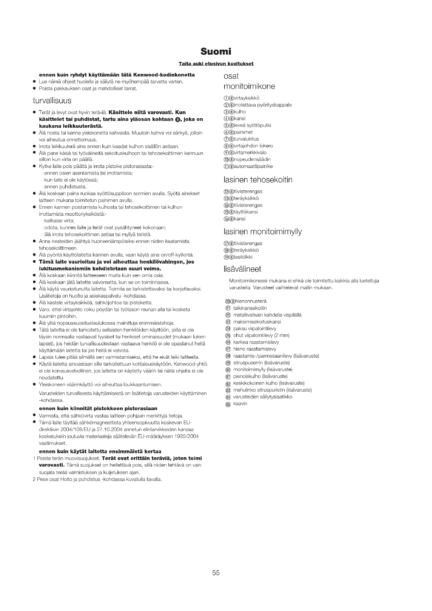 Ongelma Syy Ratkaisu Monitoimikone ei toimi Ei virtaa: virta- tai automaattinen-merkkivalo Tarkista, että pistotulppa on kytketty pistorasiaan. ei pala. Kulhoa ei ole kiinnitetty oikein. Tarkista, että kulho on kunnolla paikoillaan ja että kahva osoittaa oikealle. Kantta ei ole lukittu oikein. Tarkista, että kannen lukitus on kohdakkain kahvan kanssa. Kookasta työnnintä ei ole asetettu paikalleen. Sovita suuri työnnin paikalleen. Yleiskone ei toimi, jos kulho, kansi tai kookas työnnin ei ole kunnolla paikallaan. Jos kyseessä ei ole mikään yllä olevista, tarkista huoneistosi sulakkeet. Yleiskone pysähtyy tai hidastuu Ylikuormitussuojaus on lauennut. Katkaise virta, irrota pistoke pistorasiasta ja anna laitteen jäähtyä noin kesken kaiken Yleiskone on ylikuormitettu tai ylikuumentunut 15 minuuttia. käytön aikana. Enimmäiskapasiteetti on ylitetty. Suurimmat nopeudet näkyvät nopeuskaaviossa. Työvälineet/lisälaitteet Katso vihjeet asianomaisen lisälaitteen kohdasta osiossa ”lisälaitteiden käyttö”. Tarkista, että lisälaitteet on eivät toimi kunnolla. koottu oikein. Virtamerkkivalo vilkkuu Normaalikäyttö Tarkista, että lukitukset ovat tiukassa. Merkkivalo vilkkuu, jos kulho, kansi, mehulinko tai mylly ei ole kunnolla paikallaan tai niitä ei ole asetettu moottoriyksikköön. Automaattinen- ja Normaalikäyttö Tarkista, että lukitukset ovat tiukassa tai lopeta automaattinen toiminta virtamerkkivalo vilkkuuvat Merkkivalo vilkkuu, jos on valittu automaattinen painamalla Automaattinen-painiketta. toiminta mutta lukitukset ovat irti. vianetsintäohjeetHead Office Address: Kenwood Limited, New Lane, Havant, Hampshire PO9 2NH, UK www.kenwoodworld.com Designed and engineered by Kenwood in the UK Made in China 19169/4