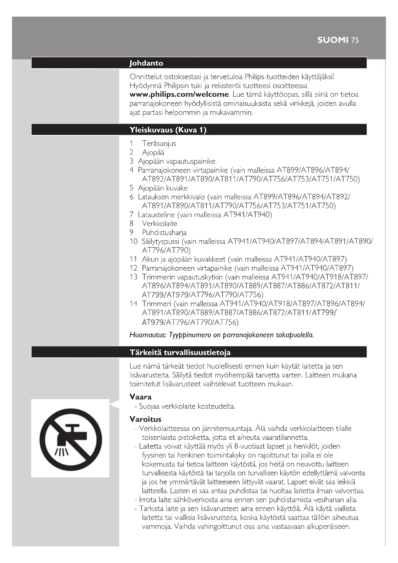 Johdanto Onnittelut ostoksestasi ja tervetuloa Philips-tuotteiden käyttäjäksi! Hyödynnä Philipsin tuki ja rekisteröi tuotteesi osoitteessa www.philips.com/welcome. Lue tämä käyttöopas, sillä siinä on tietoa parranajokoneen hyödyllisistä ominaisuuksista sekä vinkkejä, joiden avulla ajat partasi helpommin ja mukavammin. Yleiskuvaus (Kuva 1) 1 Teräsuojus 2 Ajopää 3 Ajopään vapautuspainike 4 Parranajokoneen virtapainike (vain malleissa AT899/AT896/AT894/ AT892/AT891/AT890/AT811/AT790/AT756/AT753/AT751/AT750) 5 Ajopään kuvake 6 Latauksen merkkivalo (vain malleissa AT899/AT896/AT894/AT892/ AT891/AT890/AT811/AT790/AT756/AT753/AT751/AT750) 7 Latausteline (vain malleissa AT941/AT940) 8 Verkkolaite 9 Puhdistusharja 10 Säilytyspussi (vain malleissa AT941/AT940/AT897/AT894/AT891/AT890/ AT796/AT790) 11 Akun ja ajopään kuvakkeet (vain malleissa AT941/AT940/AT897) 12 Parranajokoneen virtapainike (vain malleissa AT941/AT940/AT897) 13 Trimmerin vapautuskytkin (vain malleissa AT941/AT940/AT918/AT897/ AT896/AT894/AT891/AT890/AT889/AT887/AT886/AT872/AT811/ AT799/AT979/AT796/AT790/AT756) 14 Trimmeri (vain malleissa AT941/AT940/AT918/AT897/AT896/AT894/ AT891/AT890/AT889/AT887/AT886/AT872/AT811/ AT799/ AT979/AT796/AT790/AT756) Huomautus: Tyyppinumero on parranajokoneen takapuolella. Tärkeitä turvallisuustietoja Lue nämä tärkeät tiedot huolellisesti ennen kuin käytät laitetta ja sen lisävarusteita. Säilytä tiedot myöhempää tarvetta varten. Laitteen mukana toimitetut lisävarusteet vaihtelevat tuotteen mukaan. Vaara - Suojaa verkkolaite kosteudelta. Varoitus - Verkkolaitteessa on jännitemuuntaja. Älä vaihda verkkolaitteen tilalle toisenlaista pistoketta, jotta et aiheuta vaaratilannetta. - Laitetta voivat käyttää myös yli 8-vuotiaat lapset ja henkilöt, joiden fyysinen tai henkinen toimintakyky on rajoittunut tai joilla ei ole kokemusta tai tietoa laitteen käytöstä, jos heitä on neuvottu laitteen turvallisesta käytöstä tai tarjolla on turvallisen käytön edellyttämä valvonta ja jos he ymmärtävät laitteeseen liittyvät vaarat. Lapset eivät saa leikkiä laitteella. Lasten ei saa antaa puhdistaa tai huoltaa laitetta ilman valvontaa. - Irrota laite sähköverkosta aina ennen sen puhdistamista vesihanan alla. - Tarkista laite ja sen lisävarusteet aina ennen käyttöä. Älä käytä viallista laitetta tai viallisia lisävarusteita, koska käytöstä saattaa tällöin aiheutua vammoja. Vaihda vahingoittunut osa aina vastaavaan alkuperäiseen.76 Varoitus - Älä upota lataustelinettä veteen, äläkä huuhtele sitä vesihanan alla. - Käytä tätä laitetta vain tarkoituksenmukaisesti käyttöoppaassa esitetyllä tavalla. - Hygieniasyistä laitetta suositellaan vain yhden henkilön käyttöön. - Älä kytke verkkolaitetta pistorasiaan, jossa on tai on ollut sähköinen ilmanraikastin, jotta verkkolaite ei vaurioidu. Älä käytä verkkolaitetta kyseisten ilmanraikastimien läheisyydessä. - Älä käytä paineilmaa, naarmuttavia tai syövyttäviä puhdistusaineita tai -välineitä laitteen puhdistamiseen (kuten bensiiniä tai asetonia). - Parranajokoneen alaosassa olevasta liittimestä saattaa vuotaa vettä huuhtelun yhteydessä. Tämä on normaalia eikä siitä aiheudu vaaraa, koska kaikki elektroniset osat ovat tiiviissä virtayksikössä parranajokoneen sisällä. Sähkömagneettiset kentät (EMF) - Tämä Philips-laite vastaa kaikkia sähkömagneettisia kenttiä (EMF) koskevia standardeja ja säännöksiä. Yleistä - Tämä parranajokone on vesitiivis. Laite sopii käytettäväksi kylvyssä tai suihkussa, ja se voidaan puhdistaa juoksevalla vedellä. Turvallisuussyistä laitetta voi käyttää vain ilman johtoa. - Laite soveltuu 100–240 voltin verkkojännitteelle. - Verkkolaite muuttaa 100–240 voltin jännitteen turvalliseksi alle 24 voltin jännitteeksi. - Käyttöääni enintään: Lc = 69 dB (A) Lataaminen Huomautus: Laitetta ei voi käyttää suoraan verkkojännitteellä. Kun lataat parranajokoneen ensimmäisen kerran tai pitkän tauon jälkeen, anna sen latautua, kunnes latauksen merkkivalo palaa jatkuvasti. Katso parranajokoneen latausaika alla olevasta taulukosta. Latausaika 1 tunti 8 tuntia AT941, AT940, AT918 AT897, AT896, AT894 AT892, AT891, AT890 AT889, AT887, AT886 AT899, AT896, AT872 , AT799, AT797, AT796, AT790, AT770, AT756, AT753, AT751, AT750 AT811 Ajoaika saattaa olla taulukossa mainittua lyhyempi käyttömäärästä, puhdistustavoista ja partatyypistä riippuen. Käyttöaika 60 min 50 min 45 min 40 min. AT941 AT899 AT790, AT756, AT753 AT940 AT897, AT894, AT892 AT891, AT890, AT811, AT799 AT896 AT751, AT750 SUOMILatausilmaisimet Lataus vähissä - Mallit AT941/AT940/AT897: Kun akku on melkein tyhjä (kun käyttöaikaa on jäljellä 5 minuuttia tai vähemmän), oranssi akkukuvake alkaa vilkkua. Kun sammutat parranajokoneen, oranssi akkukuvake jatkaa vilkkumistaan muutaman sekunnin. - AT899, AT896, AT918, AT896, AT894, AT891, AT890, AT889, AT887, AT886, AT872, AT811, AT799, AT797, AT796, AT790, AT770, AT756,AT753, AT751, AT750: Kun akku on lähes tyhjä (jäljellä on enintään 5 minuuttia käyttöaikaa), latauksen merkkivalo alkaa vilkkua oranssina. Kun katkaiset parranajokoneesta virran, latauksen merkkivalo vilkkuu oranssina muutaman sekunnin. Pikalataus (vain mallit AT941, AT940, AT918, AT897, AT896, AT894, AT891, AT890, AT889, AT887, AT886, AT811) - Mallit AT941/AT940/AT897: Kun aloitat tyhjän akun lataamisen, akkukuvake vilkkuu oranssina ja valkoisena. Huomautus: Kun oranssina ja valkoisena vilkkuva akkukuvake vilkkuu ainoastaan valkoisena, voit käyttää laitetta kolmen minuutin ajan. - Mallit AT918, AT896, AT894, AT891, AT890, AT889, AT887, AT886, AT811: Kun aloitat tyhjän akun lataamisen, latauksen merkkivalo vilkkuu vuorotellen oranssina ja vihreänä. Huomautus: Kun oranssina ja vihreänä vilkkuva latauksen merkkivalo vilkkuu ainoastaan vihreänä, voit käyttää laitetta kolmen minuutin ajan. Lataaminen - Mallit AT