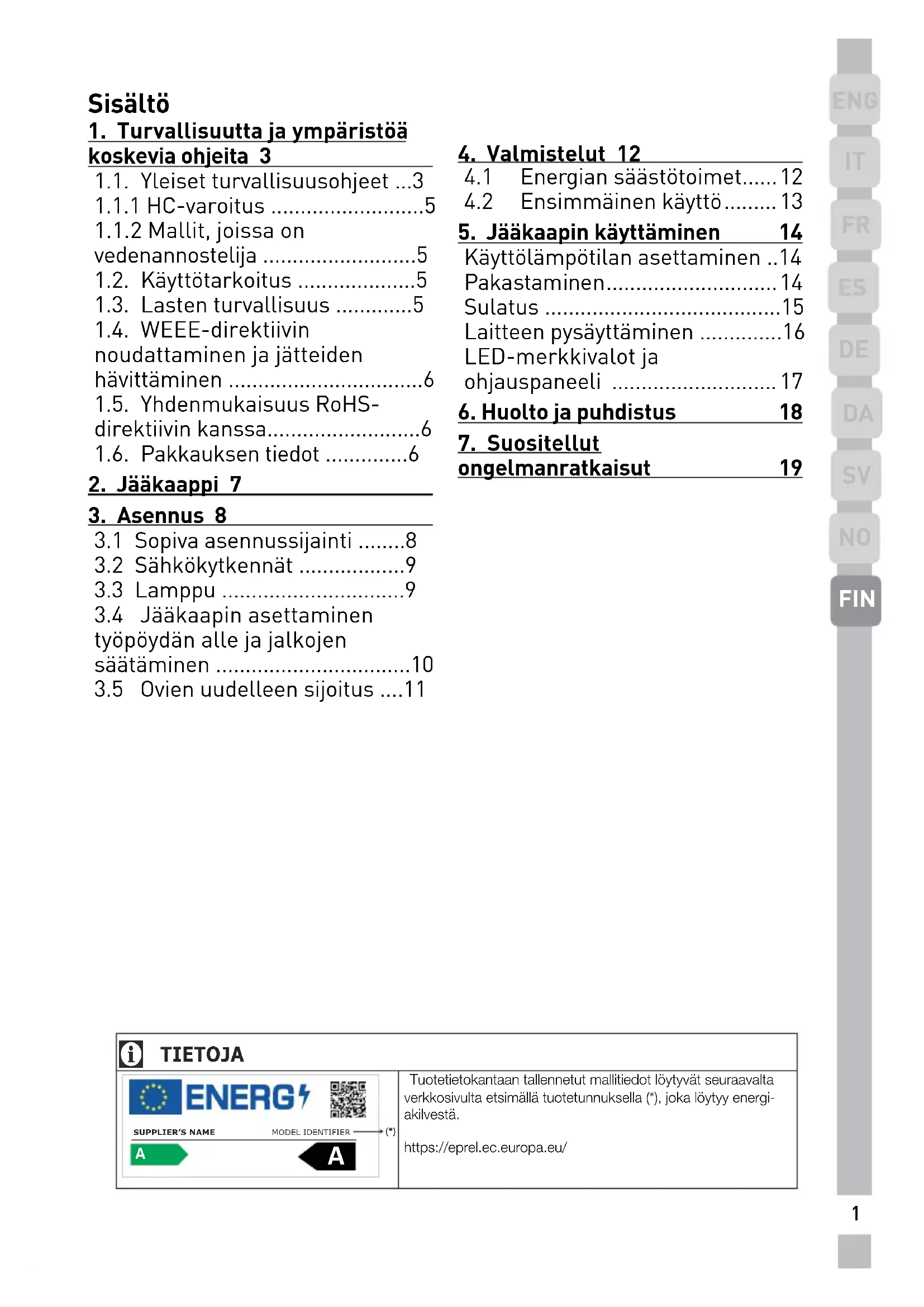 ongelmanratkaisut 19 Sisältö TIETOJA Tuotetietokantaan tallennetut mallitiedot löytyvät seuraavalta verkkosivulta etsimällä tuotetunnuksella (*), joka löytyy energi-akilvestä.https://eprel.ec.europa.eu/
