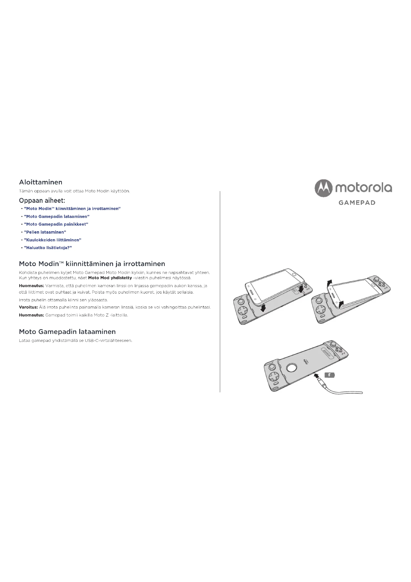 - ”Haluatko lisätietoja?” Moto Modin™ kiinnittäminen ja irrottaminen Kohdista puhelimen kyljet Moto Gamepad Moto Modin kylkiin, kunnes ne napsahtavat yhteen. Kun yhteys on muodostettu, näet Moto Mod yhdistetty -viestin puhelimesi näytössä. Huomautus: Varmista, että puhelimen kameran linssi on linjassa gamepadin aukon kanssa, ja että liittimet ovat puhtaat ja kuivat. Poista myös puhelimen kuoret, jos käytät sellaisia. Irrota puhelin ottamalla kiinni sen yläosasta. Varoitus: Älä irrota puhelinta painamalla kameran linssiä, koska se voi vahingoittaa puhelintasi. Huomautus: Gamepad toimii kaikilla Moto Z -laitteilla. Moto Gamepadin lataaminen Lataa gamepad yhdistämällä se USB-C-virtalähteeseen. GAMEPADLatauksen taso Merkkivalot osoittavat gamepadin latauksen tason. Merkkivalot Latausprosentti 4, täysi kirkkaus 100 4 75–100 3 50–75 2 25–50 1 0–25 Napsauta puhelimesi peliohjaimeen, niin Y-valo ilmoittaa, että puhelin latautuu. Gamepadin takaosa Y-valoMoto Gamepadin painikkeet Kun napsautat puhelimen gamepadiin, voit käyttää ja hallita täysin kaikkia gamepadin ominaisuuksia. Ota heti kaikki irti pelikokemuksesta. Huomautus: Ohjaimet voivat vaihdella pelin mukaan. Ohjaimet START-painike Pelin käynnistys. SELECT-painike Asetuksen valinta. HOME-painike Siirtyminen aloitusnäyttöön. Suuntapainikkeet Siirtyminen ylös, alas, vasemmalle tai oikealle. Toimintopainikkeet (X, Y, A ja B) Erilaisten toimintojen valinta. Ohjaussauva (vasen ja oikea) Kohteen siirtäminen ylös, alas, vasemmalle tai oikealle (sauvaa työntämällä). Valinta (sauvaa painamalla). Vasemmat painikkeet 1 ja 2 Valinta. Oikeat painikkeet 1 ja 2 Valinta. Huomautus: Ota merkkivalot käyttöön tai poista ne käytöstä painamalla pitkään Home- ja X-painikkeita. Pelien lataaminen Näin lataat pelejä puhelimeesi. Sijainti: Play Kauppa (tai App Center) Löydät yhteensopivia pelejä helposti Moto Game Explorer -sovelluksen avulla (tai LeStorella). Jos haluat Moto Game Explorer -sovelluksen, etsi Play Kaupasta hakutermiä ”Moto Game Explorer” ja asenna sovellus. Saat lisätietoja pelistä napauttamalla sitä. Lataa se sitten valitsemalla ASENNA tai OSTA. Merkkivalot Oikea painike 1 Oikea ohjaussauva Toimintopai- nikkeet (X, Y, A ja B) START-painike SELECT-painike Merkkivalot Vasen painike 1 Vasen ohjaussauva Suuntapai- nikkeet: ylös, alas, vasen ja oikea HOME-painike Oikea painike 2 Vasen painike 2Kuulokkeiden liittäminen Liitä kuulokkeet gamepadiin. Haluatko lisätietoja?