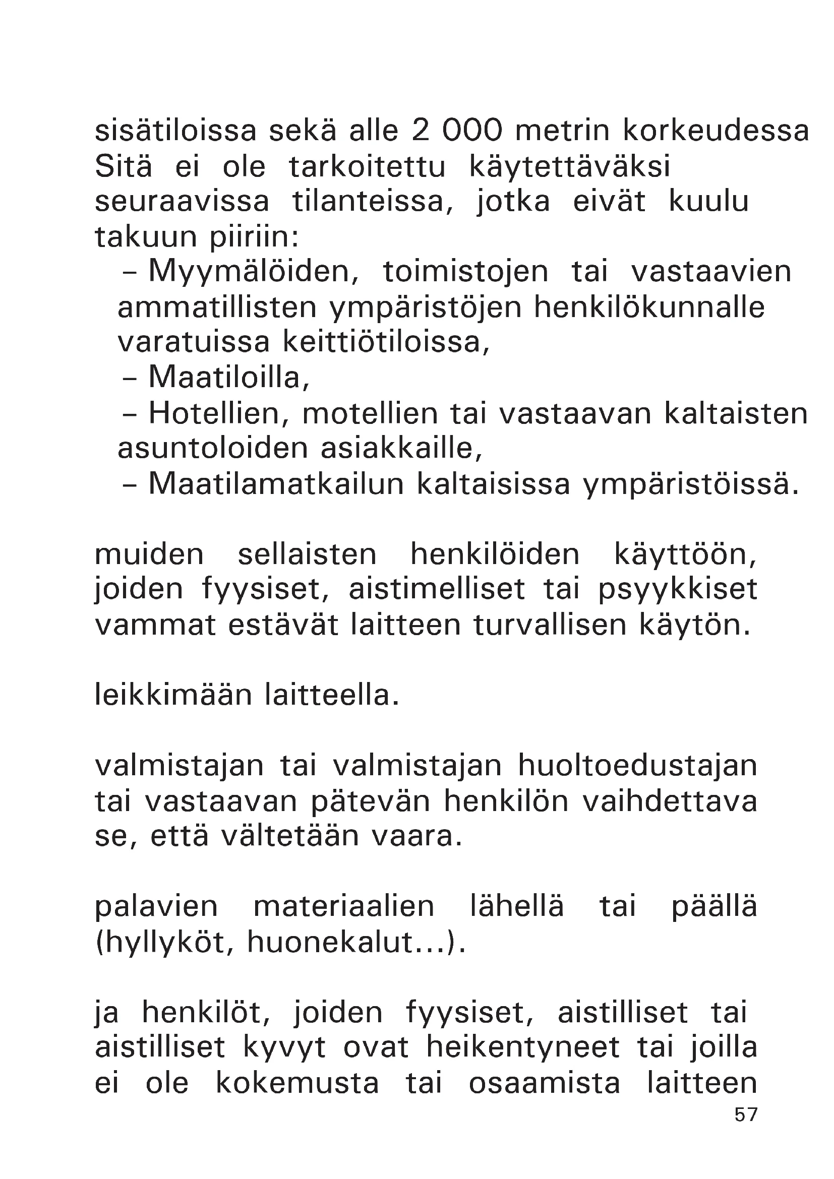 - Mallista riippuen TEE NÄIN: Lue käyttöohje perusteellisesti ja seuraa tarkkaan siinä annettuja neuvoja ja suosituksia. Laite saa olla vain pystyasennossa, ei koskaan sivuttain, kallellaan tai ylösalaisin. Joka kerta, kun käytät laitetta, tarkista, että murulaatikko on oikein sijoitettu paikkaansa.59 ÄLÄ TEE NÄIN: Älä aseta johtoa tai pistorasiaa laitteen sisällä olevien metalliristikkojen väliin. Älä kytke laitetta pois virrasta vetämällä johdosta. Älä lämmitä ruokia leivänpaahtimen päällä. Älä laita pannuja tai kansia leivänpaahtimen päälle, kun se on toiminnassa. Laitetta ei saa kantaa eikä siirtää pois paikaltaan käytön aikana. Käytä laitetta vain kotona. Vältä kosteita paikkoja. Älä anna laitteen koskaan toimia ilman valvontaa, erityisesti kun paahdat sillä ensimmäistä kertaa tai kun olet muuttanut säätöä. Älä käytä laitetta muuhun kuin sille varattuun käyttöön. Älä koske laitteen metallisiin tai kuumentuviin osiin sen ollessa käytössä. Älä liitä leivänpaahtimeen lisälaitteita, joita valmistaja ei suosittele, sillä ne voivat olla vaarallisia. Mitään leivänpaahtimen osaa ei saa pestä astianpesukoneessa eikä upottaa veteen. Älä paahda leipiä, jotka voivat sulaa (joiden päällä on kuorrutusta) tai jotka voivat valua paahtimeen, ne voivat nimittäin aiheuttaa vahinkoa tai palovaaran. Älä työnnä laitteeseen liian suuria leipäviipaleita, jotka voivat sulkea paahtomekanismin. Älä käytä laitetta, jos: – sen johto on viallinen, – laite on pudonnut ja siinä esiintyy näkyviä vikoja tai tomintavirheitä. Kaikissa näissä tapauksissa laite on lähetettävä huoltoon vaaran välttämiseksi. Katso laitteen takuupapereita. Leivänpaahdinta ei saa asettaa kuumien pintojen päälle. Älä peitä laitetta, kun se on toiminnassa. Laitetta käytettäessä sitä on valvottava. Laitteen päälle eikä alle ei saa koskaan asettaa paperia, pahvia tai muovia. Jos jotkut osat syttyvät palamaan, niitä ei saa missään tapauksessa yrittää sammuttaa vedellä. Laite on kytkettävä irti ja liekit tukahdutettava kostealla vaatteella. Älä koskaan yritä ottaa leipää pois, kun paahtamisjakso on käynnissä. Älä käytä leivänpaahdinta lämmönlähteenä tai kuivatukseen. Älä käytä leivänpaahdinta pakasteruokien kypsennykseen, grillaukseen, lämmitykseen tai sulatukseen. Älä käytä laitetta samanaikaisesti leivän paahtamiseen ja viinerleipien lämmitykseen (mallista riippuen). Älä käytä laitetta samanaikaisesti leivän paahtamiseen ja leivonnaisten lämmittämiseen (mallista riippuen). Metallituki voi olla hyvin kuuma. Vältä sen koskemista. Käytä käsinettä tai leipäpihtejä (mallista riippuen). Älä käytä hoidossa voimakasta puhdistusainetta (soodapitoista puhdistusainetta, metallinhoitoaineita, natriumhydroksidipitoistapuhdistusainetta) tai metalliesineitä, hankaussieniä tai hankaavia tyynyjä. Metallipinnoitteiset laitteet: Älä käytä metallien erikoishoitoaineita (ruostumaton teräs, kupari) vaan pehmeää kangasta ja ikkunanpesuainetta. Älä koskaan pidä leivänpaahdinta siten, että työnnät sormesi leipäaukkoihin. Tyhjennä säännöllisesti murut luukusta tai murulaatikosta. Laatikon kiskon ohjauspainikkeen on oltava yläasennossa silloin, kun kytket laitteen päälle tai pois päältä. Kytke laite pois päältä, jos siihen on tullut toimintavirhe. Kytke laite pois päältä, kun et käytä sitä ja ennen kuin alat puhdistaa sitä. Jos sattuu, että paahtamisen loputtua leipäviipaleet jäävät loukkuun metalliristikkojen väliin, kytke laite pois päältä ja odota, kunnes se jäähtyy, ennen kuin poistat siitä leivät. Käytä tukevaa työalustaa suojassa vesiroiskeilta, älä missään tapauksessa upota laitetta keittiökalusteisiin.60