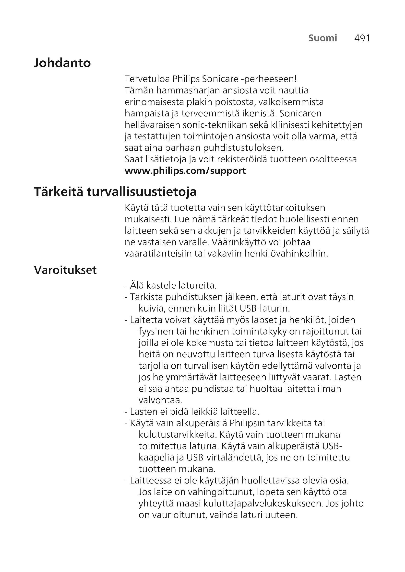 Suomi Johdanto Tervetuloa Philips Sonicare ‑perheeseen! Tämän hammasharjan ansiosta voit nauttia erinomaisesta plakin poistosta, valkoisemmista hampaista ja terveemmistä ikenistä. Sonicaren hellävaraisen sonic-tekniikan sekä kliinisesti kehitettyjen ja testattujen toimintojen ansiosta voit olla varma, että saat aina parhaan puhdistustuloksen. Saat lisätietoja ja voit rekisteröidä tuotteen osoitteessa www.philips.com/support Tärkeitä turvallisuustietoja Käytä tätä tuotetta vain sen käyttötarkoituksen mukaisesti. Lue nämä tärkeät tiedot huolellisesti ennen laitteen sekä sen akkujen ja tarvikkeiden käyttöä ja säilytä ne vastaisen varalle. Väärinkäyttö voi johtaa vaaratilanteisiin tai vakaviin henkilövahinkoihin. Varoitukset - Älä kastele latureita. - Tarkista puhdistuksen jälkeen, että laturit ovat täysin kuivia, ennen kuin liität USB-laturin. - Laitetta voivat käyttää myös lapset ja henkilöt, joiden fyysinen tai henkinen toimintakyky on rajoittunut tai joilla ei ole kokemusta tai tietoa laitteen käytöstä, jos heitä on neuvottu laitteen turvallisesta käytöstä tai tarjolla on turvallisen käytön edellyttämä valvonta ja jos he ymmärtävät laitteeseen liittyvät vaarat. Lasten ei saa antaa puhdistaa tai huoltaa laitetta ilman valvontaa. - Lasten ei pidä leikkiä laitteella. - Käytä vain alkuperäisiä Philipsin tarvikkeita tai kulutustarvikkeita. Käytä vain tuotteen mukana toimitettua laturia. Käytä vain alkuperäistä USB- kaapelia ja USB-virtalähdettä, jos ne on toimitettu tuotteen mukana. - Laitteessa ei ole käyttäjän huollettavissa olevia osia. Jos laite on vahingoittunut, lopeta sen käyttö ota yhteyttä maasi kuluttajapalvelukeskukseen. Jos johto on vaurioitunut, vaihda laturi uuteen.492 Suomi - Älä käytä latureita ulkona tai lämmönlähteiden lähellä. - Älä puhdista mitään tuotteen osaa astianpesukoneessa. - Laite on suunniteltu ainoastaan hampaiden, ikenien ja kielen puhdistamiseen. - Lopeta harjaspään käyttö, jos ilmenee katkenneita tai taipuneita harjaksia. Vaihda harjaspää 3 kuukauden välein tai useammin, jos ilmenee merkkejä kulumisesta. - Vältä suoraa kosketusta tuotteisiin, jotka sisältävät eteerisiä öljyjä tai kookosöljyä. Niiden koskettaminen voi johtaa harjasten irtoamiseen. - Lopeta laitteen käyttö ja kysy neuvoa hammaslääkäriltä tai lääkäriltä, jos käytön jälkeen ilmenee voimakasta verenvuotoa, jos verenvuoto jatkuu viikon käytön jälkeen tai jos laitteen käyttö tuntuu epämukavalta tai aiheuttaa kipua. - Jos olet ollut hammas- tai ienleikkauksessa viimeisten kahden kuukauden aikana, kysy neuvoa hammaslääkäriltä ennen laitteen käyttöä. - Jos sinulla on sydämentahdistin tai muu kehonsisäinen laite, kysy neuvoa lääkäriltä tai kyseisen laitteen valmistajalta ennen käyttöä. - Jos epäröit käyttää laitetta terveydellisistä syistä, neuvottele laitteen käytöstä ensin lääkärin kanssa. - Laite on tarkoitettu henkilökohtaiseen käyttöön eikä sitä ole tarkoitettu potilaiden yleiseen käyttöön hammashoitoloissa tai sairaaloissa. Paristojen ja akkujen turvallisuusohjeet - Tässä laitteessa on akkuja, jotka voi poistaa vain ammattilainen. - Käytä tätä tuotetta vain sen käyttötarkoituksen mukaisesti. Lue nämä tiedot huolellisesti ennen laitteen sekä sen akkujen ja tarvikkeiden käyttöä ja säilytä ne vastaisen varalle. Väärinkäyttö voi johtaa vaaratilanteisiin tai vakaviin henkilövahinkoihin. Toimitukseen sisältyvät tarvikkeet voivat vaihdella tuotekohtaisesti.493 Suomi - Käytä vain alkuperäisiä Philipsin tarvikkeita ja kulutustarvikkeita. Käytä vain irrotettavaa virtalähdettä CBAyyyy, TCAxxxx tai WAAxxxx. - Suojaa tuote ja akut tulelta äläkä altista niitä suoralle auringonvalolle tai korkeille lämpötiloille. - Jos tuote kuumenee epätavallisen paljon, siitä tulee hajua, se muuttaa väriä tai jos lataaminen kestää tavallista pidempään, lopeta tuotteen käyttö ja lataaminen ja ota yhteyttä Philipsiin. - Älä laita tuotteita ja niiden paristoja tai akkuja mikroaaltouuneihin tai induktioliesille. - Älä avaa, muuta, puhkaise, vahingoita tai pura tuotetta tai akkuja, sillä tämä saattaa aiheuttaa niiden ylikuumenemisen tai myrkyllisiä tai vaarallisia vuotoja niistä. Älä aiheuta akkuihin oikosulkua, ylilataa niitä tai lataa niitä käänteisesti. - Tämän laitteen akkuja ei voi vaihtaa. Kun akku on kulunut loppuun, laite on hävitettävä asianmukaisesti. Perehdy kierrätystä käsittelevään osioon. - Jos paristot tai akut ovat vahingoittuneet tai ne vuotavat, vältä paristo- tai akkunesteen joutumista iholle tai silmiin. Jos näin kuitenkin käy, huuhtele iho tai silmät välittömästi runsaalla vedellä ja hakeudu lääkäriin. - Kun käsittelet paristoja tai akkuja, varmista, että kätesi, tuote ja paristot tai akut ovat kuivat. - Jotta paristoissa tai akuissa ei niiden poistamisen jälkeen pääse vahingossa syntymään oikosulkua, älä anna pariston tai akun liittimien koskettaa metalliesineitä (esim. kolikoita, hiussolkia tai sormuksia). Älä kääri paristoja tai akkuja alumiinifolioon. Teippaa pariston tai akun liittimet tai laita paristot tai akut muovipussiin ennen niiden hävittämistä. - Lataa ja käytä tuotetta 0–40 °C:n lämpötilassa. Säilytys ja kuljetus Lämpötila -10–60 °C. Sähkömagneettiset kentät (EMF) Tämä Philips-laite vastaa kaikkia sähkömagneettisia kenttiä (EMF) koskevia standardeja ja säännöksiä.494 Suomi Radiolaitedirektiivi Philips vakuuttaa täten, että radiolaitteistolla (Bluetooth, NFC) varustetut sähköhammasharjat ovat direktiivin 2014/53/EU ehtojen mukaisia. - Sovellettavien tuotteiden Bluetooth- radiotaajuusliittymä toimii 2,4GHz:n taajuudella. - Bluetooth-laitteen enimmäislähtöteho on 3 dBm. - Sovellettavien tuotteiden NFC-radiotaajuusliittymä toimii 13,56MHz:n taajuudella. - Laitteen suurin RF-lähetysteho on 30,16 dBm. E