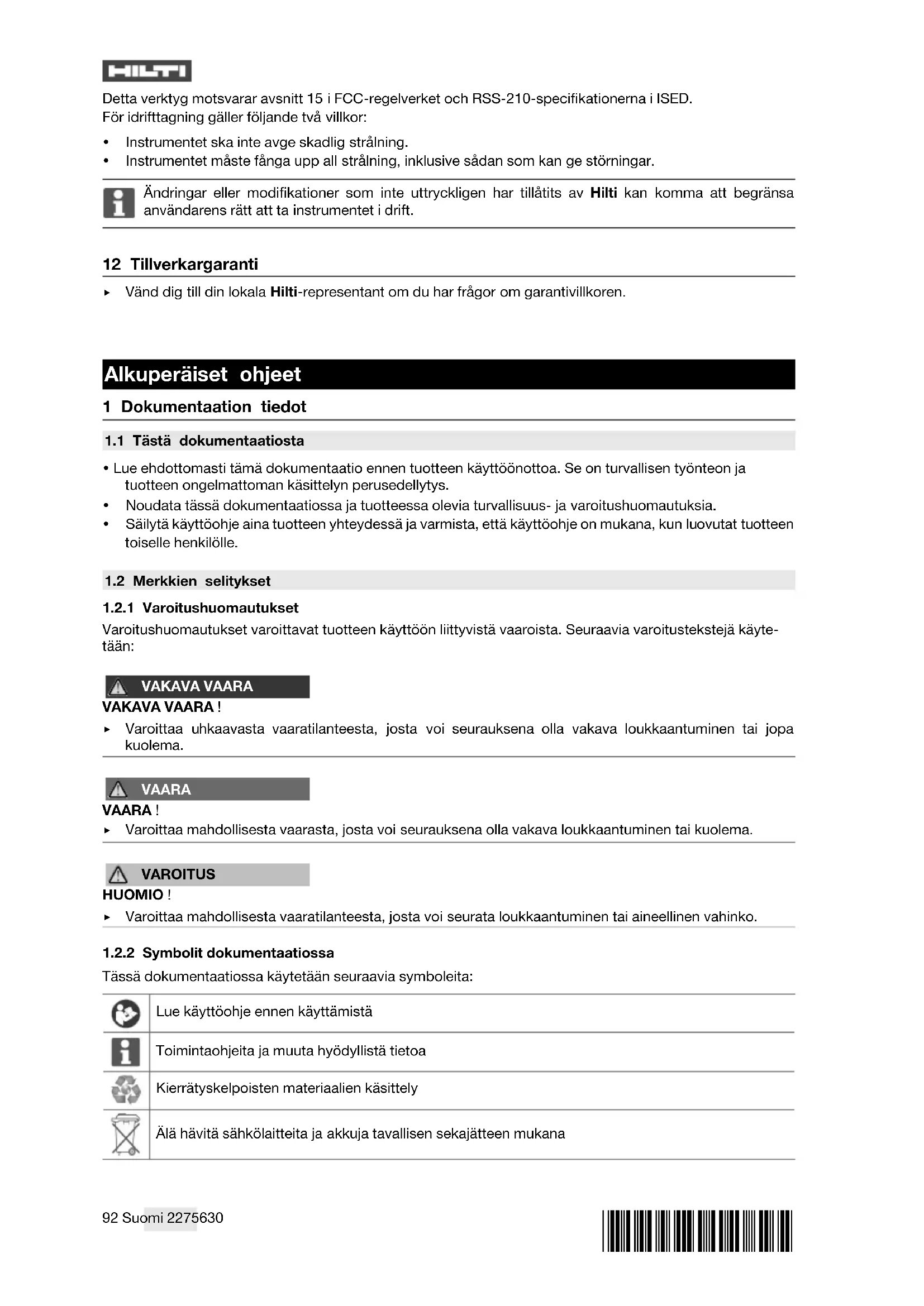 Vakuutamme, että tässä kuvattu tuote täyttää voimassa olevien direktiivien ja standardien vaatimukset.94 Suomi 2275630 *2275630* Edellytykset: Ei USA Kuva vaatimustenmukaisuusvakuutuksesta on tämän dokumentaation lopussa. Tekninen dokumentaatio löytyy tästä: Hilti Entwicklungsgesellschaft mbH | Zulassung Geräte | Hiltistraße 6 | 86916 Kaufering, DE 2 Turvallisuus