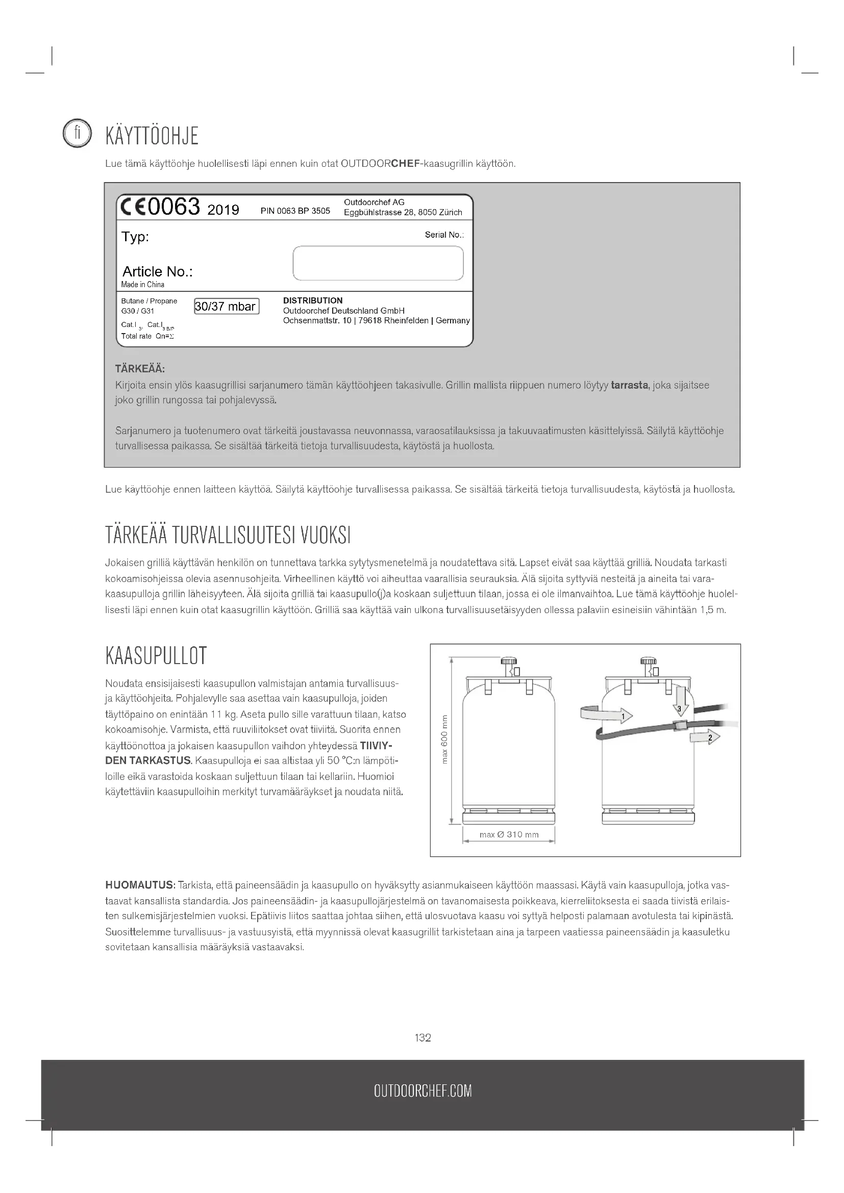 Lue tämä käyttöohje huolellisesti läpi ennen kuin otat OUTDOORCHEF-kaasugrillin käyttöön. Lue käyttöohje ennen laitteen käyttöä. Säilytä käyttöohje turvallisessa paikassa. Se sisältää tärkeitä tietoja turvallisuudesta, käytöstä ja huollosta.