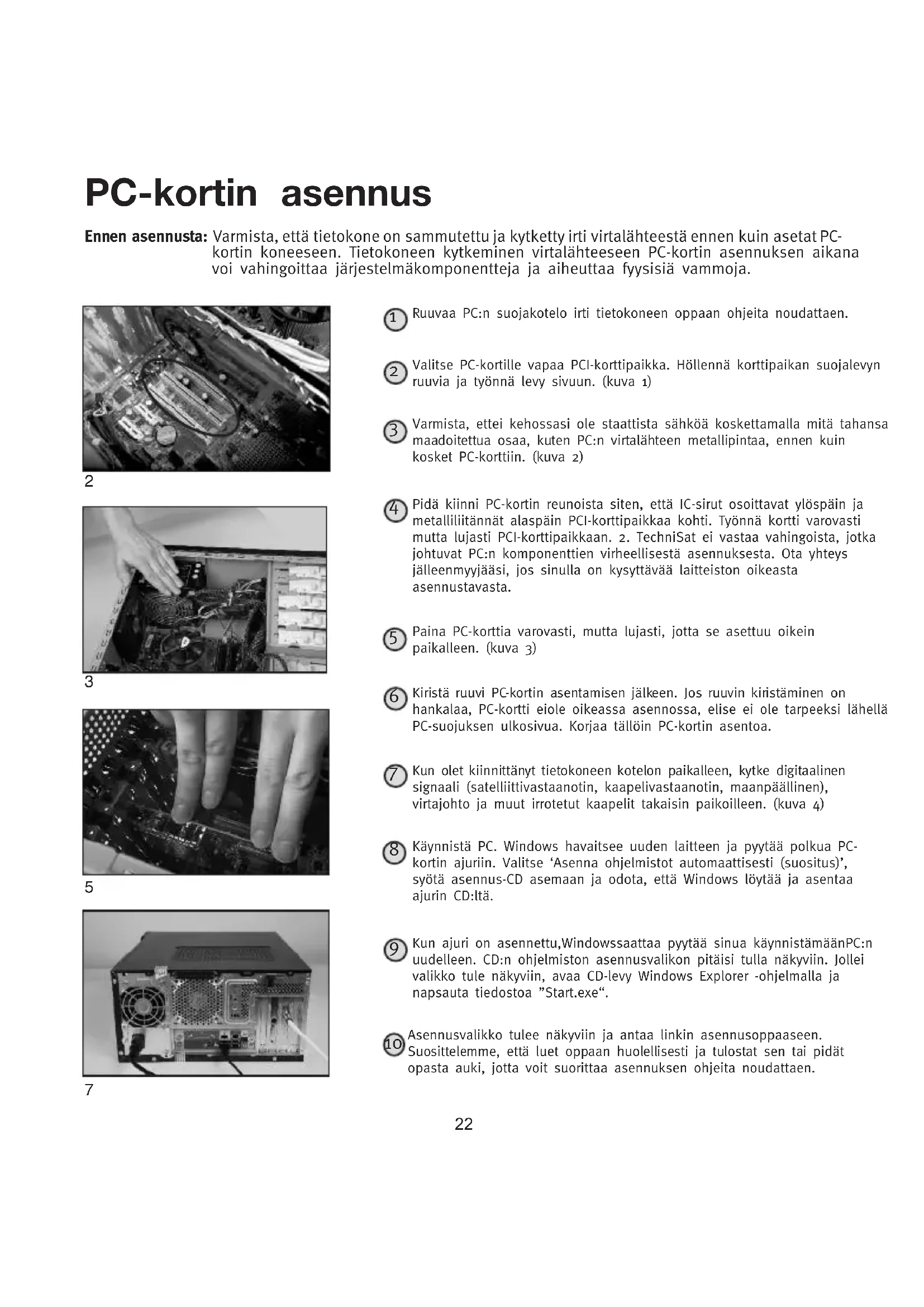 Käynnistä PC. Windows havaitsee uuden laitteen ja pyytää polkua PC- kortin ajuriin. Valitse ‘Asenna ohjelmistot automaattisesti (suositus)’, syötä asennus-CD asemaan ja odota, että Windows löytää ja asentaa ajurin CD:ltä. Pidä kiinni PC-kortin reunoista siten, että IC-sirut osoittavat ylöspäin ja metalliliitännät alaspäin PCI-korttipaikkaa kohti. Työnnä kortti varovasti mutta lujasti PCI-korttipaikkaan. 2. TechniSat ei vastaa vahingoista, jotka johtuvat PC:n komponenttien virheellisestä asennuksesta. Ota yhteys jälleenmyyjääsi, jos sinulla on kysyttävää laitteiston oikeasta asennustavasta. PC-kortin asennus