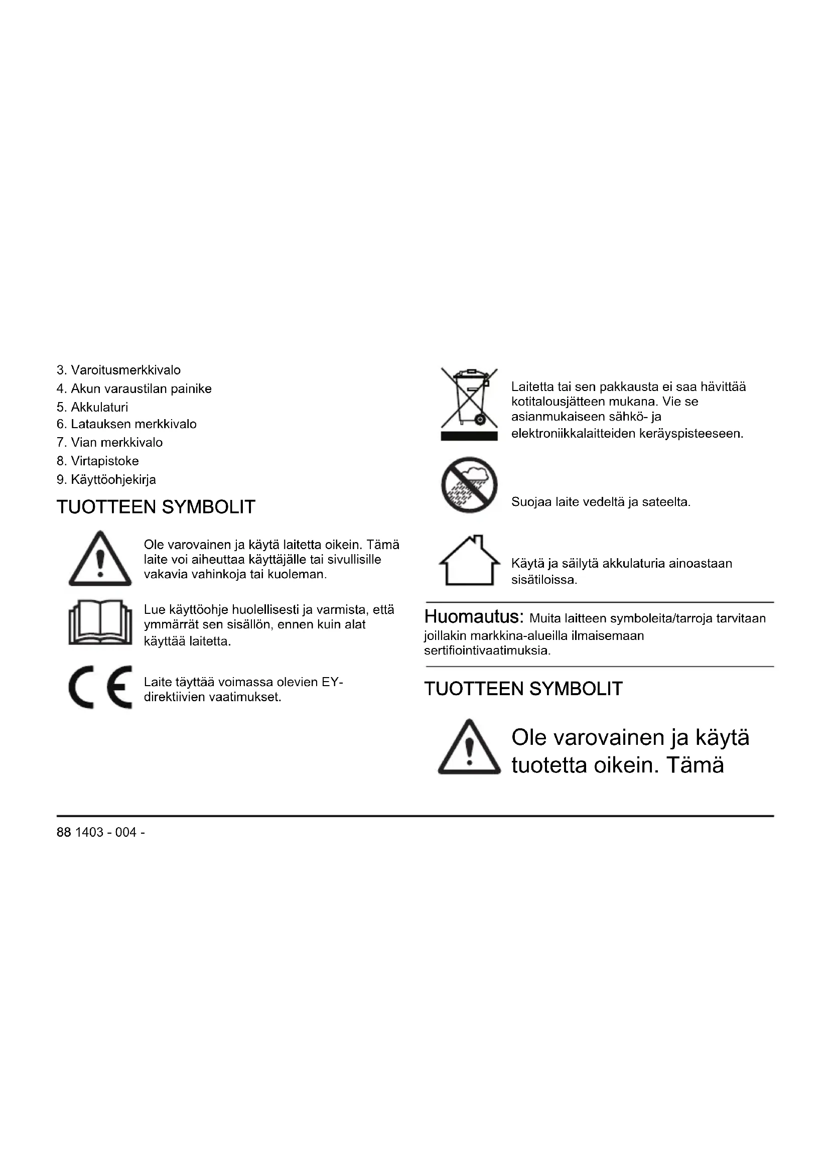 TUOTTEEN SYMBOLIT Ole varovainen ja käytä laitetta oikein. Tämä laite voi aiheuttaa käyttäjälle tai sivullisille vakavia vahinkoja tai kuoleman. Lue käyttöohje huolellisesti ja varmista, että ymmärrät sen sisällön, ennen kuin alat käyttää laitetta. Laite täyttää voimassa olevien EY- direktiivien vaatimukset. Laitetta tai sen pakkausta ei saa hävittää kotitalousjätteen mukana. Vie se asianmukaiseen sähkö- ja elektroniikkalaitteiden keräyspisteeseen. Suojaa laite vedeltä ja sateelta. Käytä ja säilytä akkulaturia ainoastaan sisätiloissa. Huomautus: Muita laitteen symboleita/tarroja tarvitaan joillakin markkina-alueilla ilmaisemaan sertifiointivaatimuksia. TUOTTEEN SYMBOLIT Ole varovainen ja käytä tuotetta oikein. Tämä 88 1403 - 004 -laite voi aiheuttaa käyttäjälle tai sivullisille vakavia vahinkoja tai kuoleman. Lue käyttöohje huolellisesti ja varmista, että ymmärrät sen sisällön, ennen kuin alat käyttää laitetta. Suojaa laite vedeltä ja sateelta. Käytä ja säilytä akkulaturia ainoastaan sisätiloissa. Huomautus: Muita laitteen symboleita/tarroja tarvitaan joillakin markkina-alueilla ilmaisemaan sertifiointivaatimuksia.
