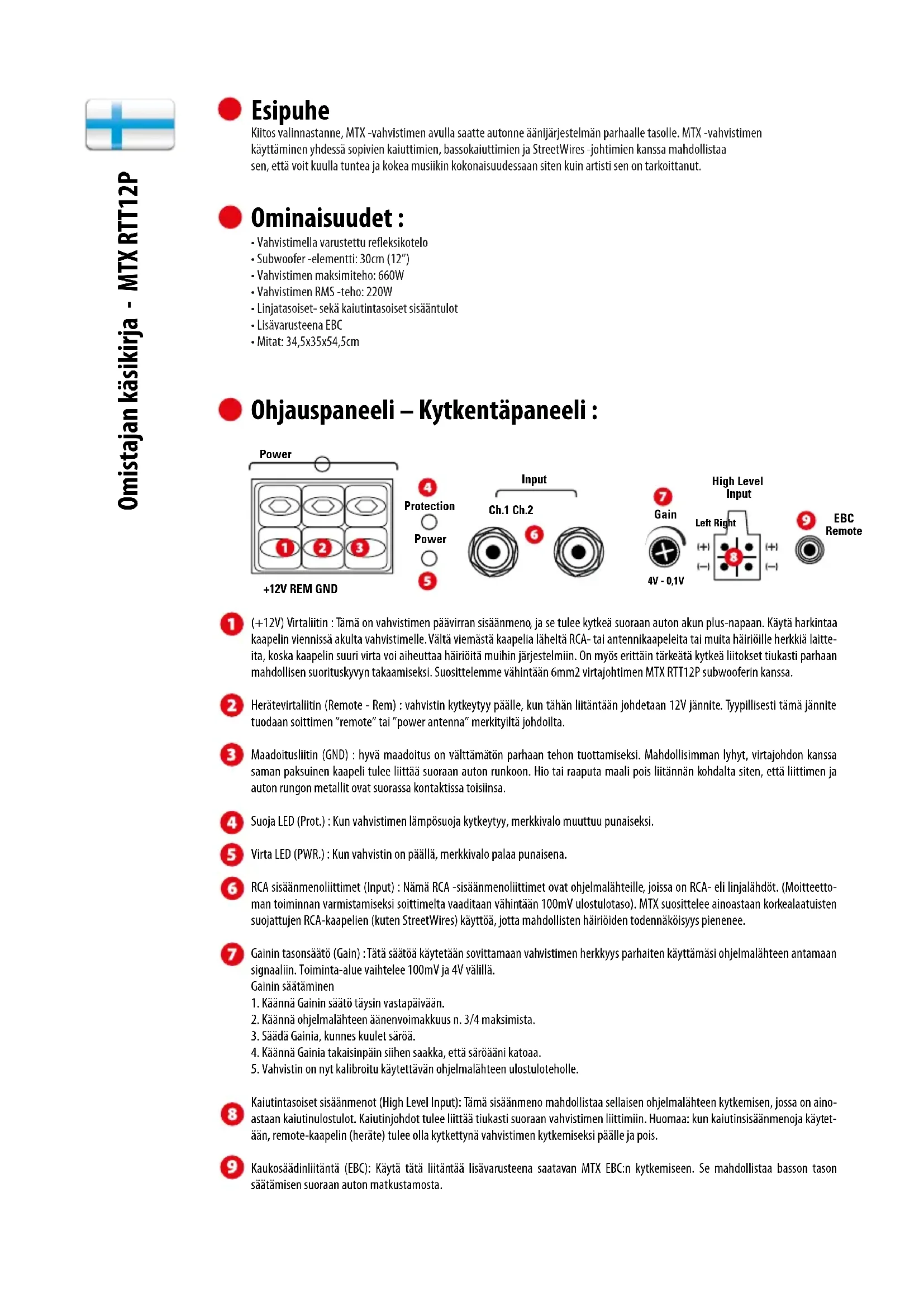 - Mitat: 34,5x35x54,5cm (+12V) Virtaliitin : Tämä on vahvistimen päävirran sisäänmeno, ja se tulee kytkeä suoraan auton akun plus-napaan. Käytä harkintaa kaapelin viennissä akulta vahvistimelle. Vältä viemästä kaapelia läheltä RCA- tai antennikaapeleita tai muita häiriöille herkkiä laitte- ita, koska kaapelin suuri virta voi aiheuttaa häiriöitä muihin järjestelmiin. On myös erittäin tärkeätä kytkeä liitokset tiukasti parhaan mahdollisen suorituskyvyn takaamiseksi. Suosittelemme vähintään 6mm2 virtajohtimen MTX RTT12P subwooferin kanssa. Herätevirtaliitin (Remote - Rem) : vahvistin kytkeytyy päälle, kun tähän liitäntään johdetaan 12V jännite. Tyypillisesti tämä jännite tuodaan soittimen ”remote” tai ”power antenna” merkityiltä johdoilta. Maadoitusliitin (GND) : hyvä maadoitus on välttämätön parhaan tehon tuottamiseksi. Mahdollisimman lyhyt, virtajohdon kanssa saman paksuinen kaapeli tulee liittää suoraan auton runkoon. Hio tai raaputa maali pois liitännän kohdalta siten, että liittimen ja auton rungon metallit ovat suorassa kontaktissa toisiinsa. Suoja LED (Prot.) : Kun vahvistimen lämpösuoja kytkeytyy, merkkivalo muuttuu punaiseksi. Virta LED (PWR.) : Kun vahvistin on päällä, merkkivalo palaa punaisena. RCA sisäänmenoliittimet (Input) : Nämä RCA -sisäänmenoliittimet ovat ohjelmalähteille, joissa on RCA- eli linjalähdöt. (Moitteetto- man toiminnan varmistamiseksi soittimelta vaaditaan vähintään 100mV ulostulotaso). MTX suosittelee ainoastaan korkealaatuisten suojattujen RCA-kaapelien (kuten StreetWires) käyttöä, jotta mahdollisten häiriöiden todennäköisyys pienenee. Gainin tasonsäätö (Gain) : Tätä säätöä käytetään sovittamaan vahvistimen herkkyys parhaiten käyttämäsi ohjelmalähteen antamaan signaaliin. Toiminta-alue vaihtelee 100mV ja 4V välillä. Gainin säätäminen