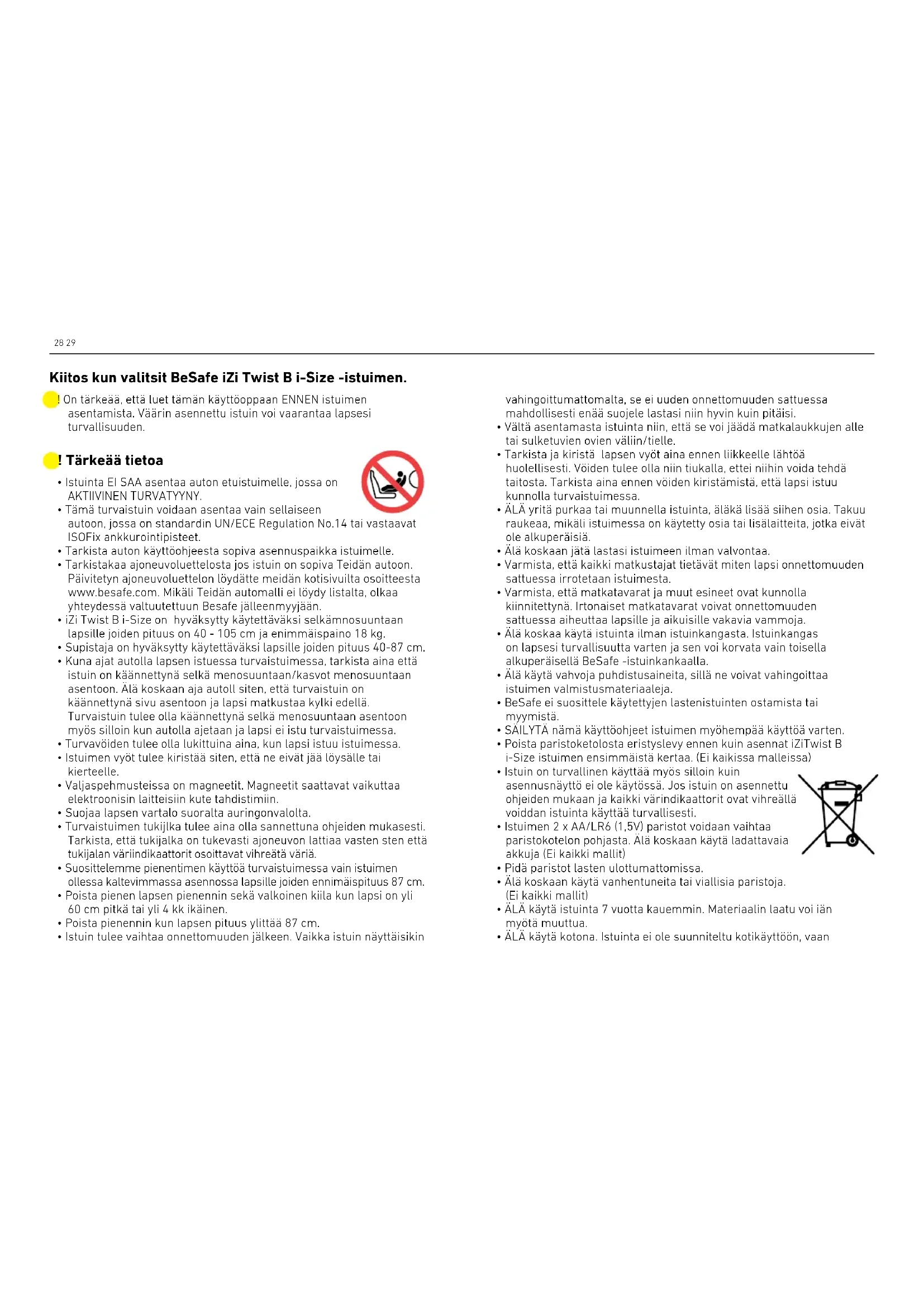 - ÄLÄ käytä kotona. Istuinta ei ole suunniteltu kotikäyttöön, vaan ! On tärkeää, että luet tämän käyttöoppaan ENNEN istuimen asentamista. Väärin asennettu istuin voi vaarantaa lapsesi turvallisuuden. Kiitos kun valitsit BeSafe iZi Twist B i-Size -istuimen.30 31