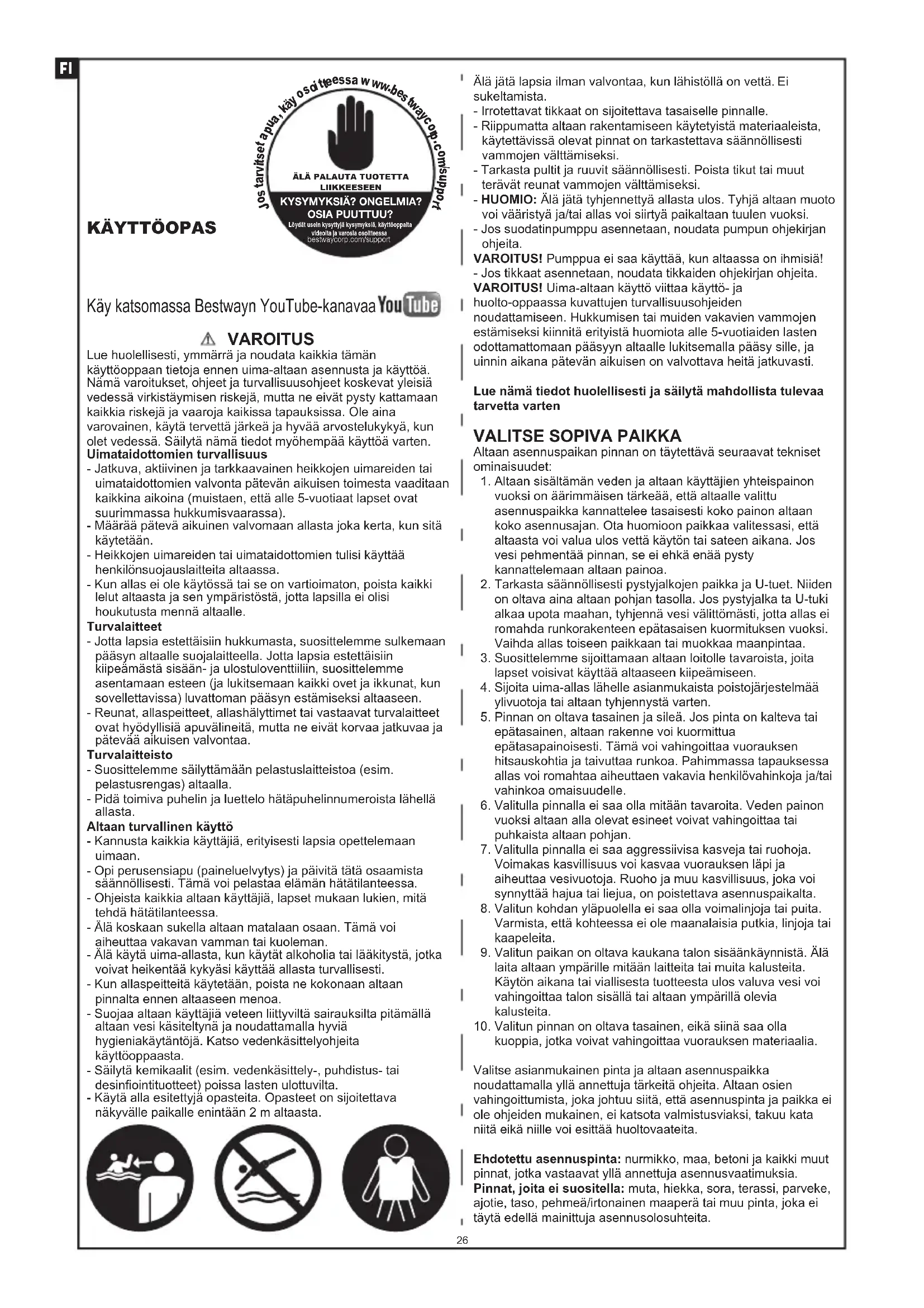 alta tensione o alberi. Assicurarsi che il luogo in questione Käy katsomassa Bestwayn YouTube-kanavaa Älä jätä lapsia ilman valvontaa, kun lähistöllä on vettä. Ei sukeltamista.- Irrotettavat tikkaat on sijoitettava tasaiselle pinnalle.- Riippumatta altaan rakentamiseen käytetyistä materiaaleista, käytettävissä olevat pinnat on tarkastettava säännöllisesti vammojen välttämiseksi.- Tarkasta pultit ja ruuvit säännöllisesti. Poista tikut tai muut terävät reunat vammojen välttämiseksi.- HUOMIO: Älä jätä tyhjennettyä allasta ulos. Tyhjä altaan muoto voi vääristyä ja/tai allas voi siirtyä paikaltaan tuulen vuoksi.- Jos suodatinpumppu asennetaan, noudata pumpun ohjekirjan ohjeita.VAROITUS! Pumppua ei saa käyttää, kun altaassa on ihmisiä!- Jos tikkaat asennetaan, noudata tikkaiden ohjekirjan ohjeita.VAROITUS! Uima-altaan käyttö viittaa käyttö- ja huolto-oppaassa kuvattujen turvallisuusohjeiden noudattamiseen. Hukkumisen tai muiden vakavien vammojen estämiseksi kiinnitä erityistä huomiota alle 5-vuotiaiden lasten odottamattomaan pääsyyn altaalle lukitsemalla pääsy sille, ja uinnin aikana pätevän aikuisen on valvottava heitä jatkuvasti.Lue nämä tiedot huolellisesti ja säilytä mahdollista tulevaa tarvetta varten ÄLÄ PALAUTA TUOTETTALIIKKEESEENKYSYMYKSIÄ? ONGELMIA?OSIA PUUTTUU?Löydät usein kysyttyjä kysymyksiä, käyttöoppaitavideoita ja varosia osoitteessa bestwaycorp.com/support