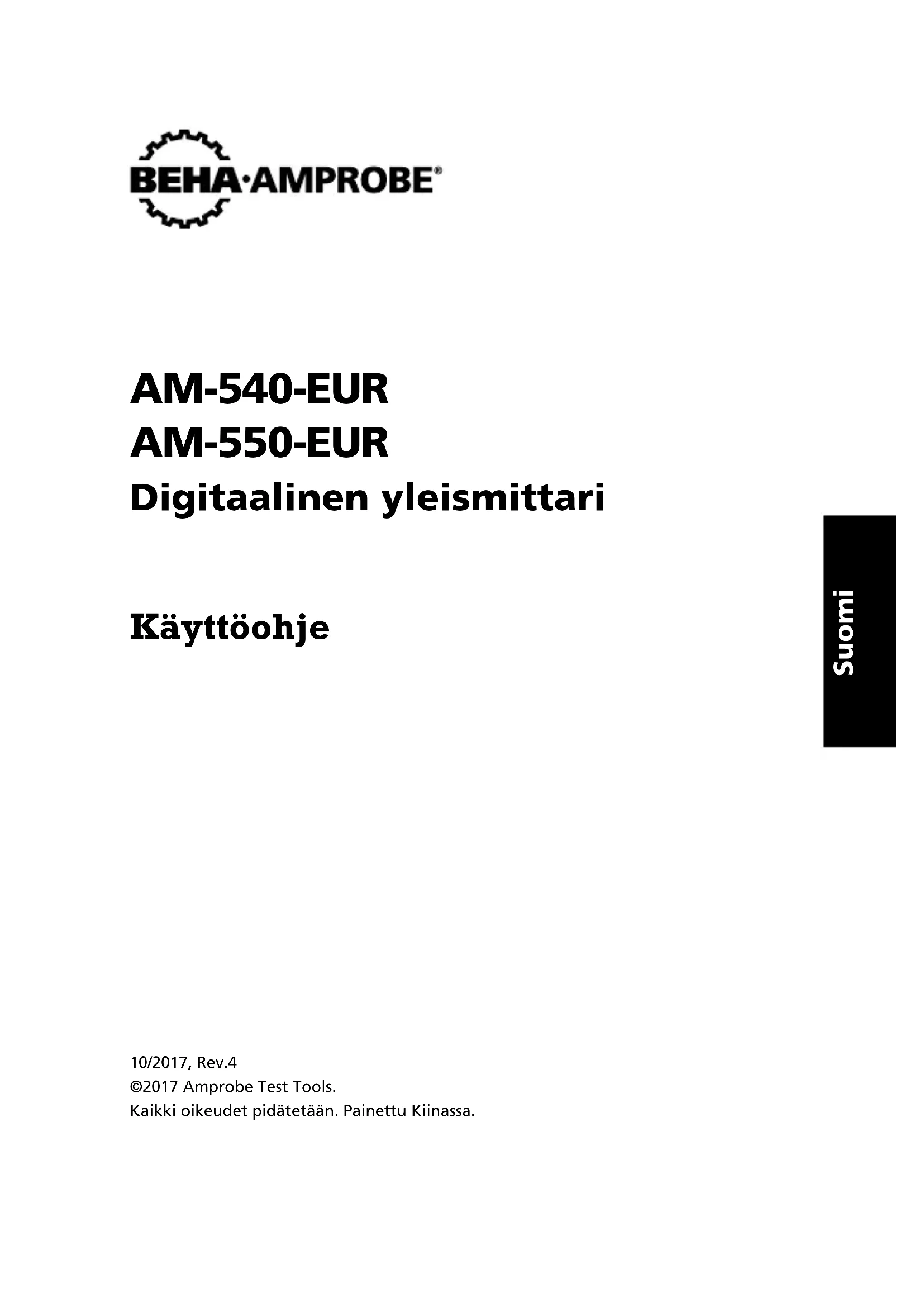 9V battery F2Suomi AM-540-EUR AM-550-EUR Digitaalinen yleismittari Käyttöohje 10/2017, Rev.4 ©2017 Amprobe Test Tools. Kaikki oikeudet pidätetään. Painettu Kiinassa.Rajoitettu takuu ja rajoitettu vastuu Tämän Amprobe-tuotteen taataan olevan vapaa raaka-aine ja valmistusvioista normaalisti käytettynä ja huollettuna. Amprobe AM-540-EUR:n ja AM-550-EUR:n takuu on yksi vuosi ja se alkaa ostopäivästä. Takuu ei koske sulakkeita, vaihdettavia paristoja tai mitään vikaa, joka on aiheutettu kun mittaria on käytetty väärin, muutettu, käsitelty huolimattomasti tai vioitettu tahallisesti tai epänormaalilla käytöllä/käsittelyllä. Jälleenmyyjillä ei ole oikeutta antaa laajempaa tai erilaista takuuta Amproben puolesta. Saadaksesi takuupalvelua, palauta tuote (ostokuitin kopion kera) lähimmälle Amprobe-jälleenmyyjälle. Katso tarkemmat tiedot kohdasta ”Huolto”. TÄMÄ TAKUU ON OSTAJAN AINOA JA YKSINOMAINEN KEINO JA SE KORVAA KAIKKI MUUT SUORAT TAI EPÄSUORAT TAKUUT. NIIHIN KUULUU, MUTTA EI RAJOITU, MIKÄ TAHANSA EPÄSUORA TAKUU KAUPATTAVUUDESTA TAI SOPIVUUDESTA TIETTYYN TARKOITUKSEEN. VALMISTAJA EI OLE KORVAUSVELVOLLINEN MISTÄÄN ERITYISISTÄ, EPÄSUORISTA, SATUNNAISISTA TAI SEURAAMUKSELLISISTA VAHINGOISTA TAI TAPPIOISTA, MUKAAN LUKIEN TIETOJEN KATOAMINEN, RIIPPUMATTA SIITÄ MISTÄ TAHANSA TEORIASTA NE JOHTUVAT. Jotkut valtiot eivät salli epäsuoran takuun rajoittamista tai seuraamuksellisten vahinkojen poissulkemista tai rajoittamista. Siksi tämän takuun rajoitukset ja poissulkemiset eivät ehkä koske kaikkia ostajia. Jos toimivaltainen tuomioistuin katsoo tämän takuun jonkin ehdon pätemättömäksi tai toimeenpanokelvottomaksi, ei sellainen päätös vaikuta minkään muun ehdon lainvoimaisuuteen tai toimeenpantavuuteen. Huolto Kaikissa mittalaitteissa jotka palautetaan jälleenmyyjälle takuuaikana tai sen jälkeen, tulee olla mukana seuraavat tiedot: Sinun nimesi, yrityksen nimi, osoite, puhelinnumero ja kopio ostokuitista. Lisää mukaan vielä vikakuvaus ongelmasta. Lähetä mittari Amprobe- jälleenmyyjällesi toimituskulut maksettuina (FOB määräasemalla). Valmistaja ei vastaa rikkoontumisvaarasta kuljetuksen aikana. Takuun alainen huolto Lue takuuohjeet ja tarkista paristo ennen mittalaitteen lähettämistä. Takuuaikana laite voidaan palauttaa Amprobe-jälleenmyyjälle vaihtoa varten. Huolto takuuajan umpeuduttua TOta yhteyttä Amprobe-jälleenmyyjään saadaksesi edullinen tarjous uudesta mittalaitteesta. Yhdysvallat: Kanada: Amprobe Amprobe Everett, WA 98203 Mississauga, ON L4Z 1X9 Puh: 877-AMPROBE (267-7623) Puh: 905-890-7600 Takuun piiriin kuulumattomat korjaukset ja vaihto - Eurooppa Takuun piiriin kuulumattomat laitteet voi vaihtaa Euroopassa Amprobe®:n jälleenmyyjällä nimellishintaan. Tarkista "Ostopaikat"-osasta www.amprobe.com-sivustolla lähellä sijaitsevat jakelijat. Postiosoite Euroopassa* Amprobe® Europe Beha-Amprobe GmbH In den Engematten 14 79286 Glottertal, Germany Puh: +49 (0) 7684 8009 - 0 www.amprobe.eu *(Vain kirjeenvaihtoa varten. Älä lähetä korjaus- tai vaihtopyyntöjä tähän osoitteeseen. Eurooppalaisia kuluttajia pyydetään ottamaan yhteyttä jälleenmyyjäänsä.)AM-540-EUR & AM-550-EUR Digitaalinen yleismittari