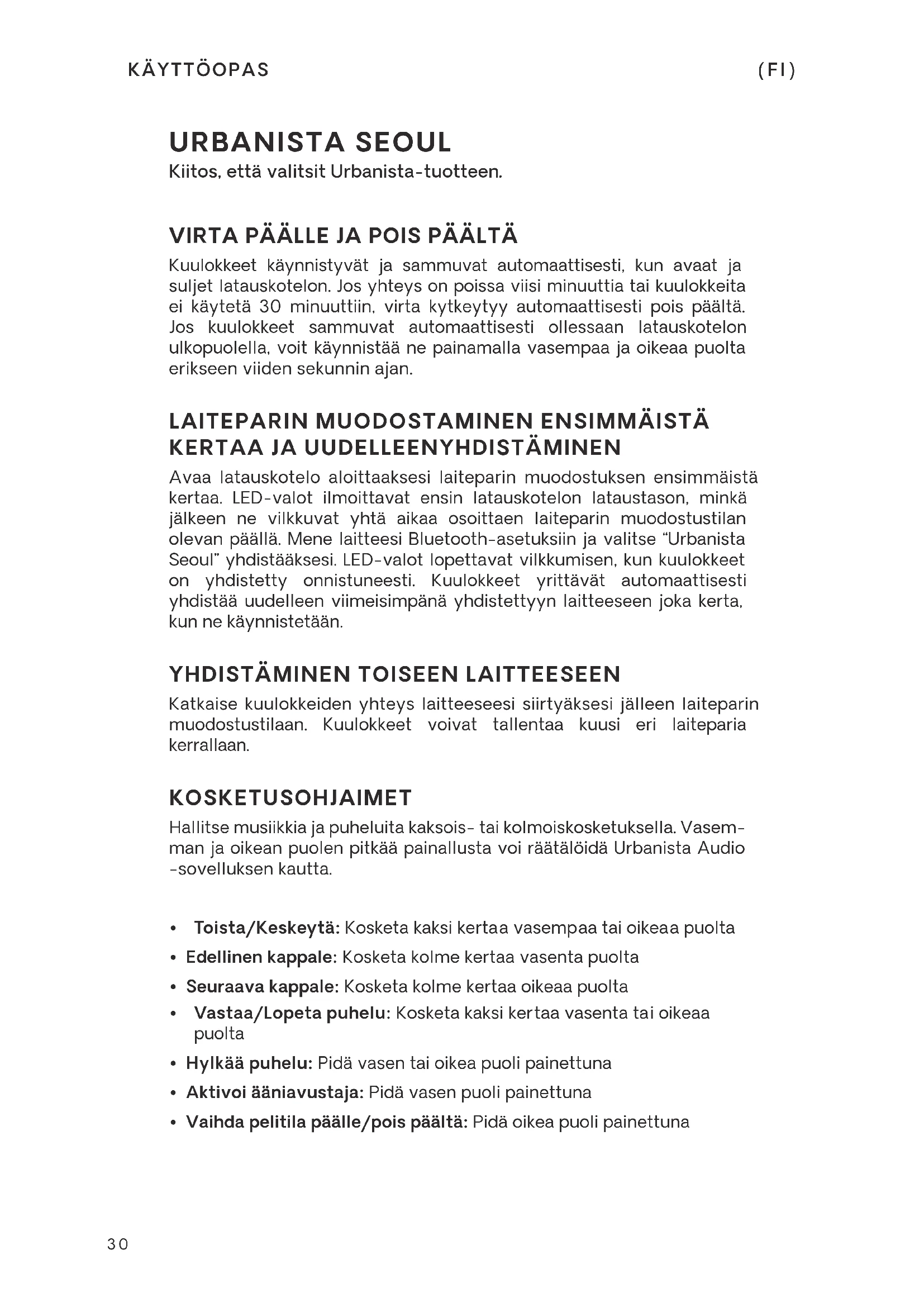 Katkaise kuulokkeiden yhteys laitteeseesi siirtyäksesi jälleen laiteparin muodostustilaan. Kuulokkeet voivat tallentaa kuusi eri laiteparia kerrallaan. KOSKETUSOHJAIMET Hallitse musiikkia ja puheluita kaksois- tai kolmoiskosketuksella. Vasem- man ja oikean puolen pitkää painallusta voi räätälöidä Urbanista Audio -sovelluksen kautta.