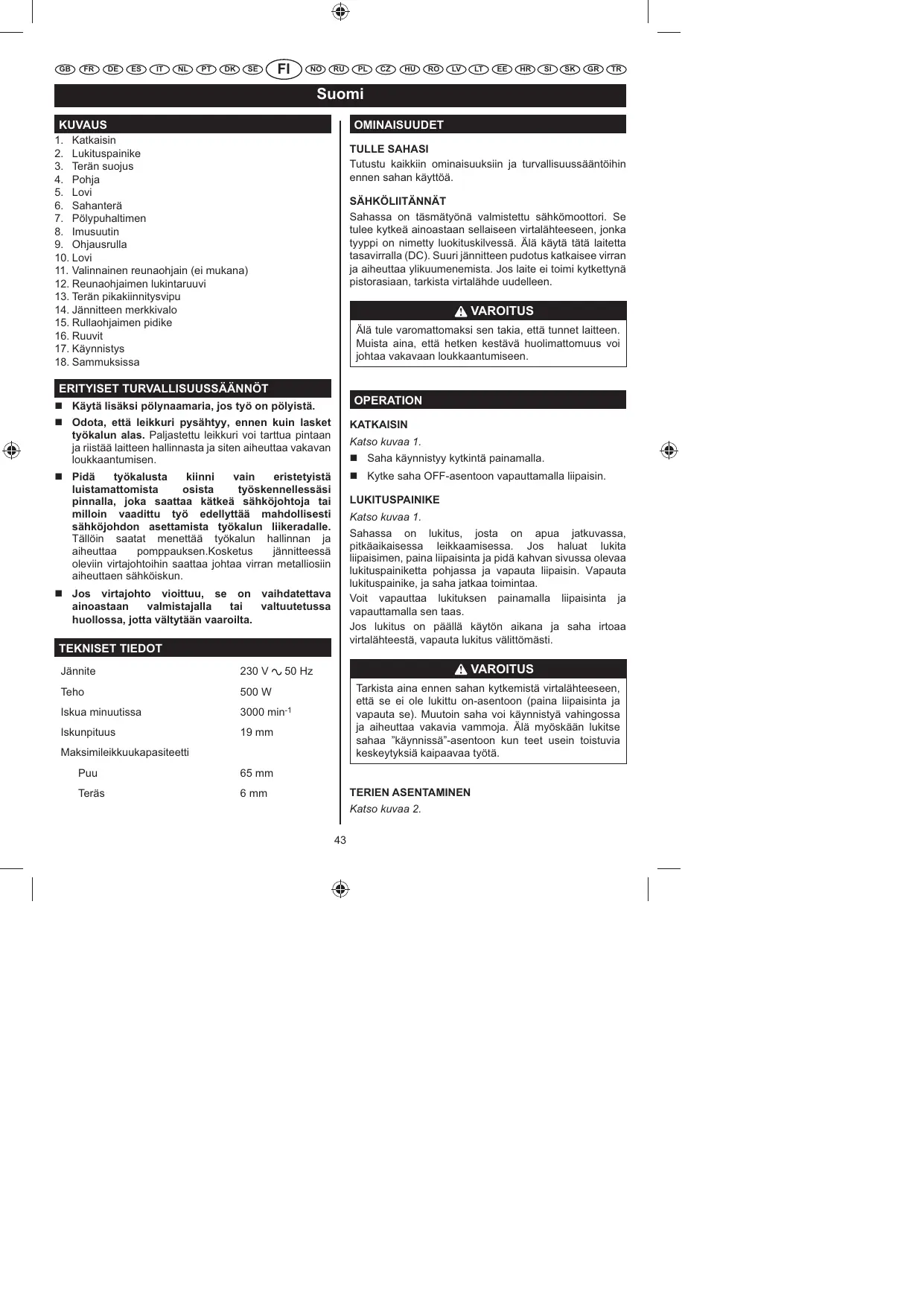 OPERATION Käytä lisäksi pölynaamaria, jos työ on pölyistä. Odota, että leikkuri pysähtyy, ennen kuin lasket työkalun alas. Paljastettu leikkuri voi tarttua pintaan ja riistää laitteen hallinnasta ja siten aiheuttaa vakavan loukkaantumisen. KATKAISIN Pidä työkalusta kiinni vain eristetyistä luistamattomista osista työskennellessäsi pinnalla, joka saattaa kätkeä sähköjohtoja tai milloin vaadittu työ edellyttää mahdollisesti sähköjohdon asettamista työkalun liikeradalle. Tällöin saatat menettää työkalun hallinnan ja aiheuttaa pomppauksen.Kosketus jännitteessä oleviin virtajohtoihin saattaa johtaa virran metalliosiin aiheuttaen sähköiskun. Kytke saha OFF-asentoon vapauttamalla liipaisin. Katso kuvaa 1. Saha käynnistyy kytkintä painamalla. LUKITUSPAINIKE Katso kuvaa 1. Sahassa on lukitus, josta on apua jatkuvassa, pitkäaikaisessa leikkaamisessa. Jos haluat lukita liipaisimen, paina liipaisinta ja pidä kahvan sivussa olevaa lukituspainiketta pohjassa ja vapauta liipaisin. Vapauta lukituspainike, ja saha jatkaa toimintaa. Voit vapauttaa lukituksen painamalla liipaisinta ja vapauttamalla sen taas. Jos lukitus on päällä käytön aikana ja saha irtoaa virtalähteestä, vapauta lukitus välittömästi. Jos virtajohto vioittuu, se on vaihdatettava ainoastaan valmistajalla tai valtuutetussa huollossa, jotta vältytään vaaroilta. TEKNISET TIEDOT Jännite 230 V VAROITUS 50 Hz Teho 500 W Iskua minuutissa 3000 min-1 Iskunpituus 19 mm Tarkista aina ennen sahan kytkemistä virtalähteeseen, että se ei ole lukittu on-asentoon (paina liipaisinta ja vapauta se). Muutoin saha voi käynnistyä vahingossa ja aiheuttaa vakavia vammoja. Älä myöskään lukitse sahaa ”käynnissä”-asentoon kun teet usein toistuvia keskeytyksiä kaipaavaa työtä. Maksimileikkuukapasiteetti Puu 65 mm Teräs 6 mm TERIEN ASENTAMINEN Katso kuvaa 2.